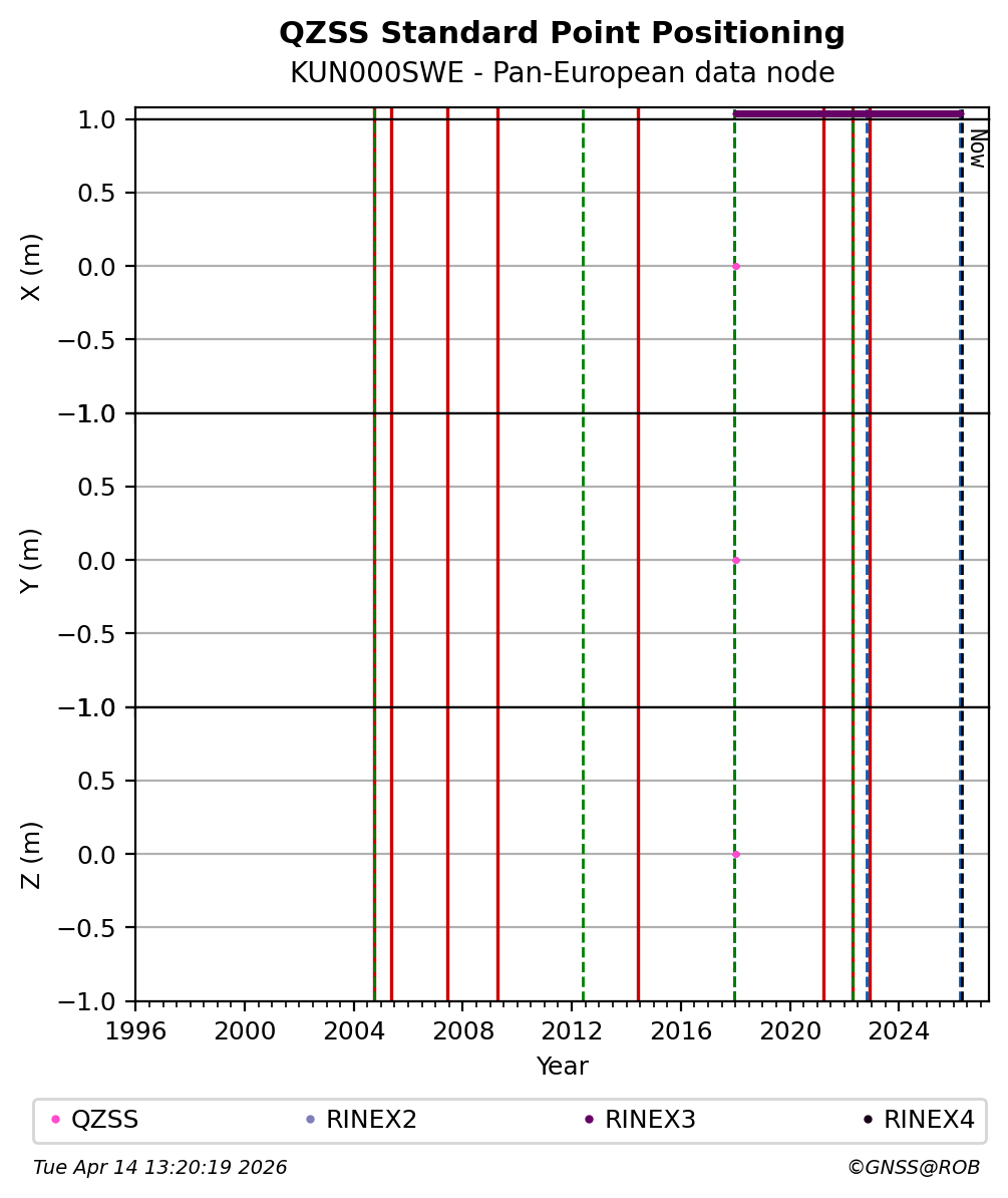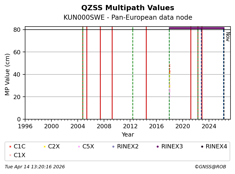 Red vertical lines, green and blue vertical dotted lines indicate respectively a change of antenna, receiver or receiver configuration (including firmware) as indicated by the station manager in the station site log available from the M3G GNSS Metadata Catalog. The purple points in the top of the plot indicate the daily RINEX data availability at the data node.