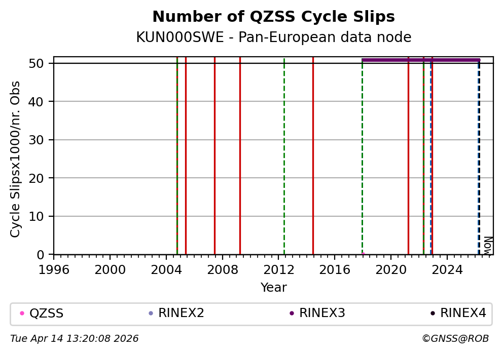 These plots display the number of identified phase cycle slips for each constellation tracked by the station.