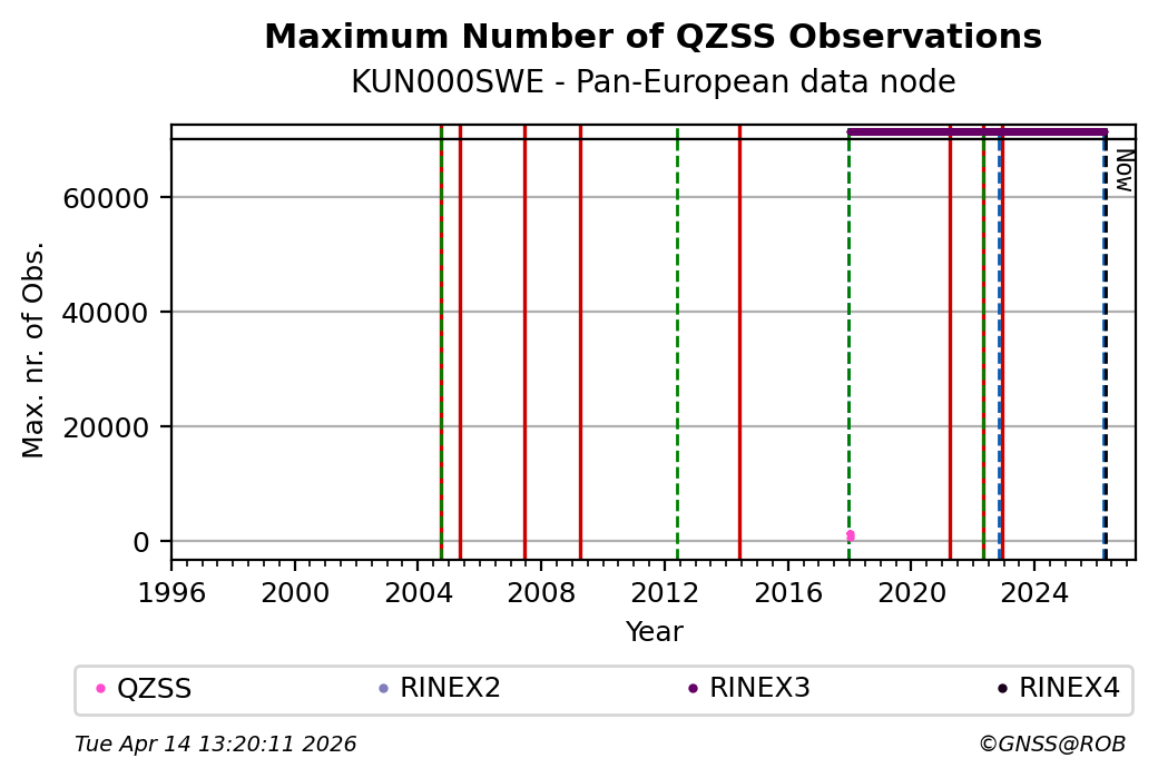 The plots below present the long-term tracking performance of the EPOS-GNSS station KUN000SWE based on the daily RINEX data available from the Pan-European EPOS-GNSS data node. The data quality metrics have been computed at the data node using the G-Nut/Anubis software.