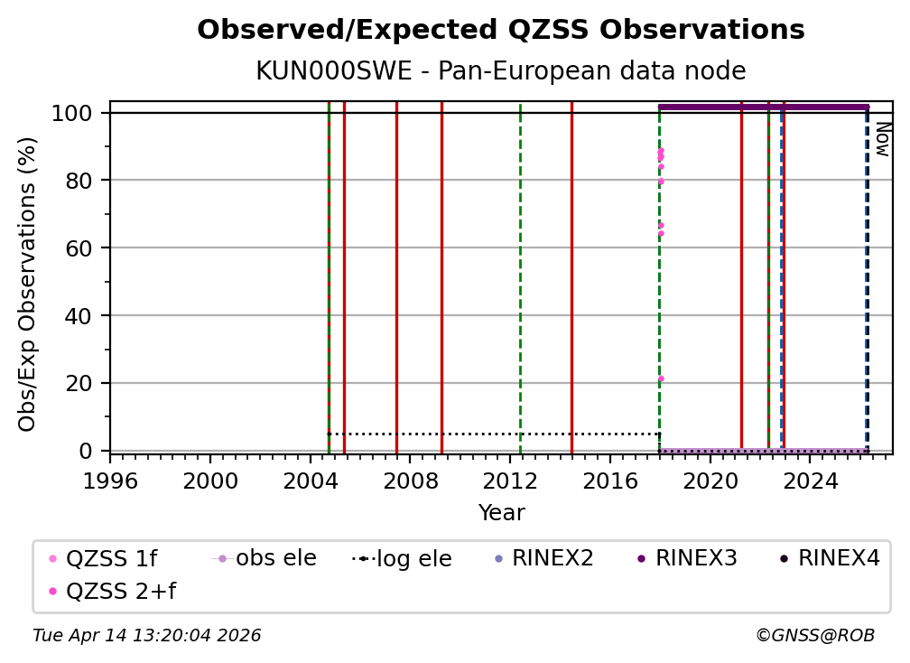 The percentage corresponds, for each constellation tracked by the station, to the ratio of the number of observations in the daily RINEX file with respect to the number of expected observations: