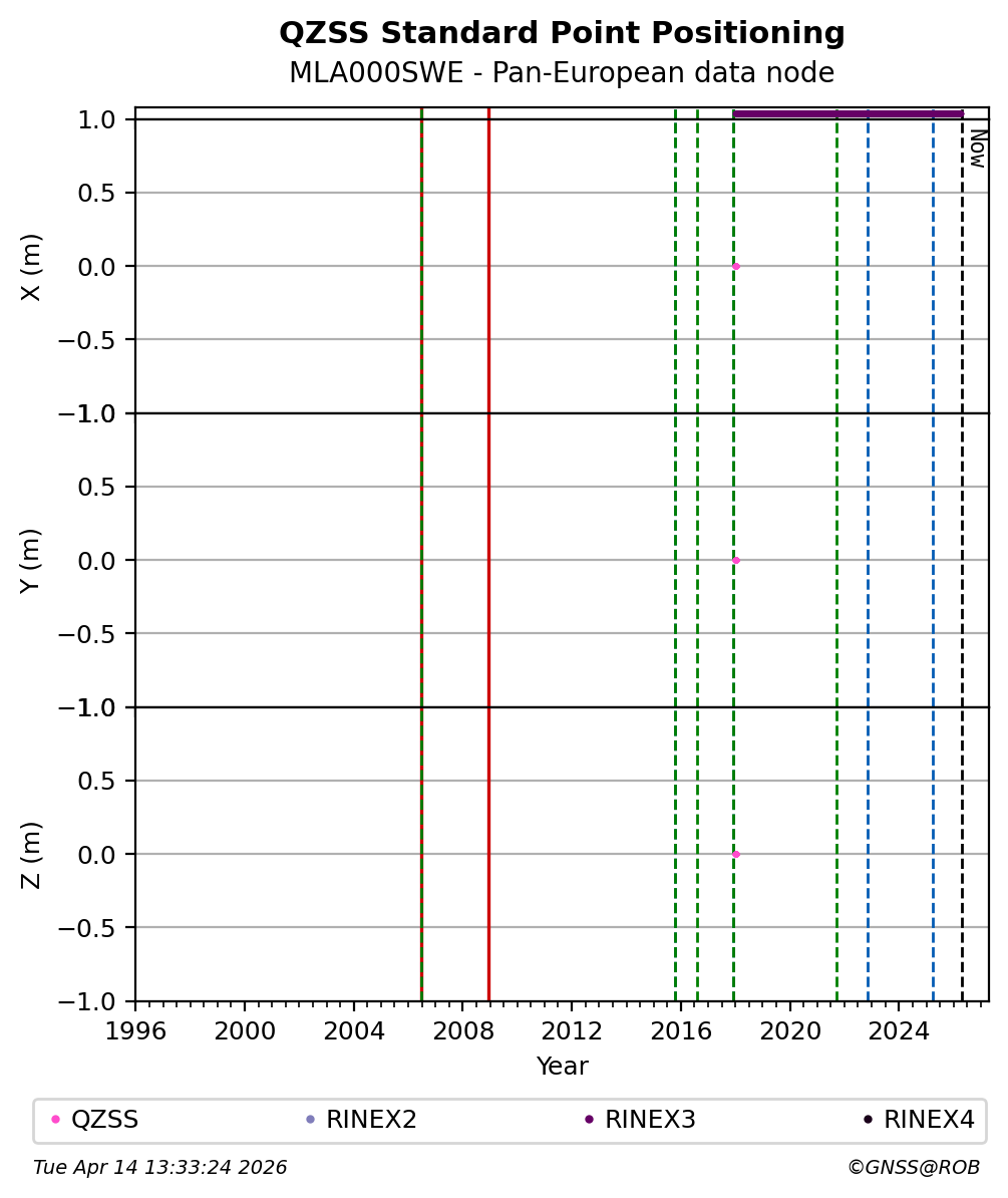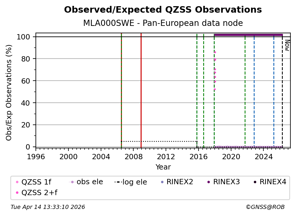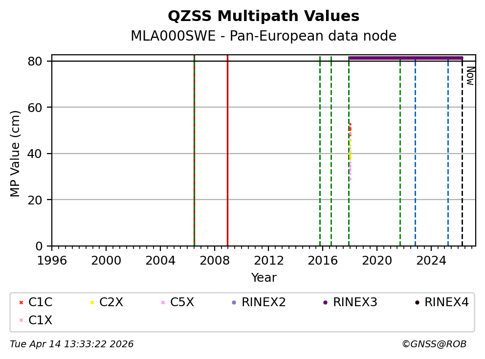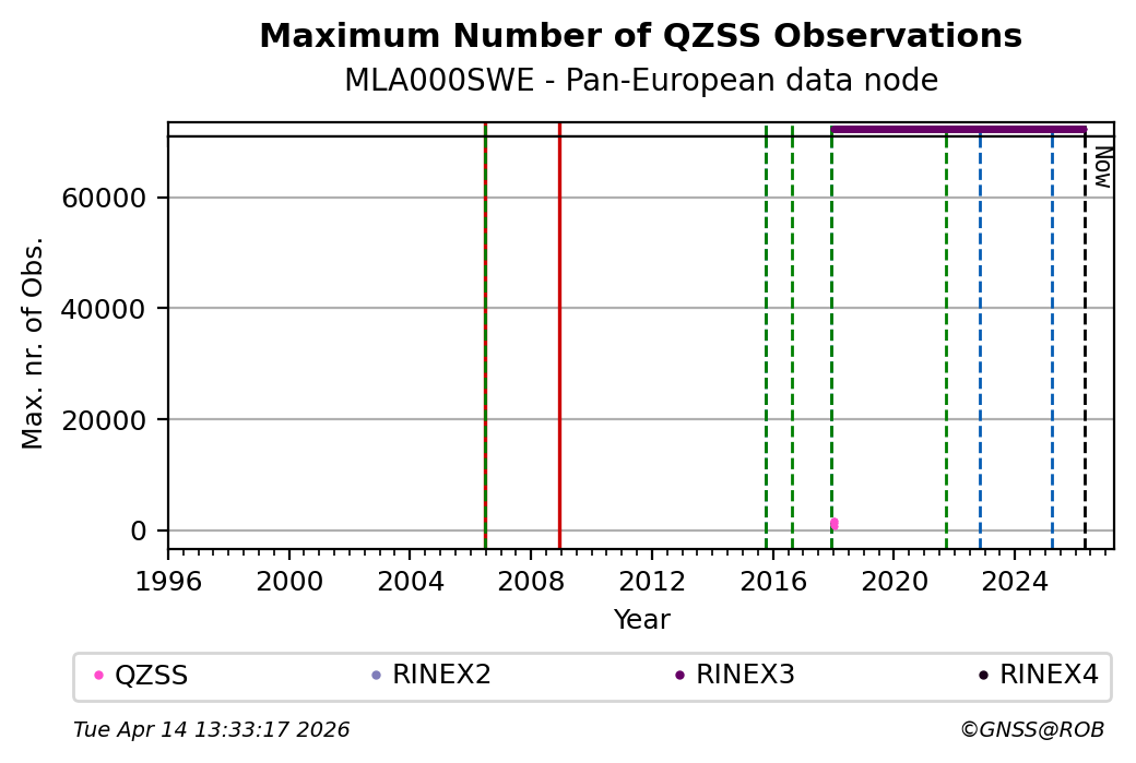The plots below present the long-term tracking performance of the EPOS-GNSS station MLA000SWE based on the daily RINEX data available from the Pan-European EPOS-GNSS data node. The data quality metrics have been computed at the data node using the G-Nut/Anubis software.