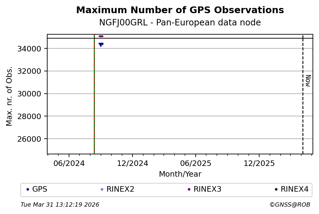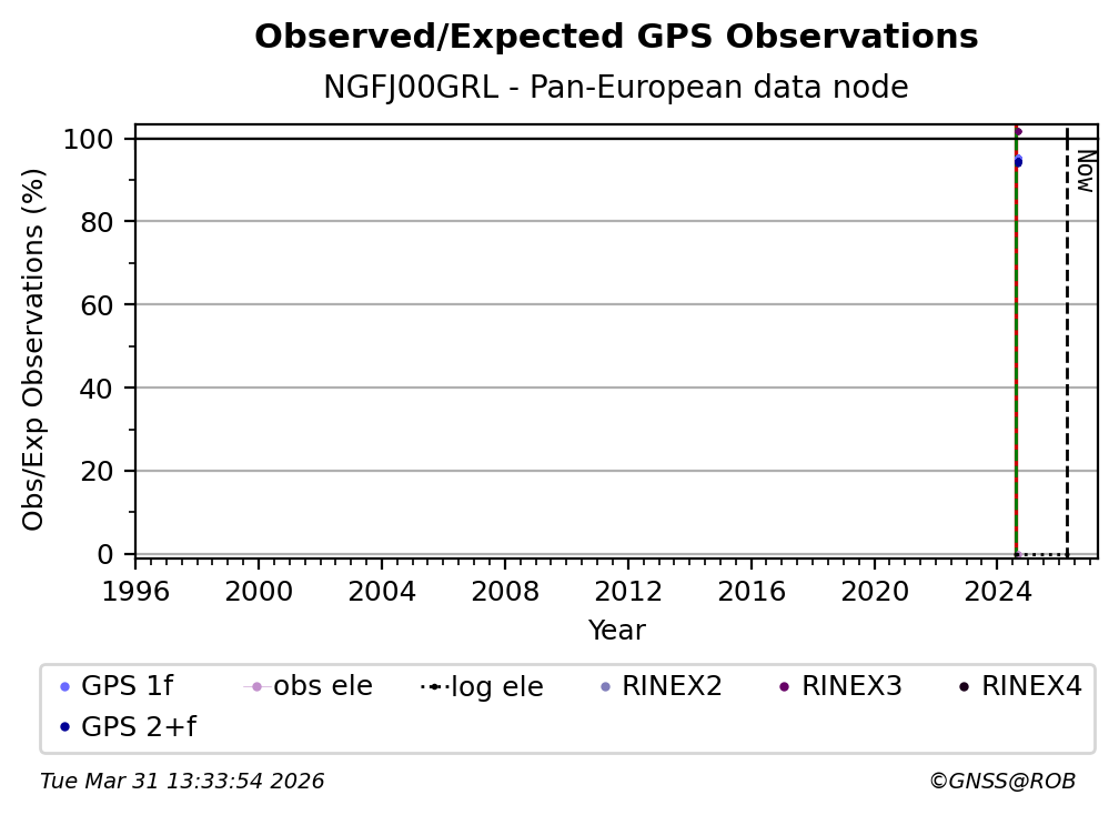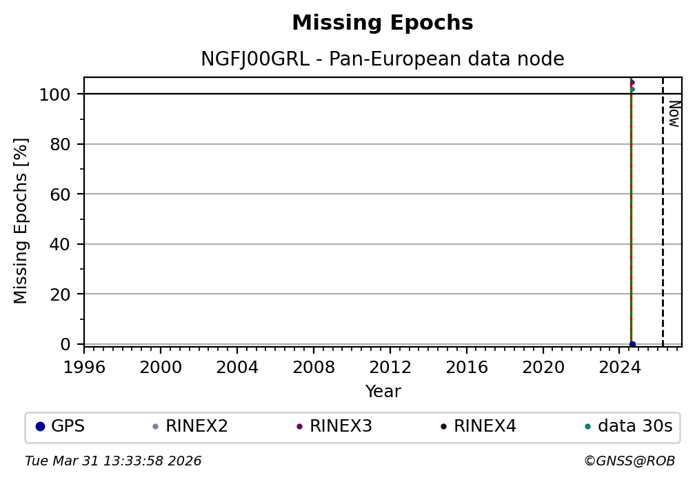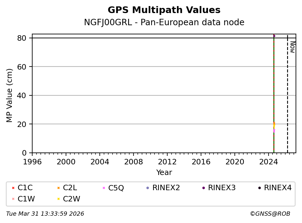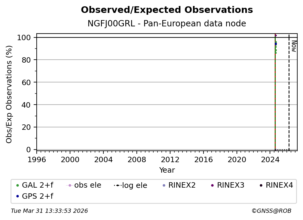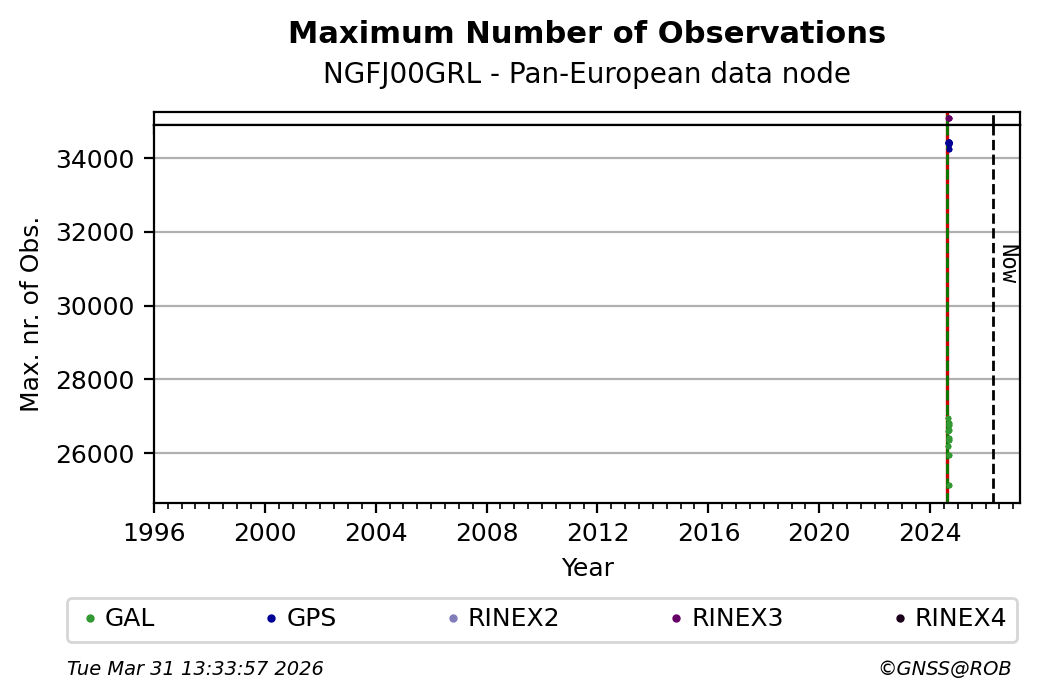 The plots below present the long-term tracking performance of the EPOS-GNSS station NGFJ00GRL based on the daily RINEX data available from the Pan-European EPOS-GNSS data node. The data quality metrics have been computed at the data node using the G-Nut/Anubis software.