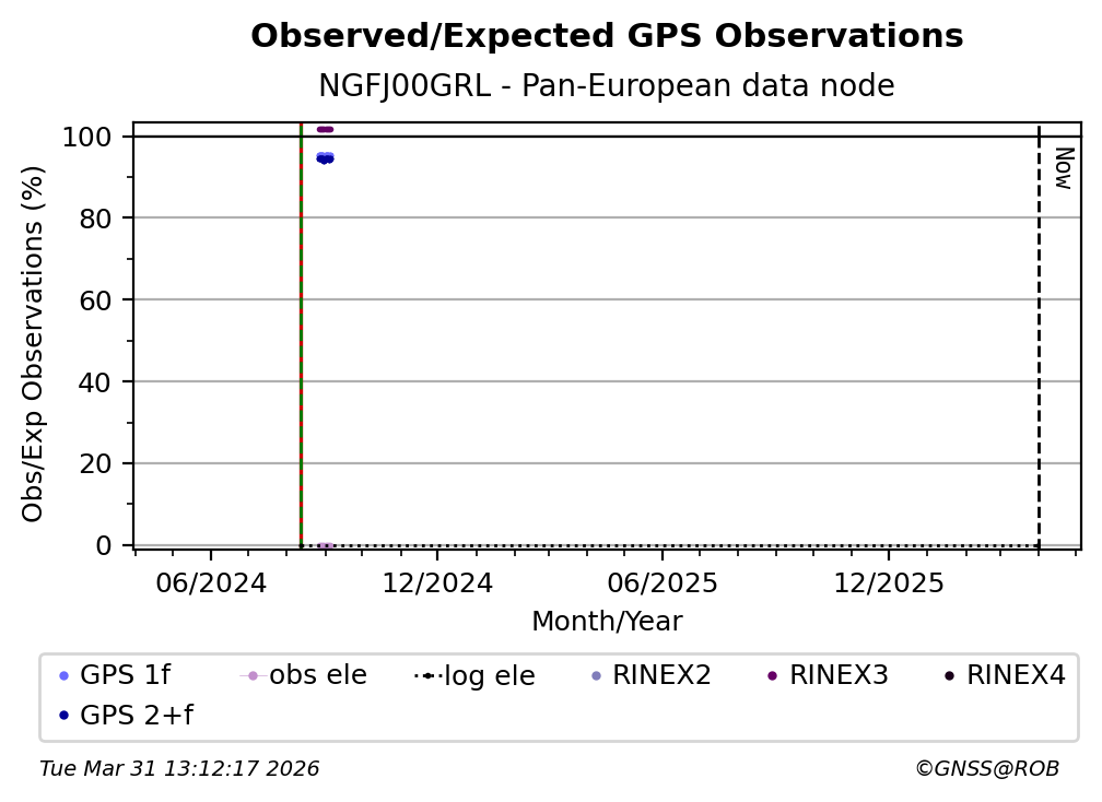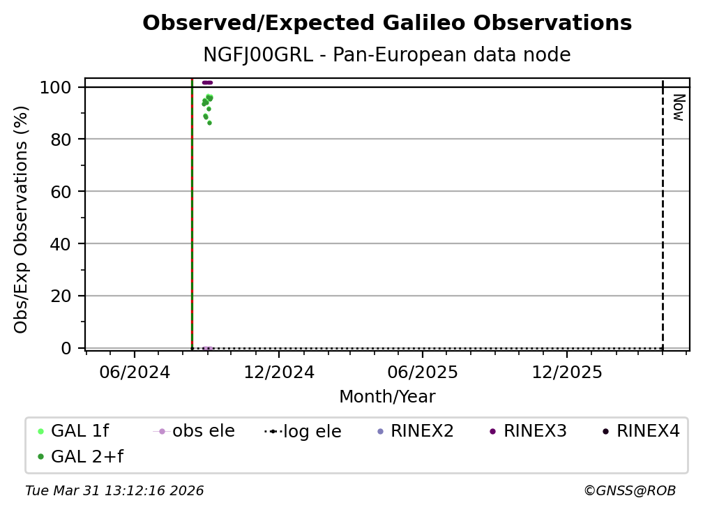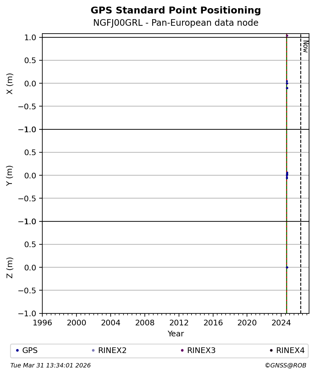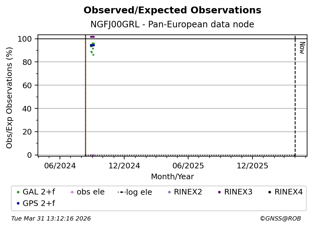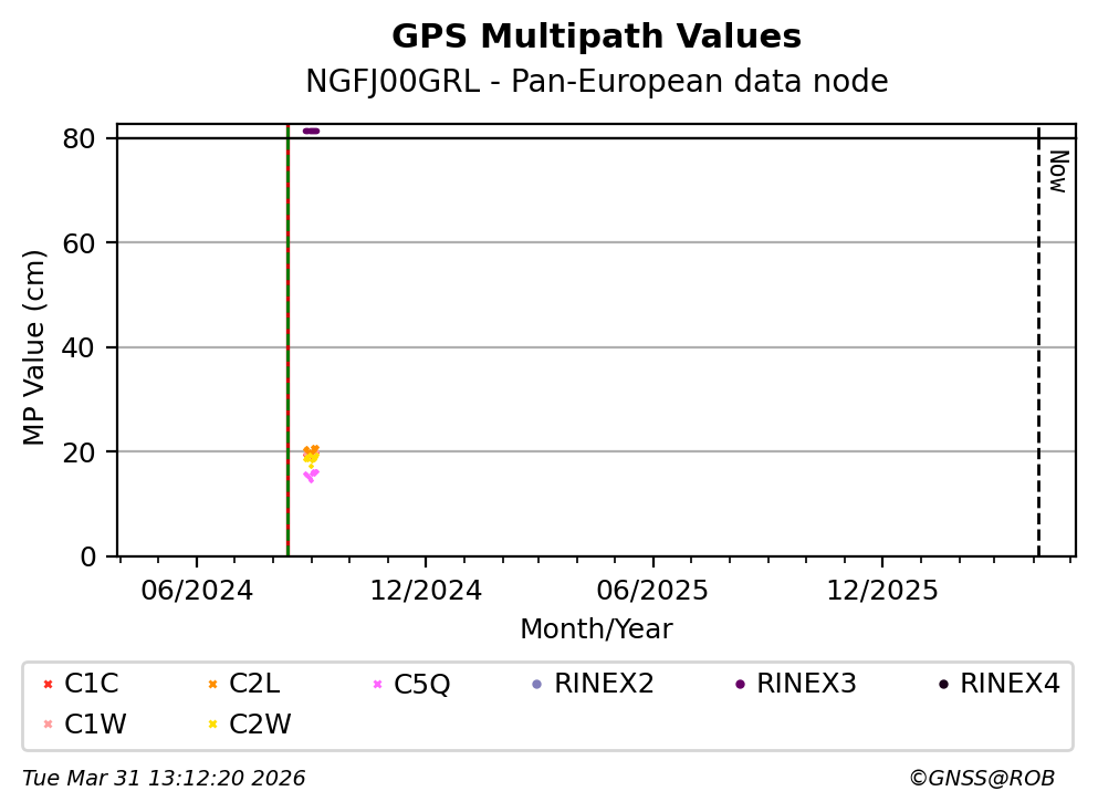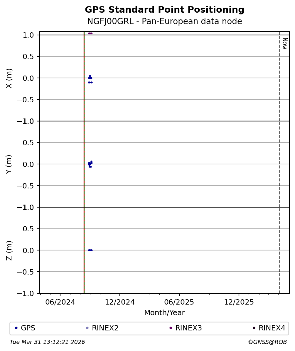 The plots below present the long-term tracking performance of the EPOS-GNSS station NGFJ00GRL based on the daily RINEX data available from the Pan-European EPOS-GNSS data node. The data quality metrics have been computed at the data node using the G-Nut/Anubis software.