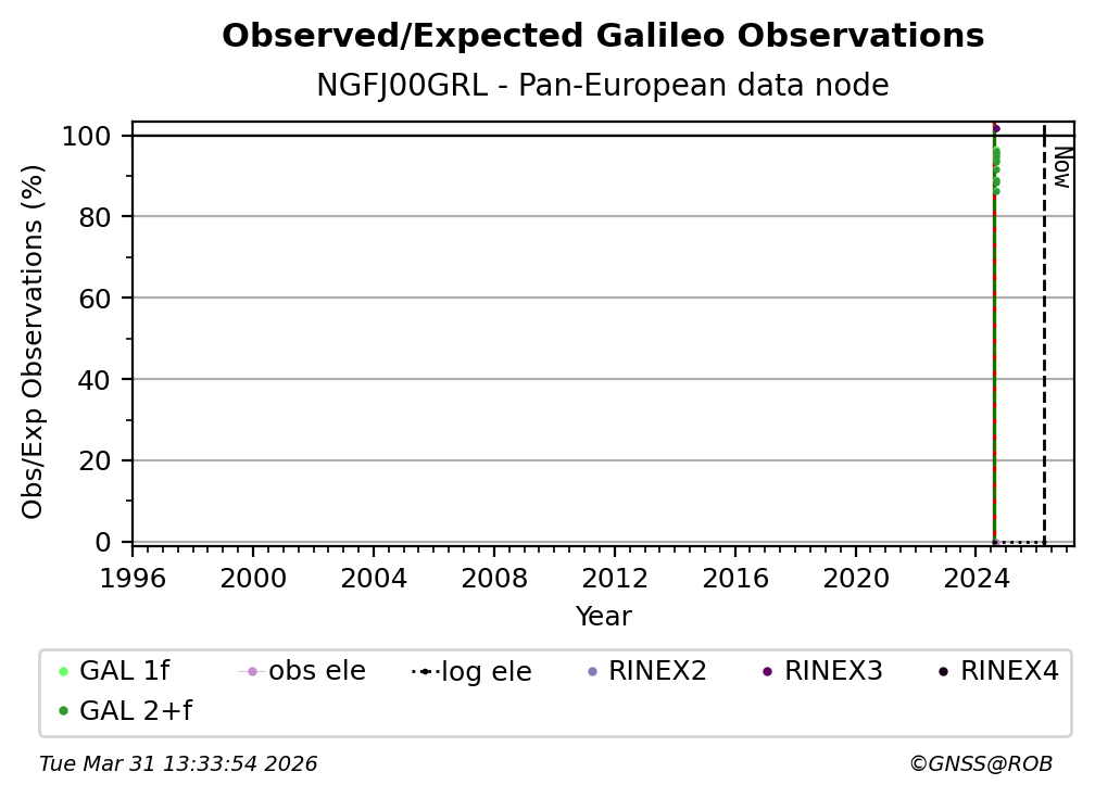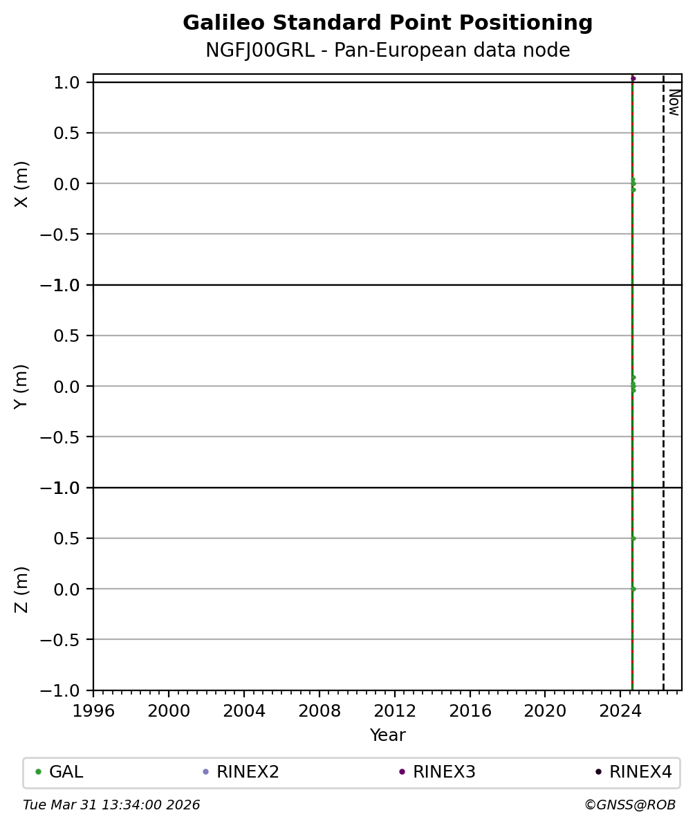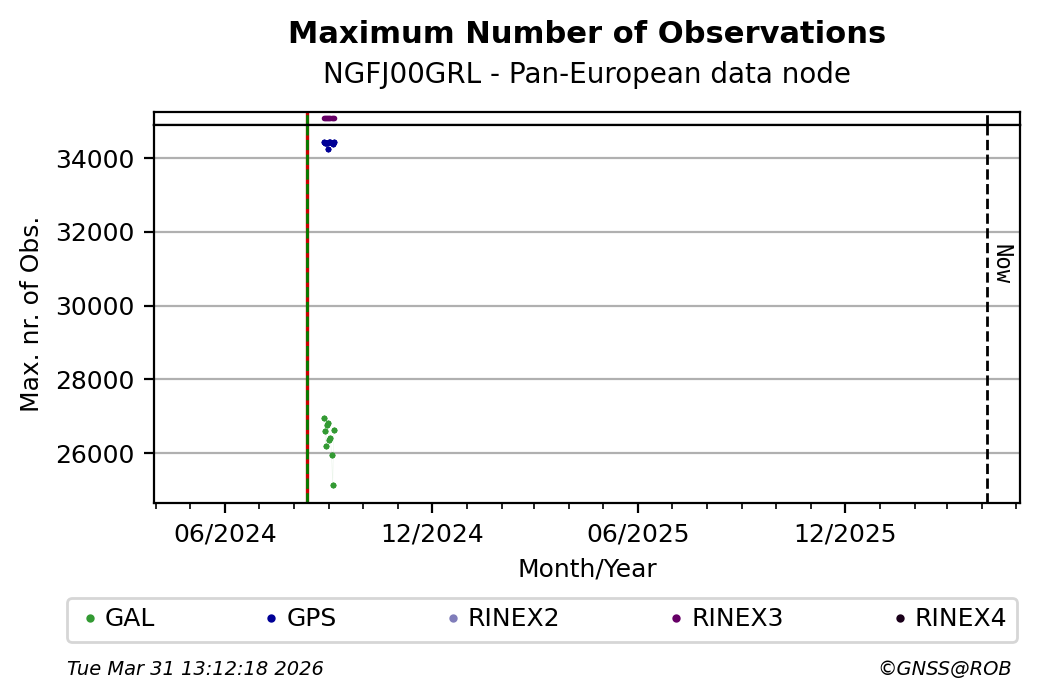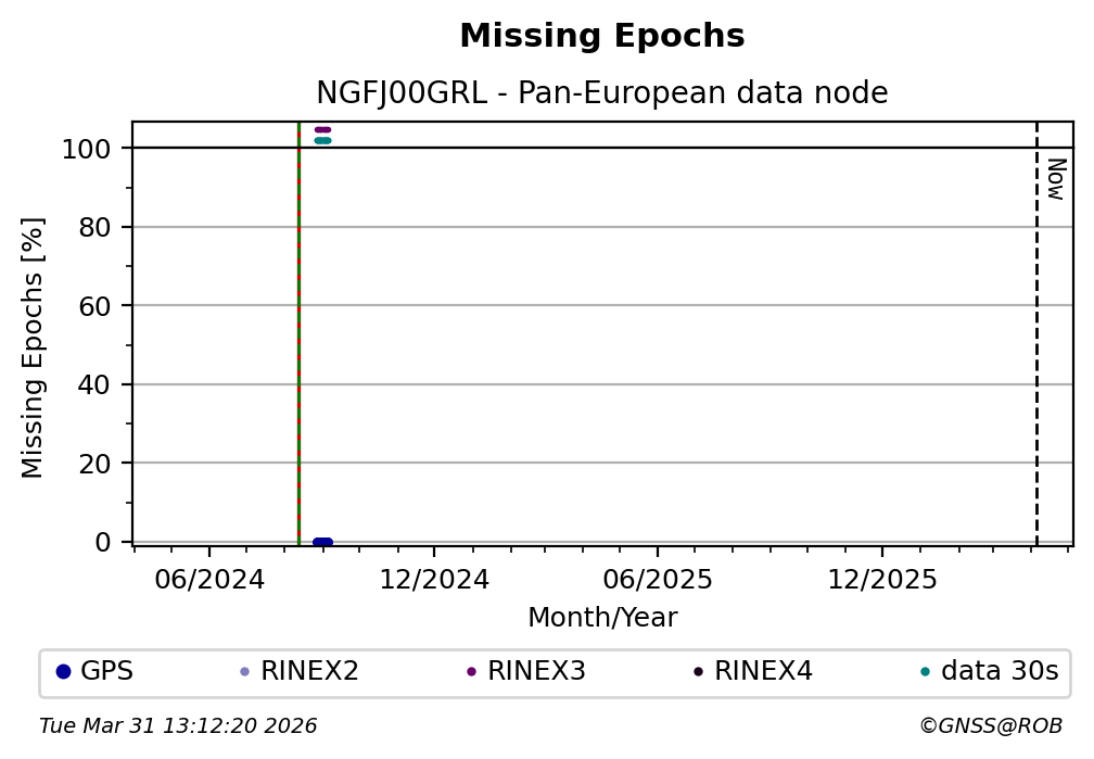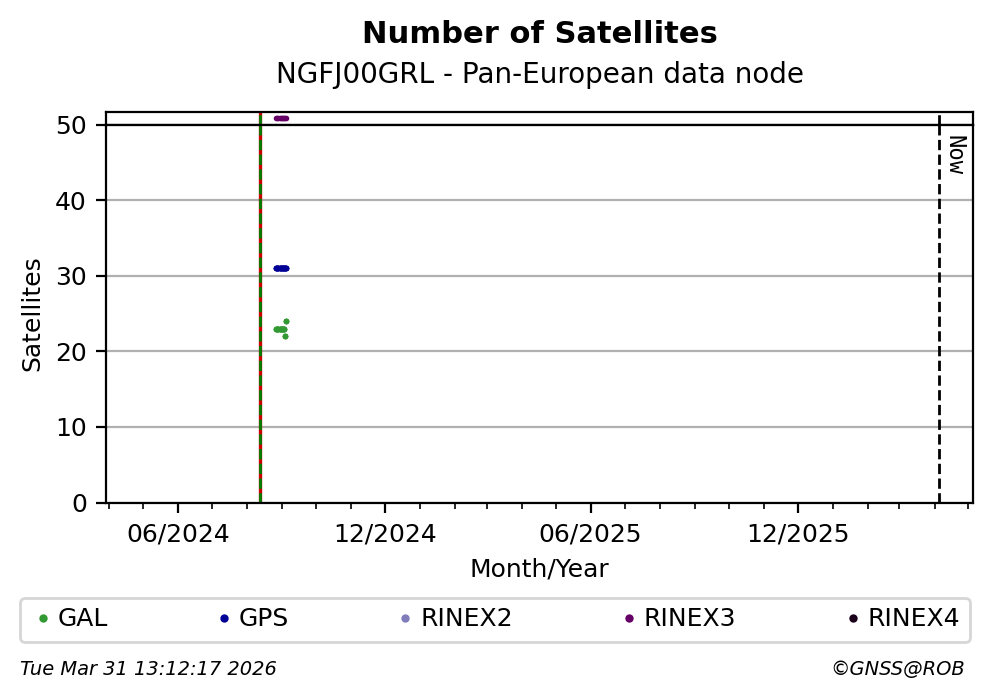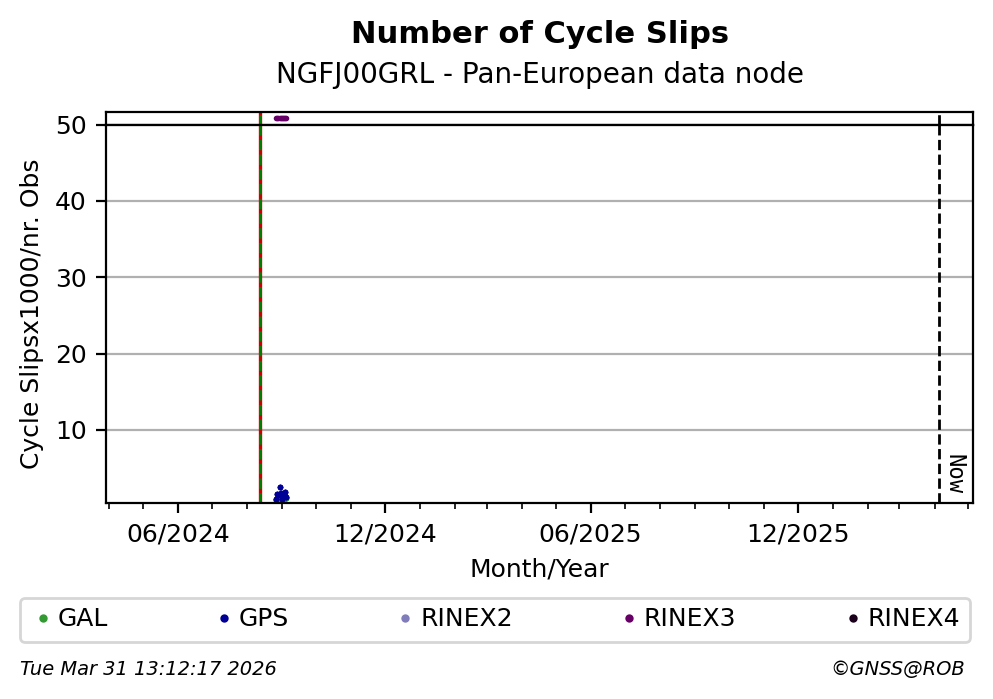 The plots below present the long-term tracking performance of the EPOS-GNSS station NGFJ00GRL based on the daily RINEX data available from the Pan-European EPOS-GNSS data node. The data quality metrics have been computed at the data node using the G-Nut/Anubis software.