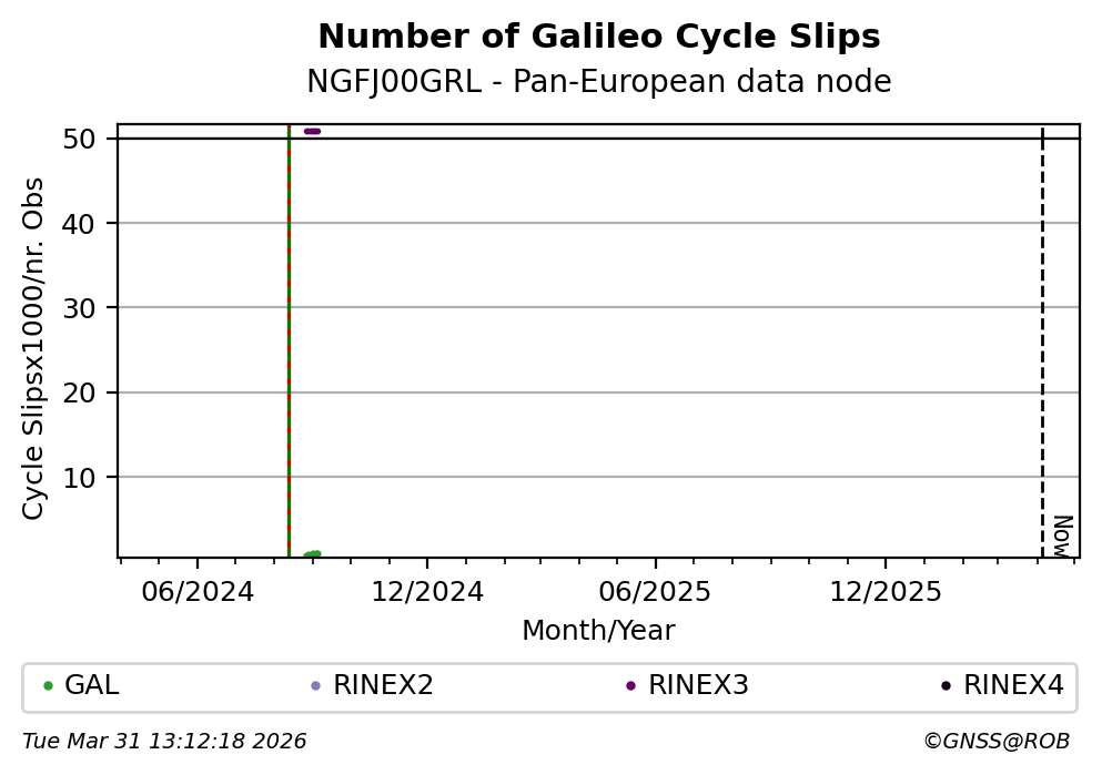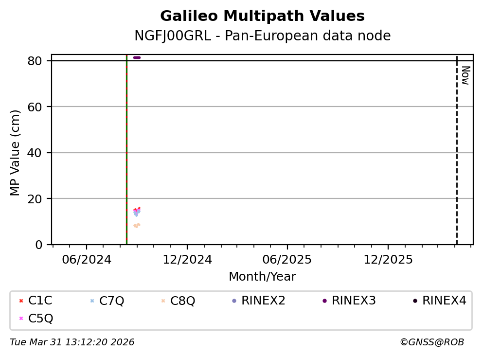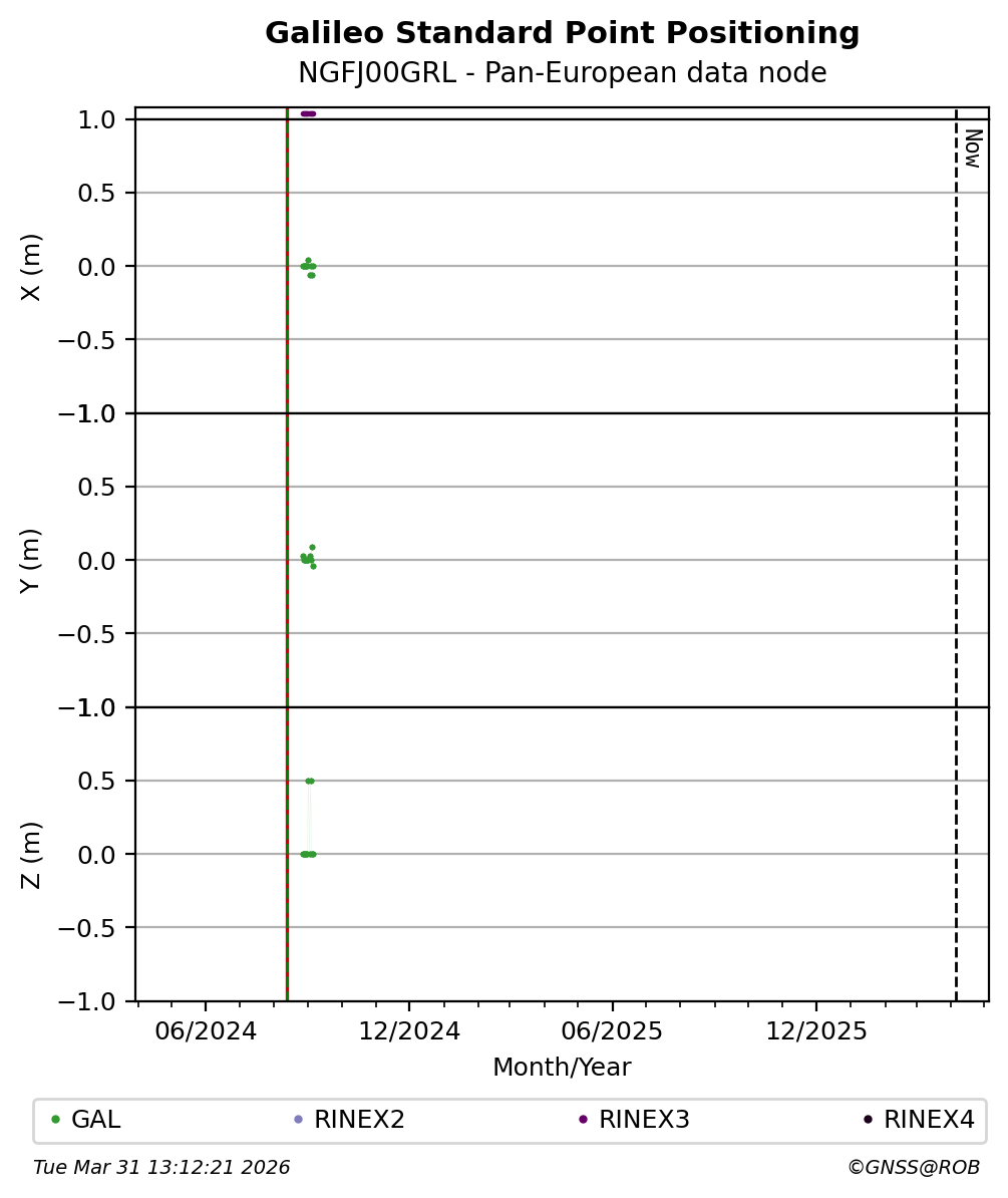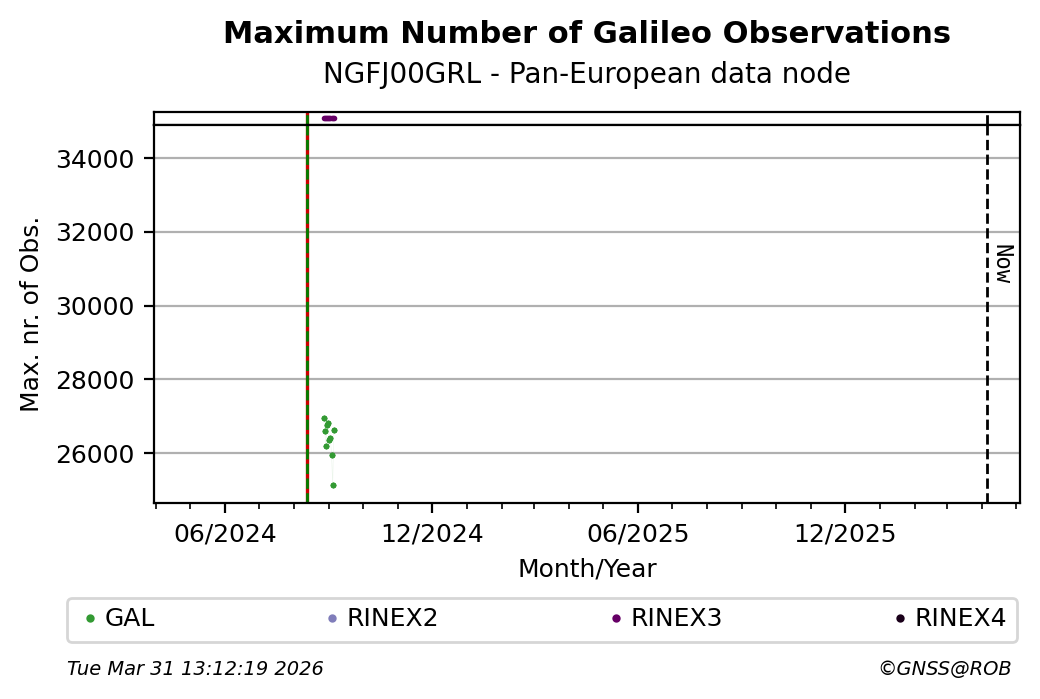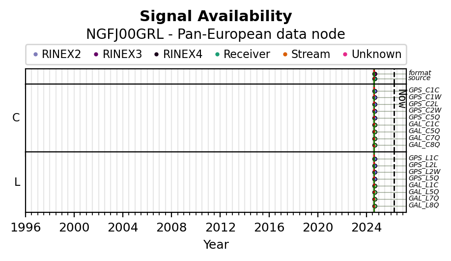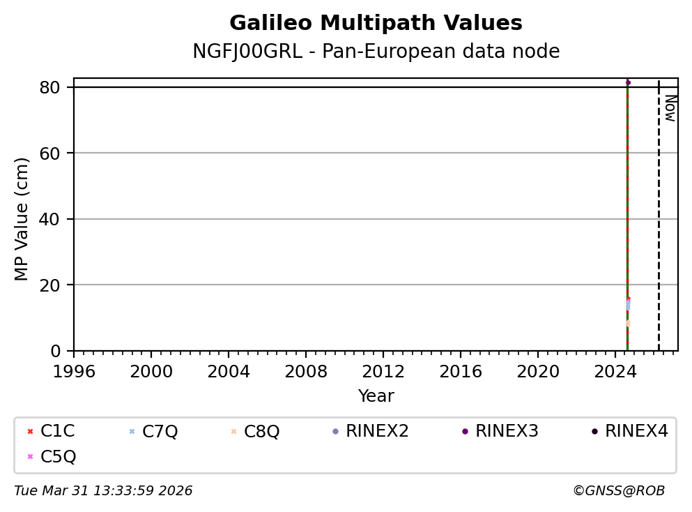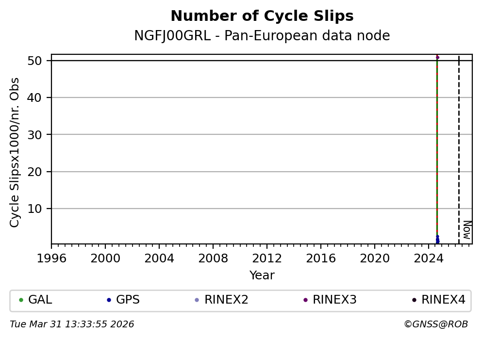 The plots below present the long-term tracking performance of the EPOS-GNSS station NGFJ00GRL based on the daily RINEX data available from the Pan-European EPOS-GNSS data node. The data quality metrics have been computed at the data node using the G-Nut/Anubis software.