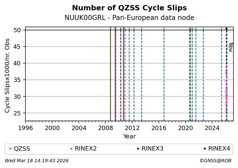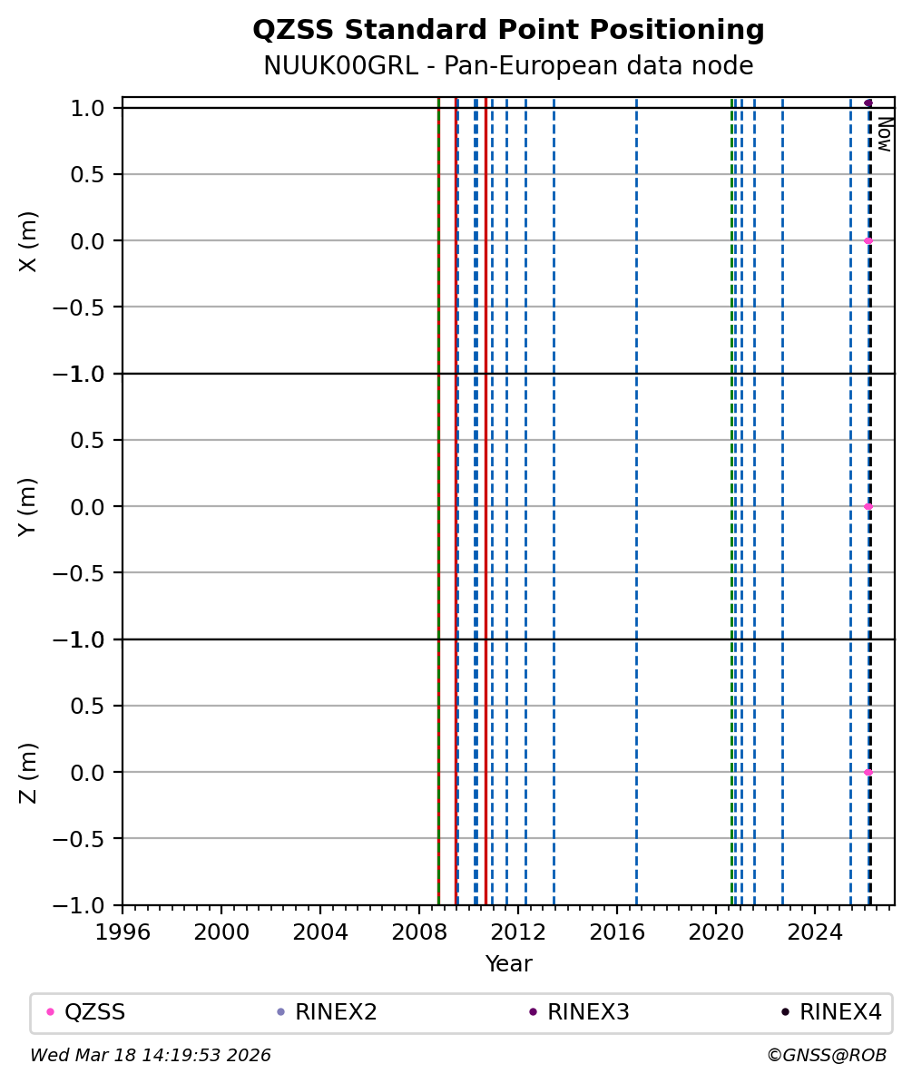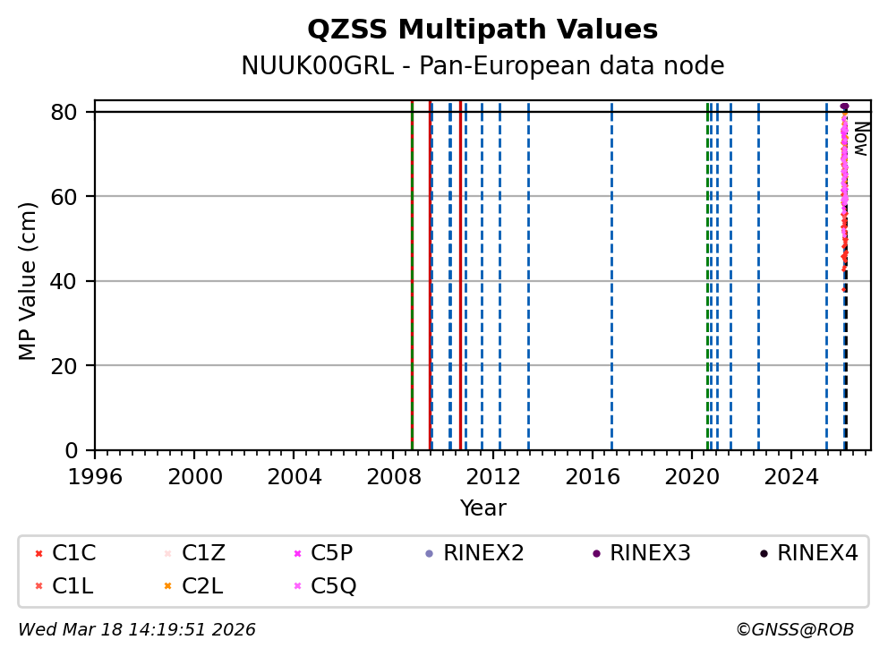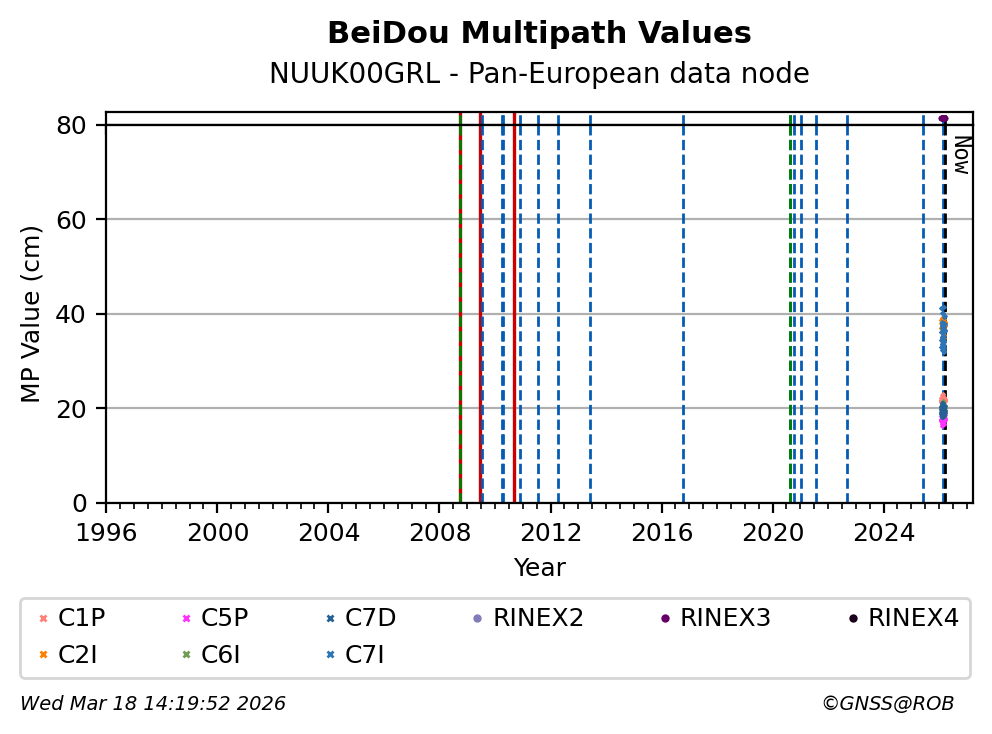 Red vertical lines, green and blue vertical dotted lines indicate respectively a change of antenna, receiver or receiver configuration (including firmware) as indicated by the station manager in the station site log available from the M3G GNSS Metadata Catalog. The purple points in the top of the plot indicate the daily RINEX data availability at the data node.
