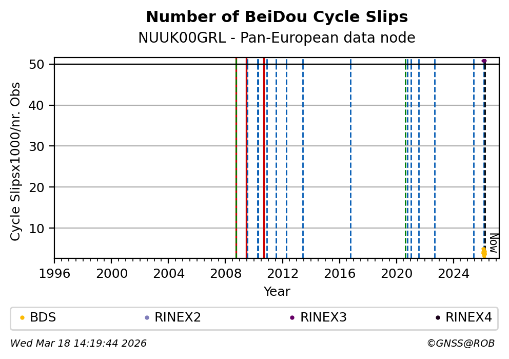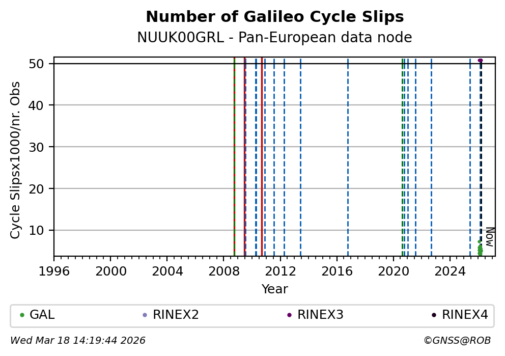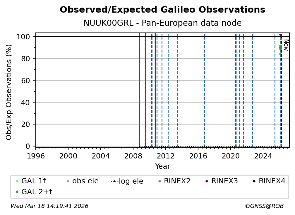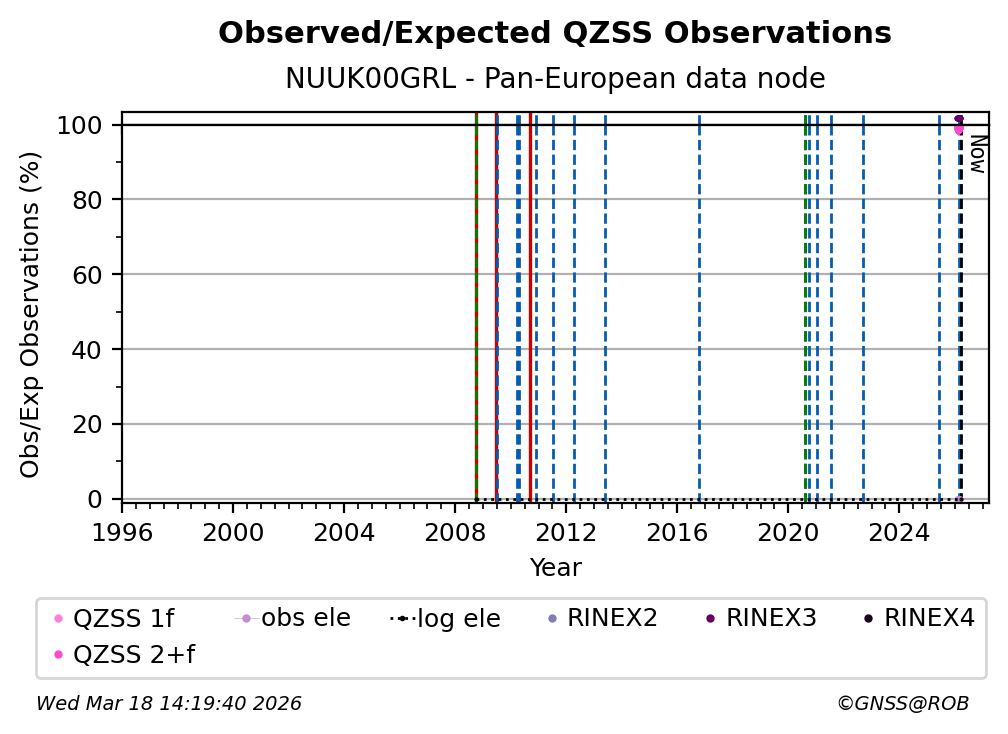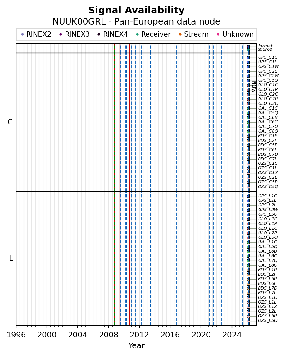 Red vertical lines, green and blue vertical dotted lines indicate respectively a change of antenna, receiver or receiver configuration (including firmware) as indicated by the station manager in the station site log available from the M3G GNSS Metadata Catalog. The purple points in the top of the plot indicate the daily RINEX data availability at the data node.
