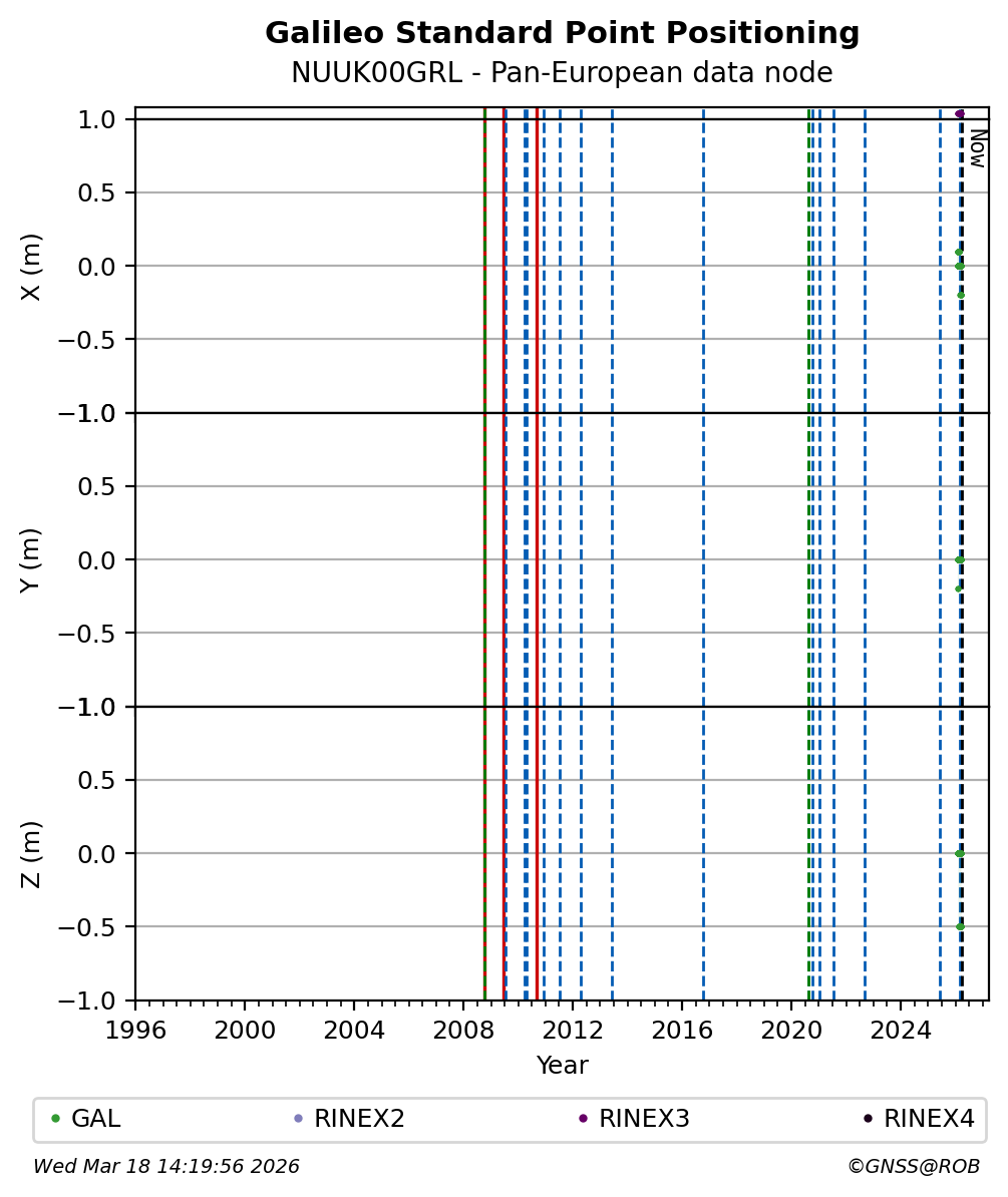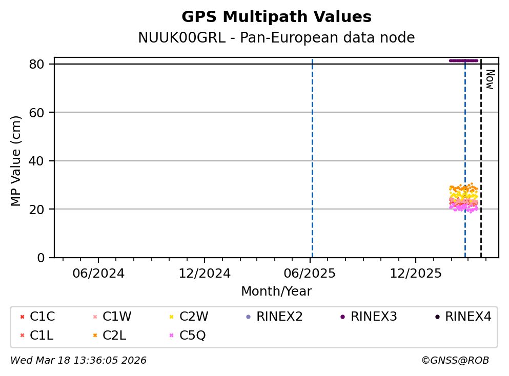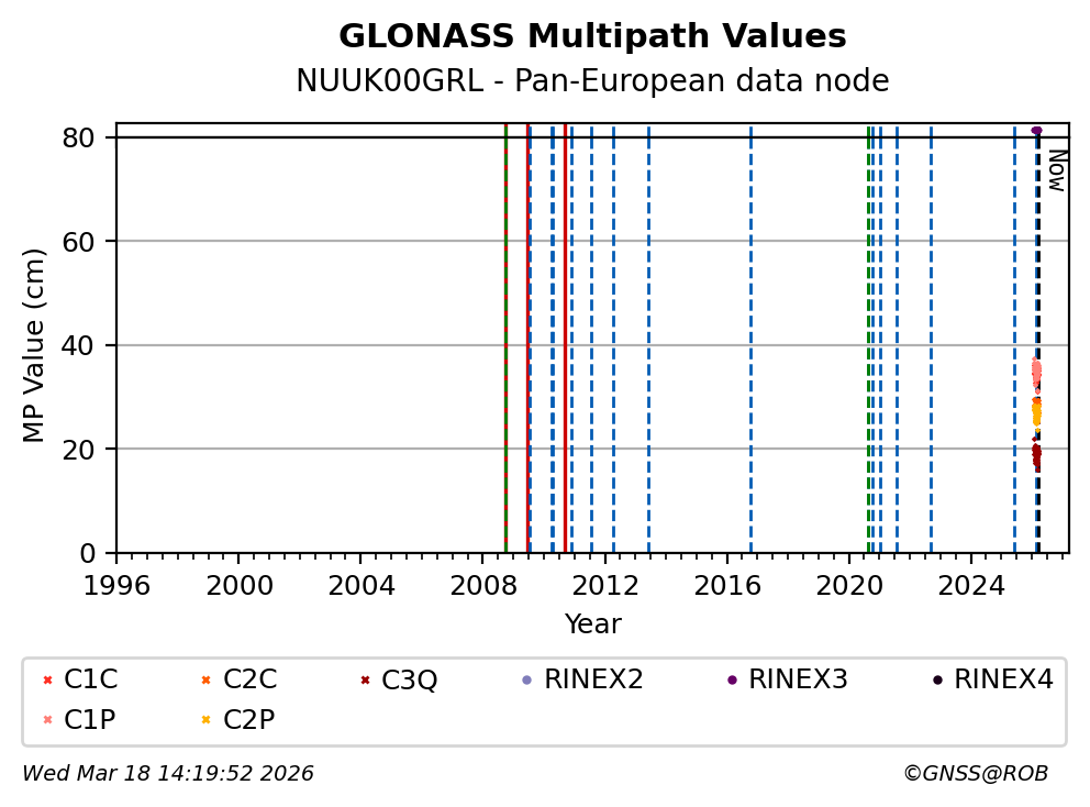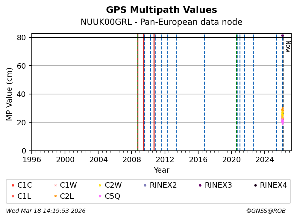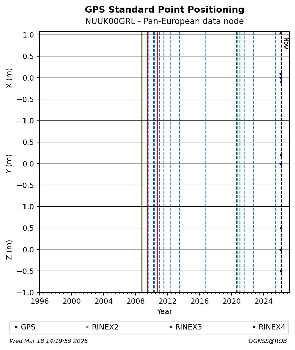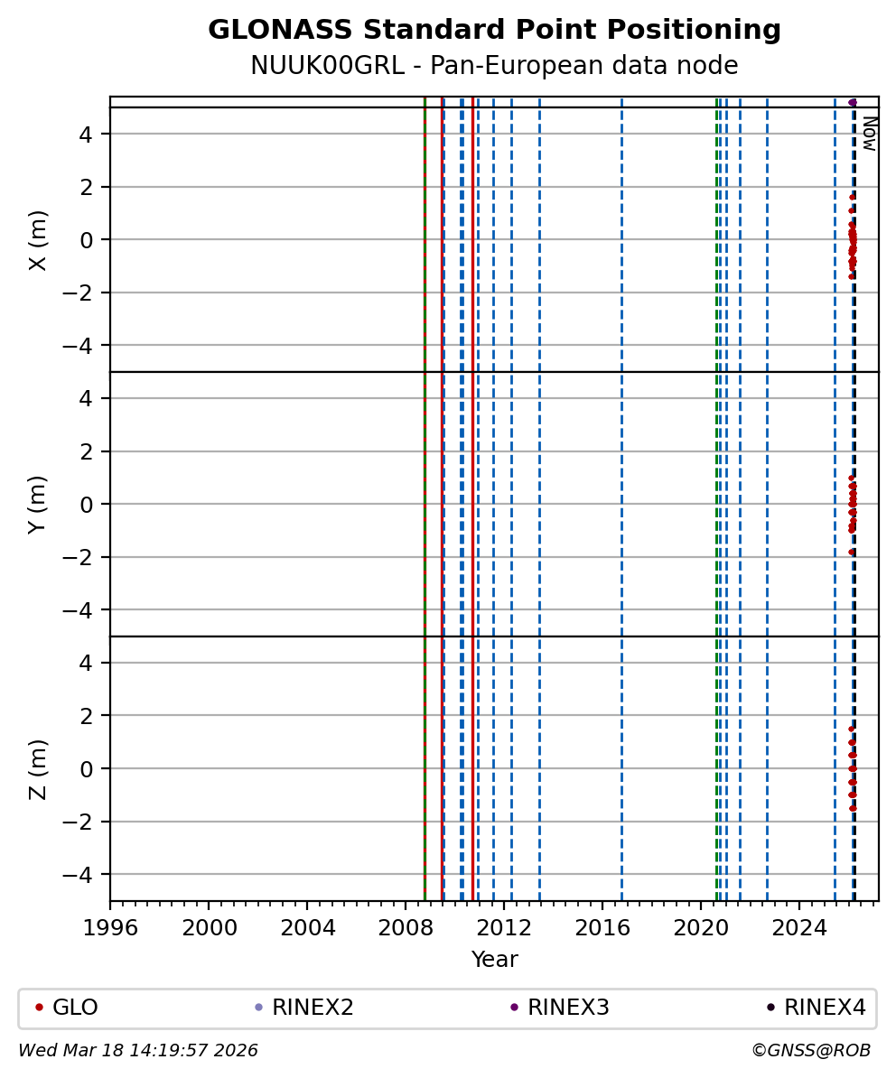 The plots below present the long-term tracking performance of the EPOS-GNSS station NUUK00GRL based on the daily RINEX data available from the Pan-European EPOS-GNSS data node. The data quality metrics have been computed at the data node using the G-Nut/Anubis software.