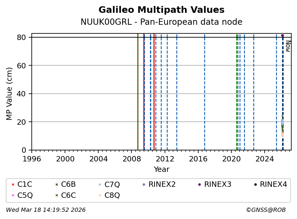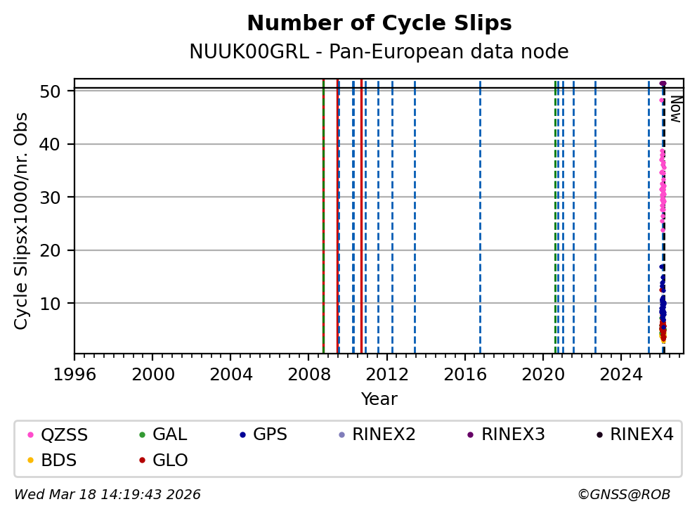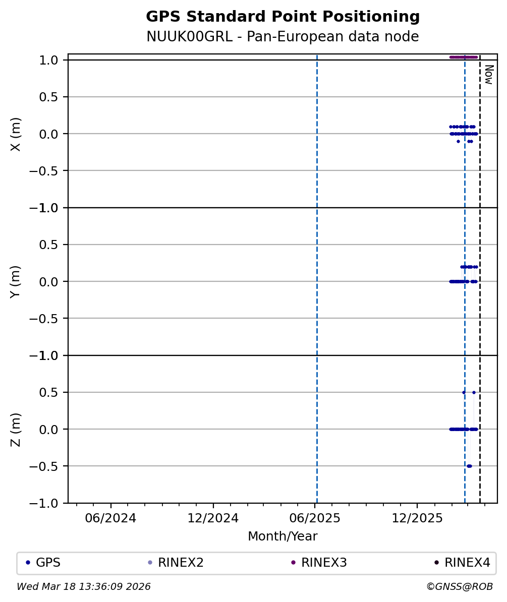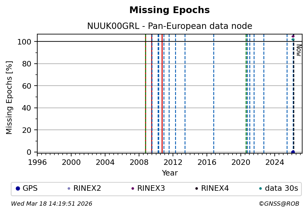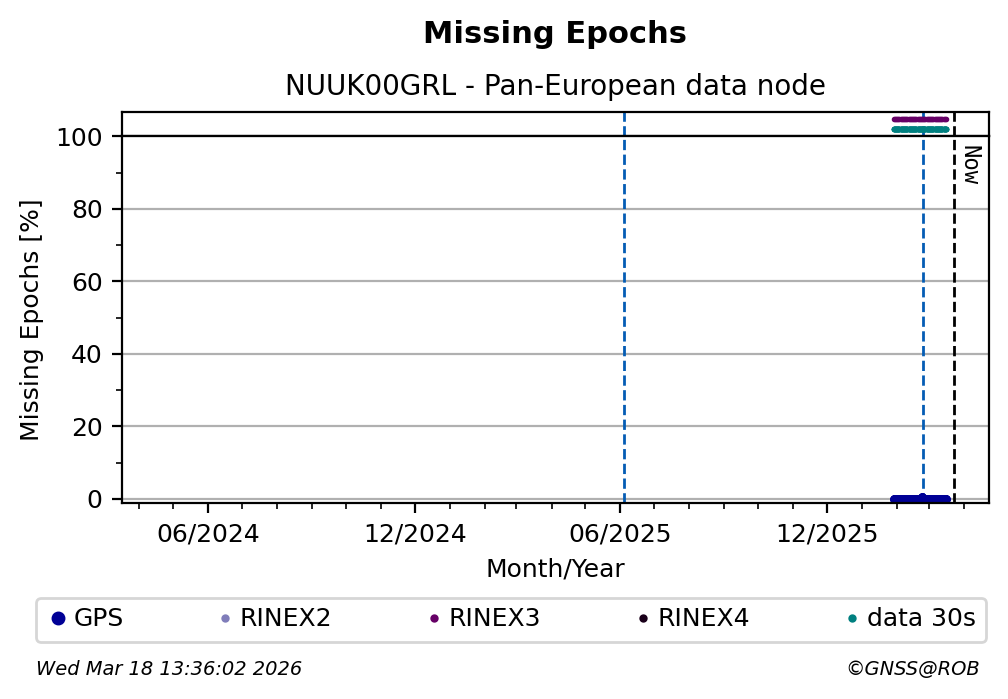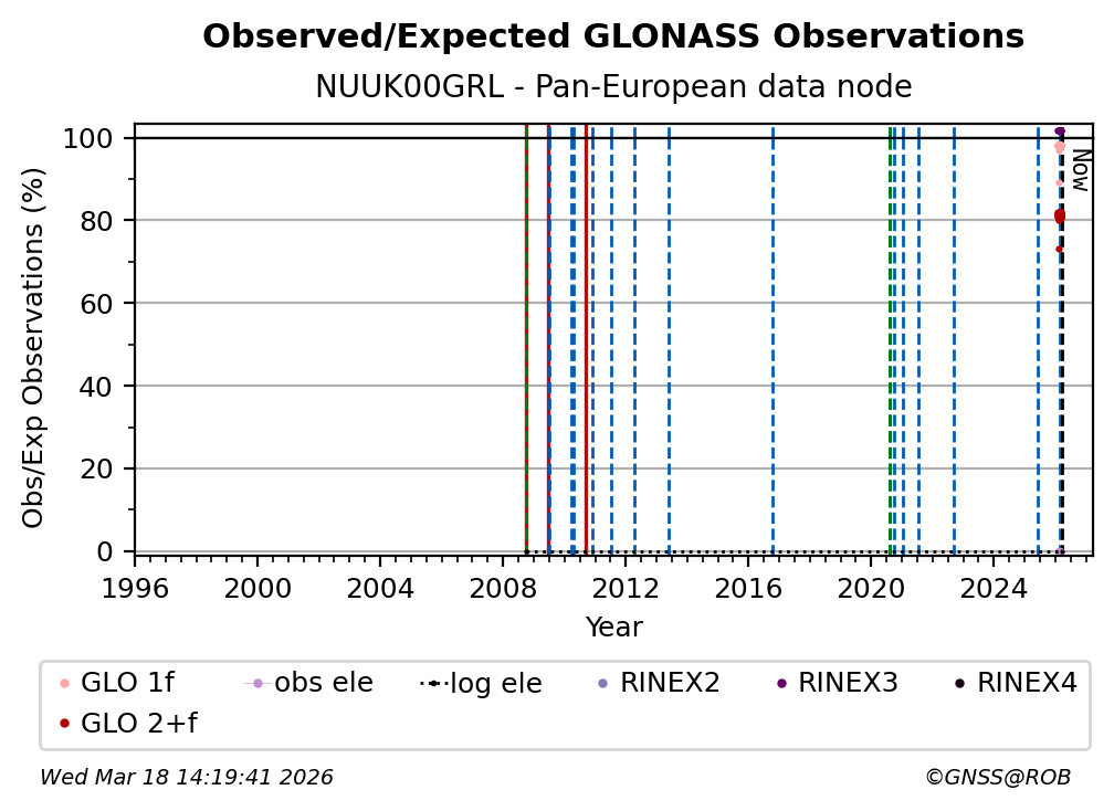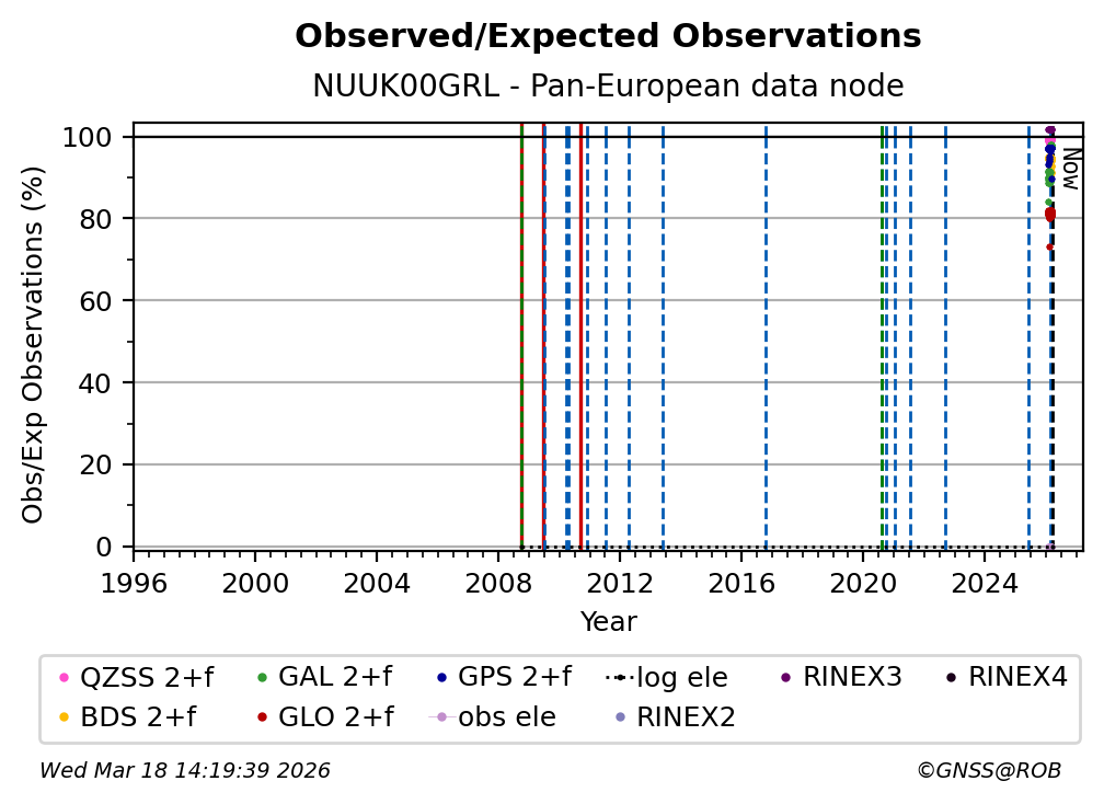The plots below present the long-term tracking performance of the EPOS-GNSS station NUUK00GRL based on the daily RINEX data available from the Pan-European EPOS-GNSS data node. The data quality metrics have been computed at the data node using the G-Nut/Anubis software.