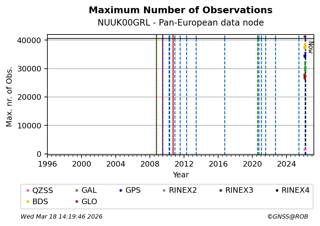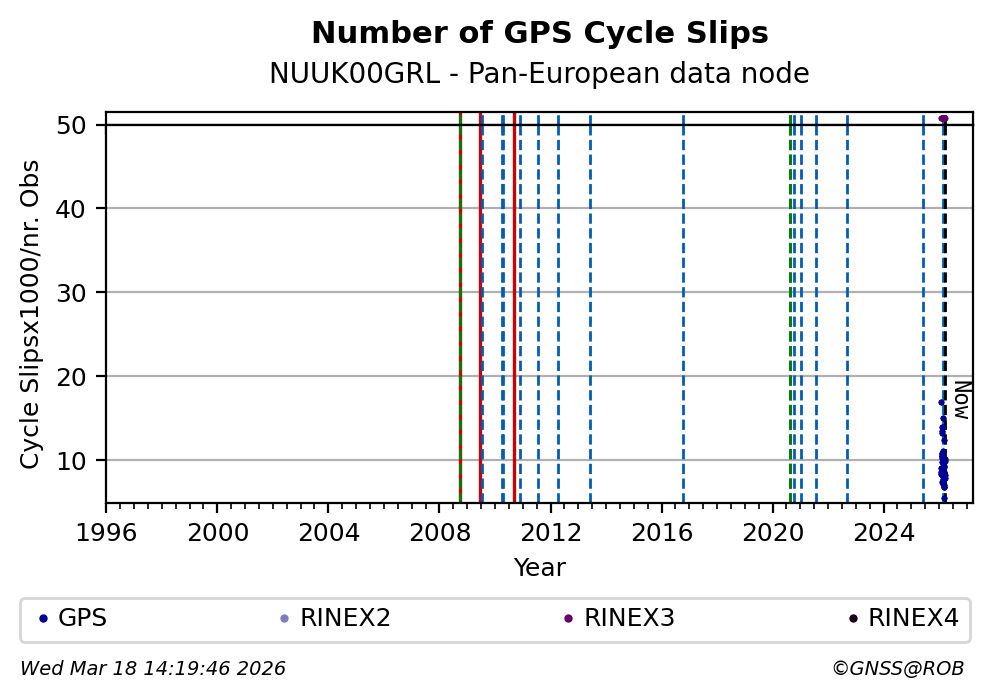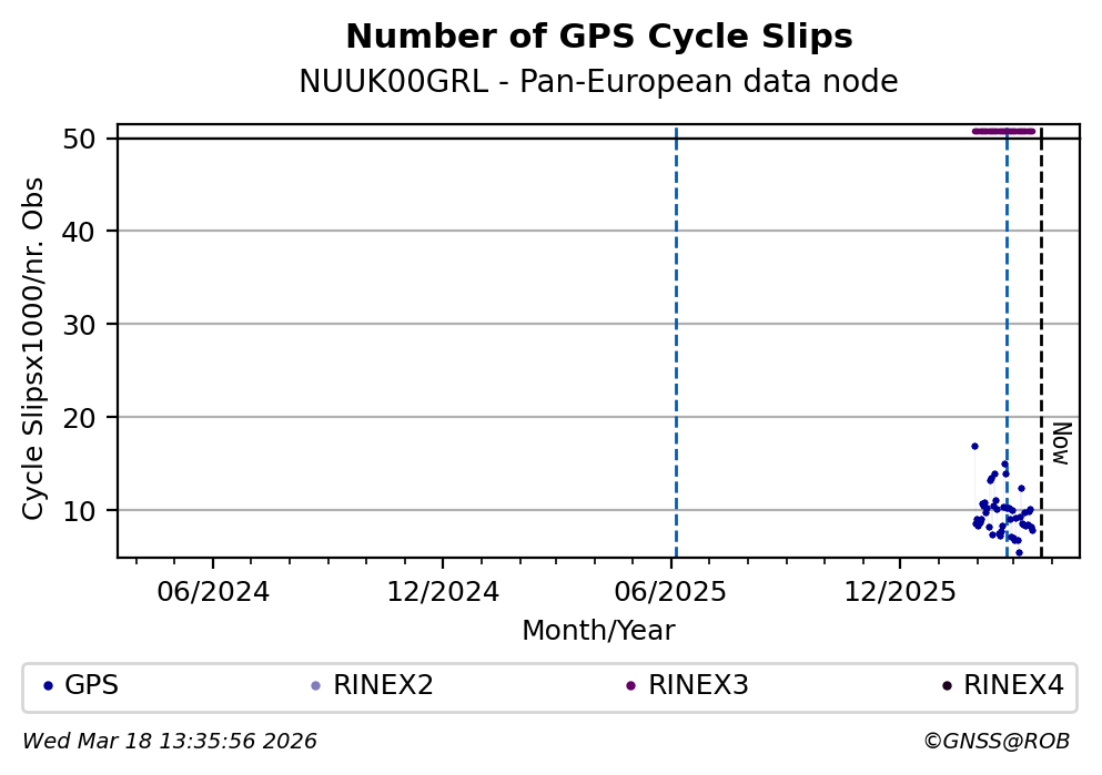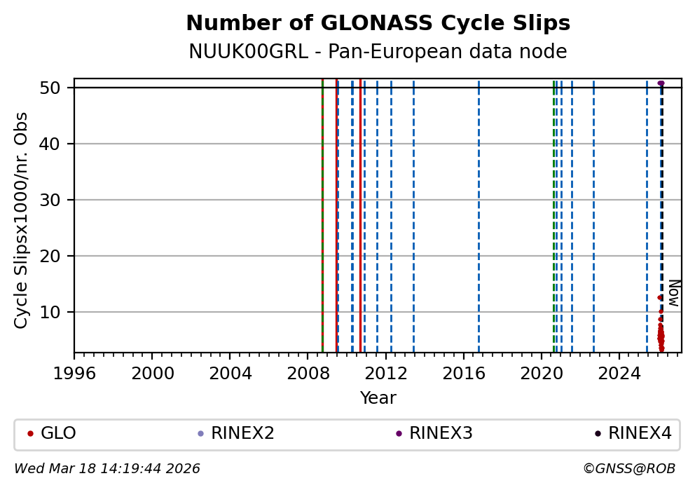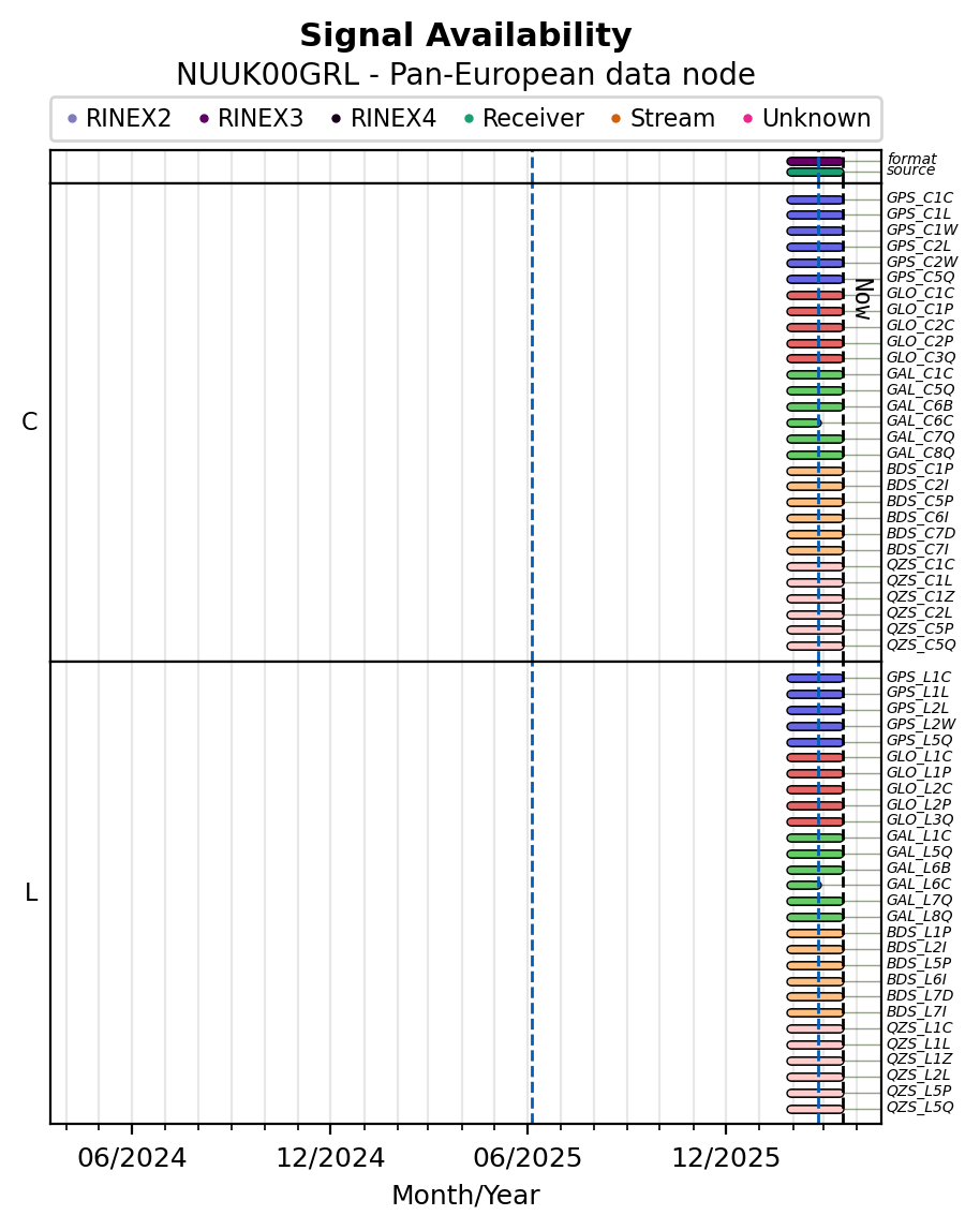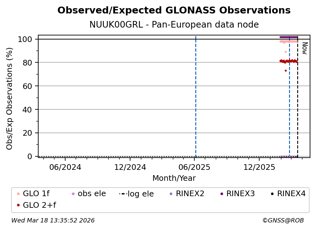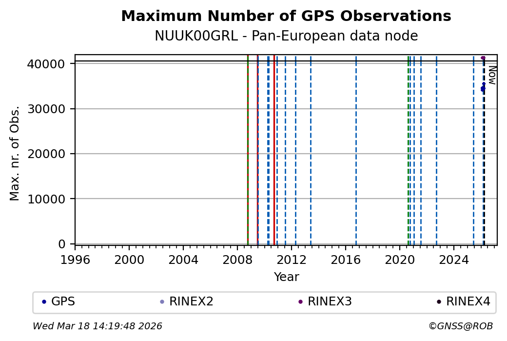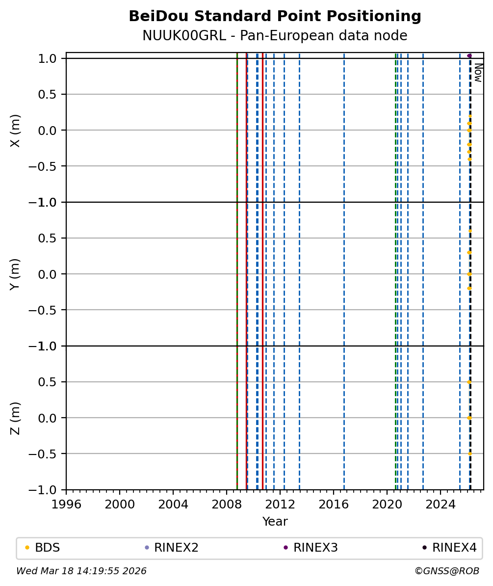 The plots below present the long-term tracking performance of the EPOS-GNSS station NUUK00GRL based on the daily RINEX data available from the Pan-European EPOS-GNSS data node. The data quality metrics have been computed at the data node using the G-Nut/Anubis software.