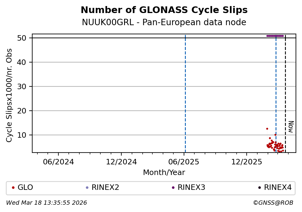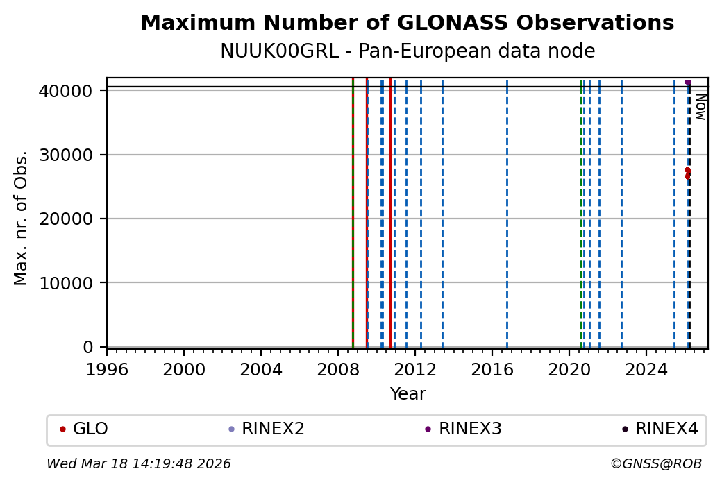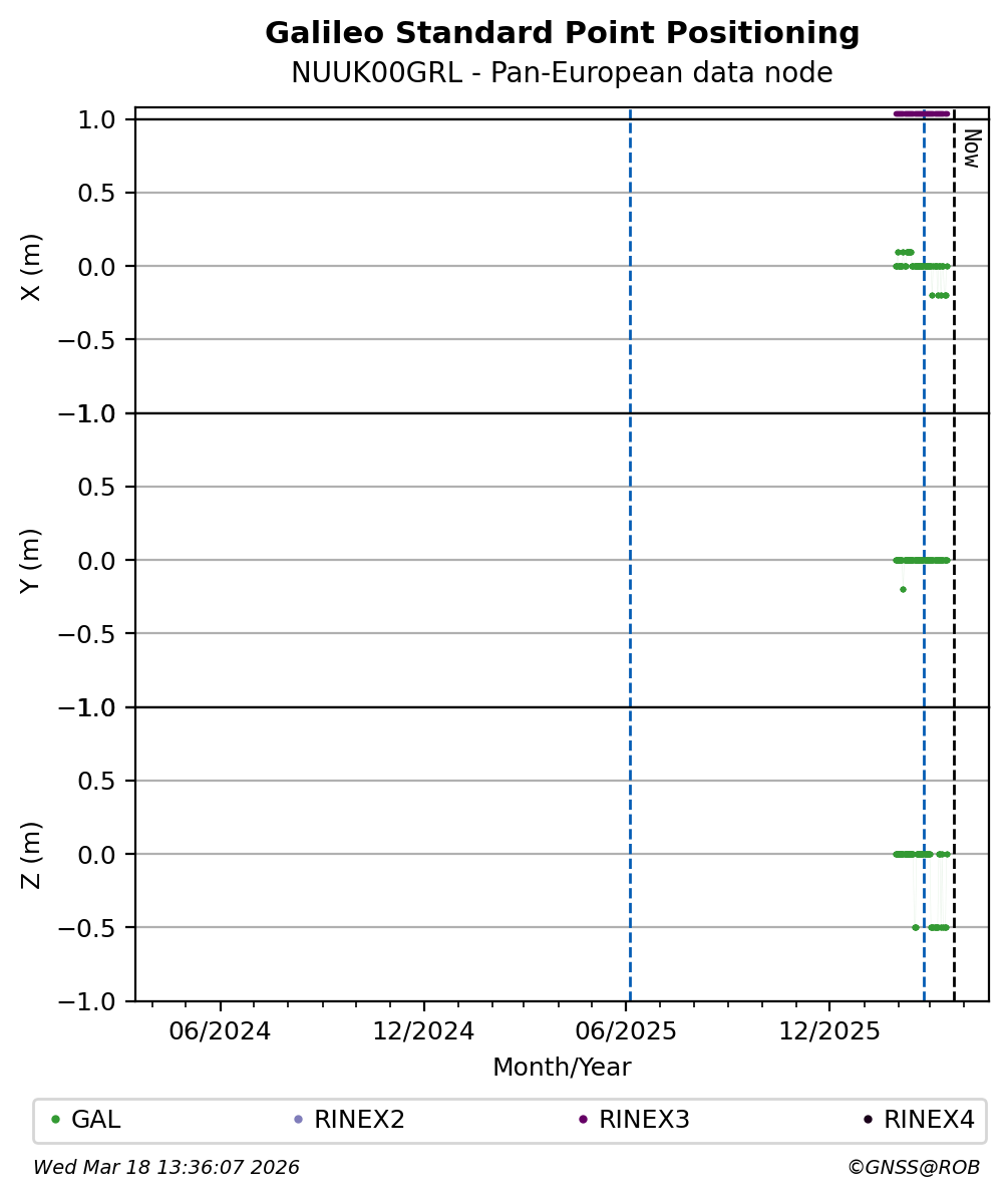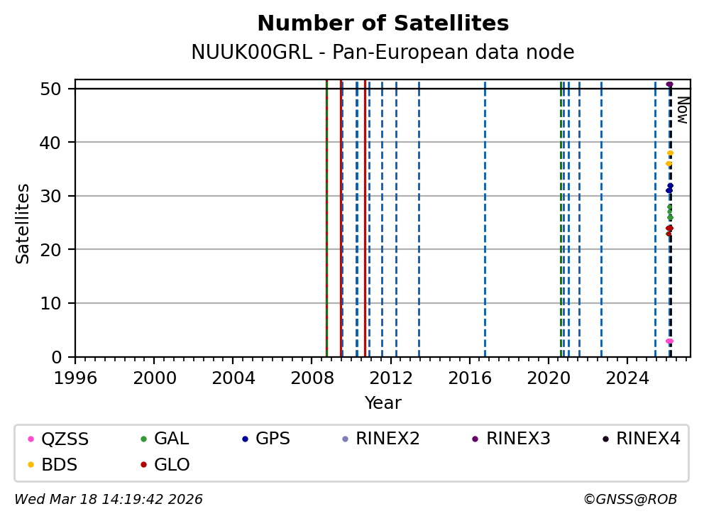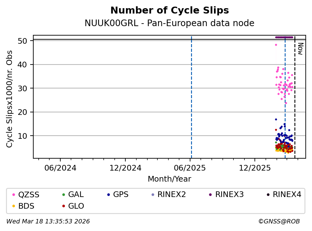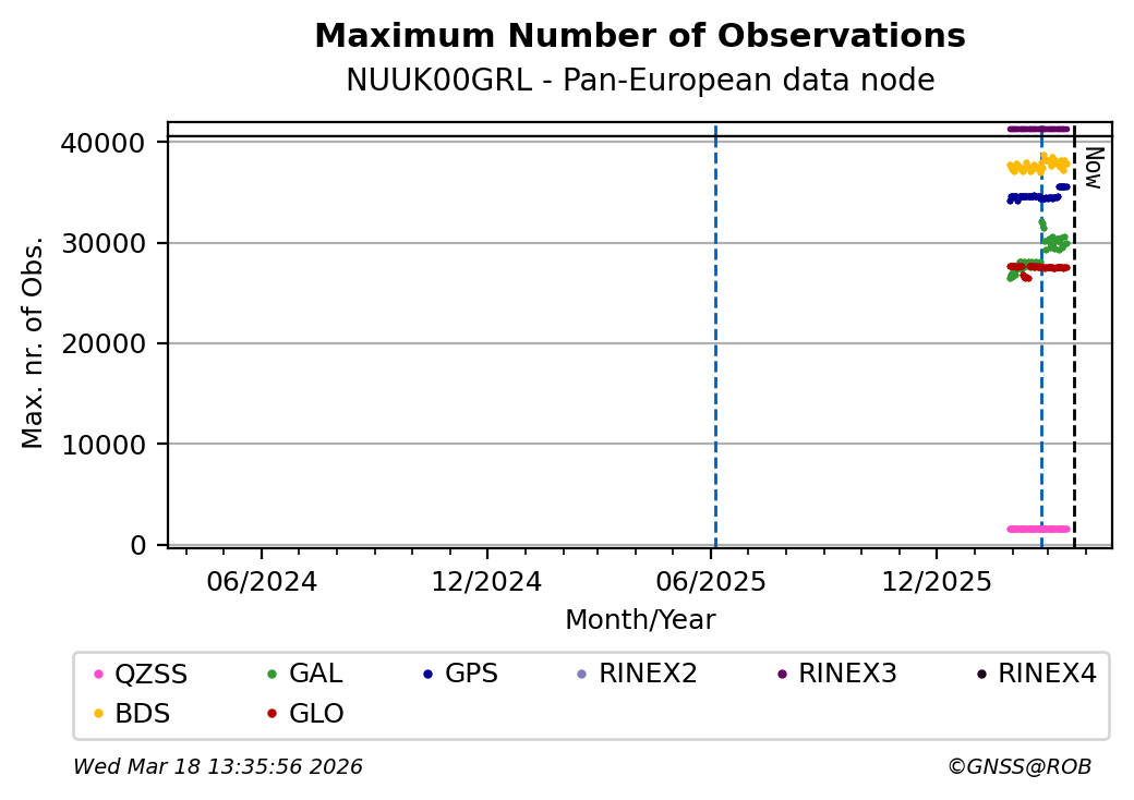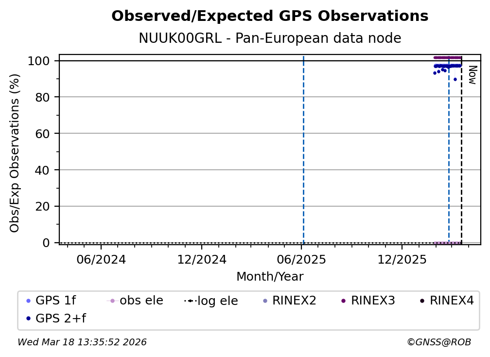 The plots below present the long-term tracking performance of the EPOS-GNSS station NUUK00GRL based on the daily RINEX data available from the Pan-European EPOS-GNSS data node. The data quality metrics have been computed at the data node using the G-Nut/Anubis software.