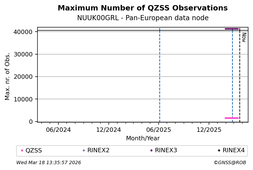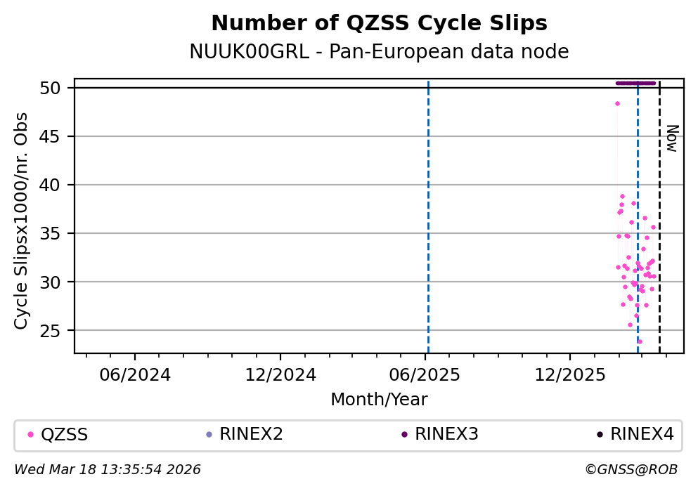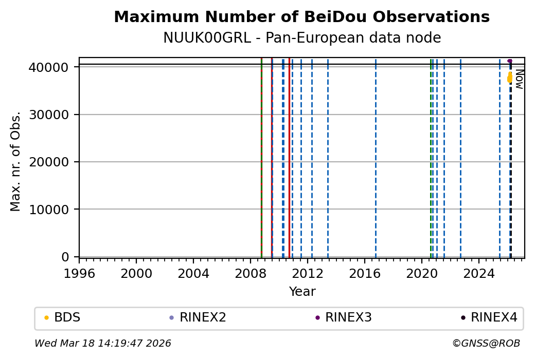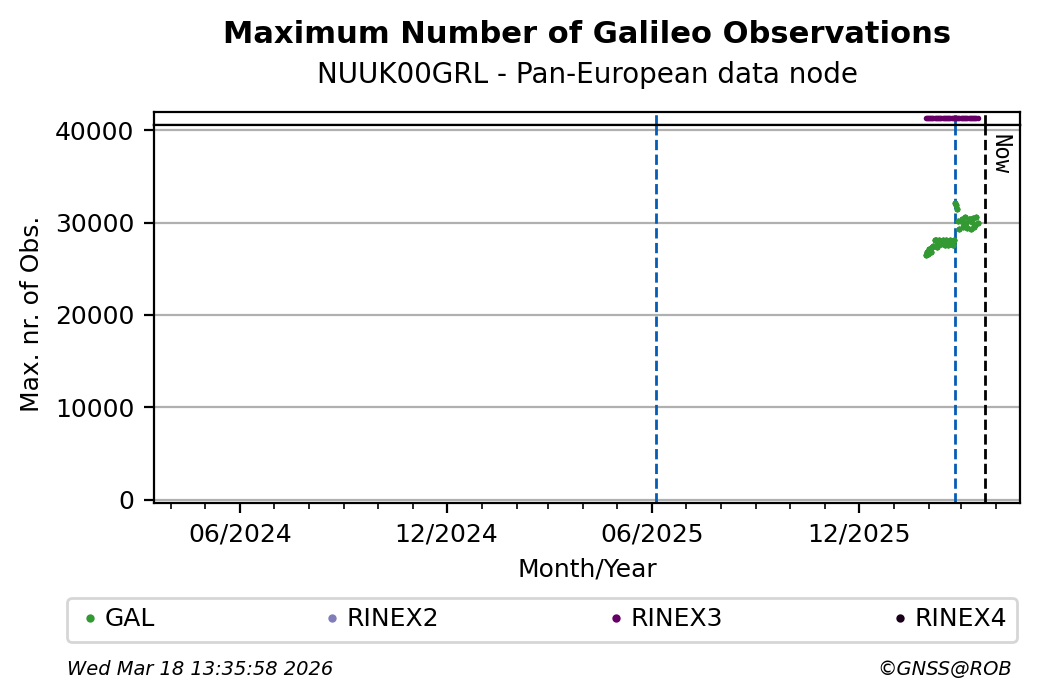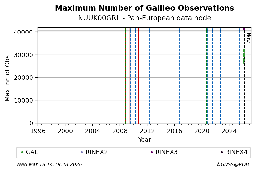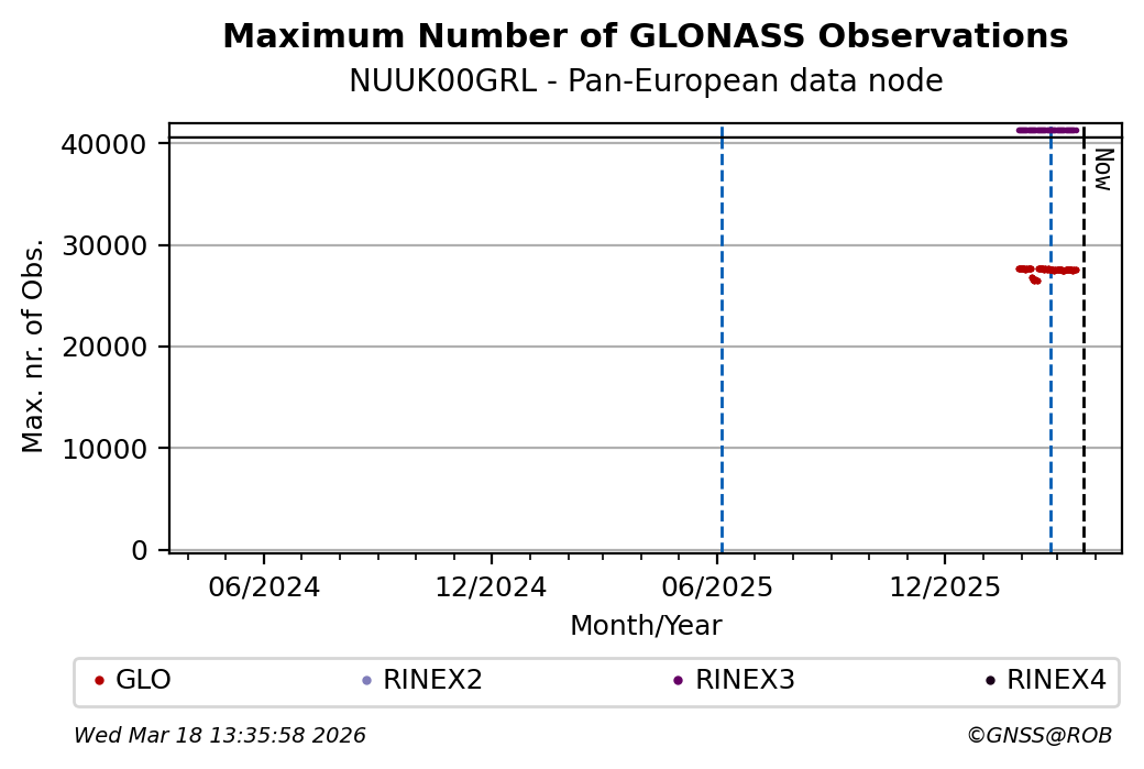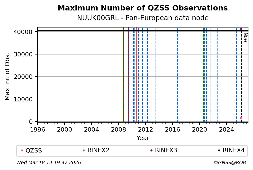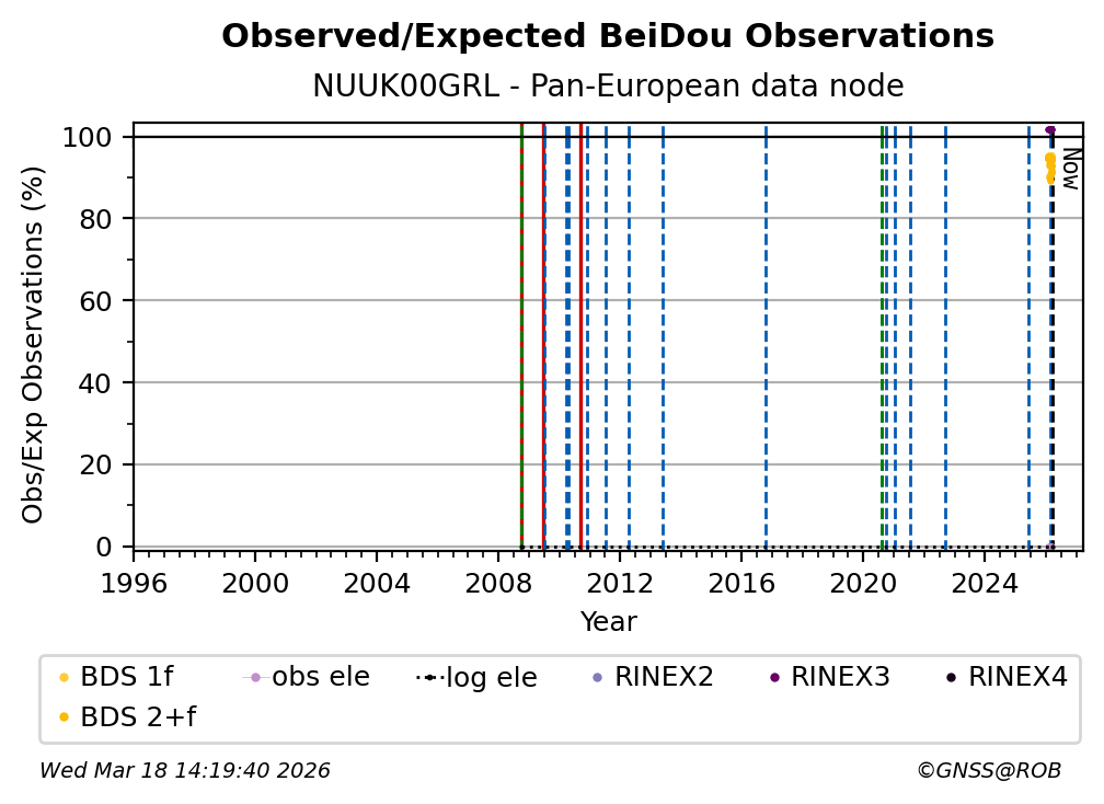 The plots below present the long-term tracking performance of the EPOS-GNSS station NUUK00GRL based on the daily RINEX data available from the Pan-European EPOS-GNSS data node. The data quality metrics have been computed at the data node using the G-Nut/Anubis software.