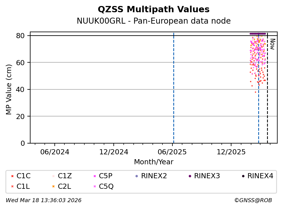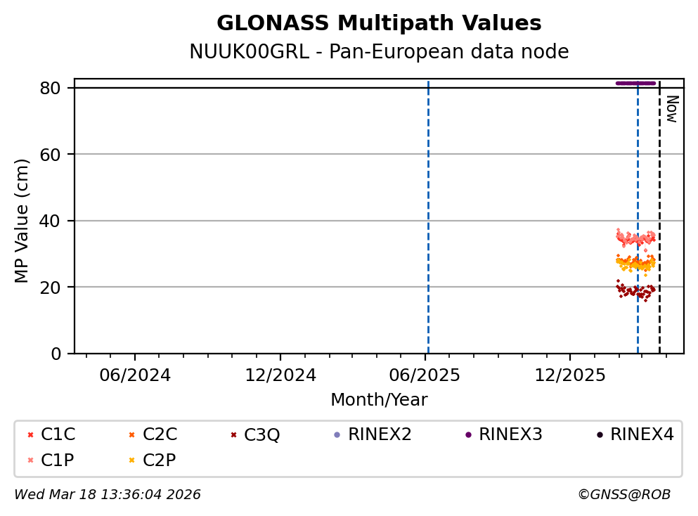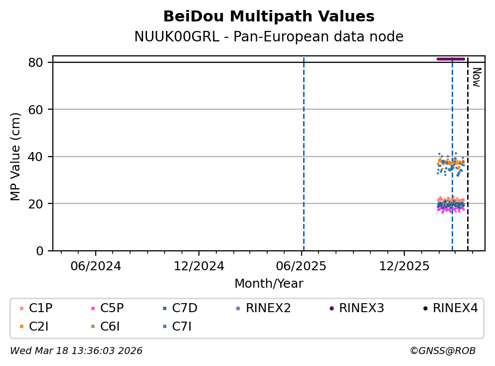 These plots display the daily mean of code multipath per frequency band and satellite constellation. Code multipath statistics are calculated for all pseudorange codes of all GNSS satellites providing dual-frequency carrier-phase observations. The code multipath characterizes the quality of the observed signal and the site environment.