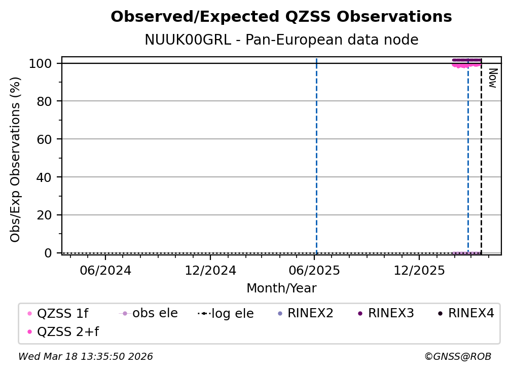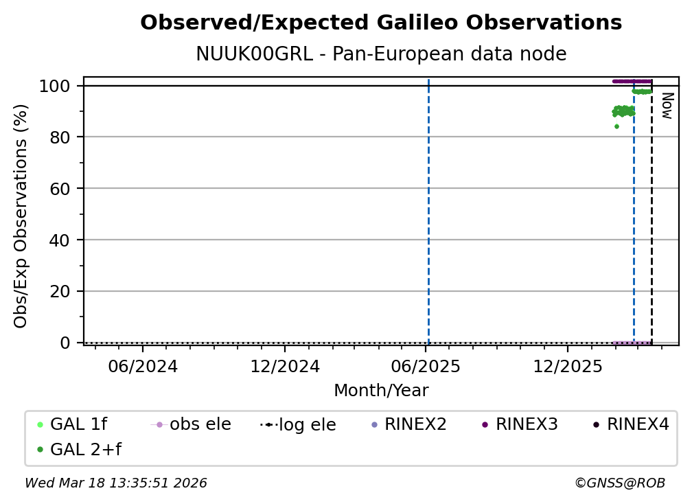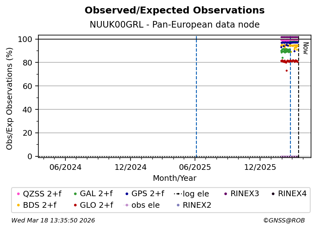 The percentage corresponds, for each constellation tracked by the station, to the ratio of the number of observations in the daily RINEX file with respect to the number of expected observations: