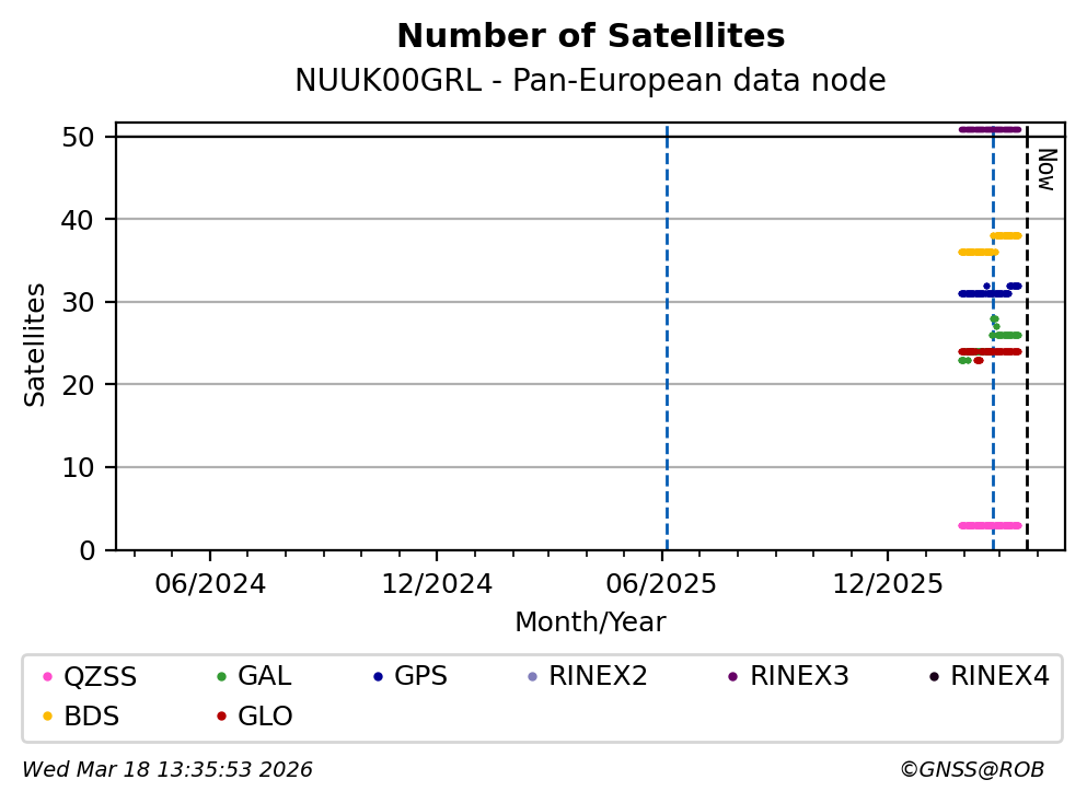 These plots display the number of observed satellites for each constellation tracked by the station.