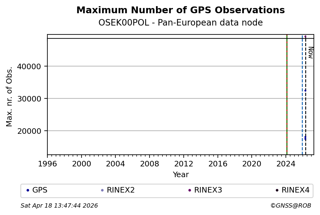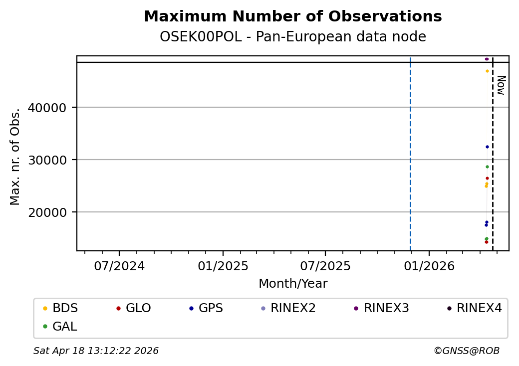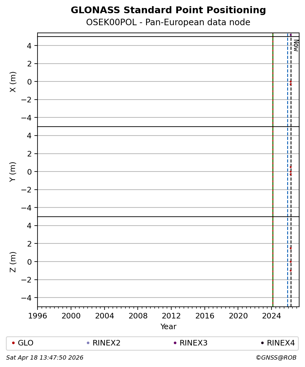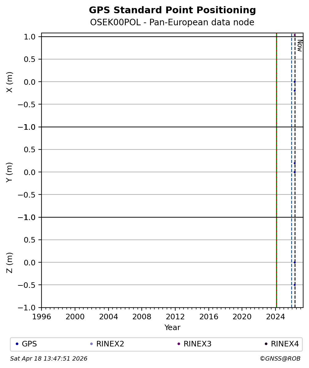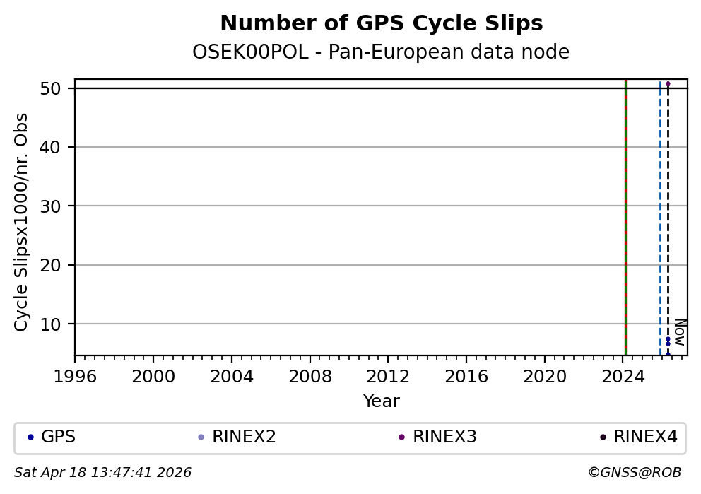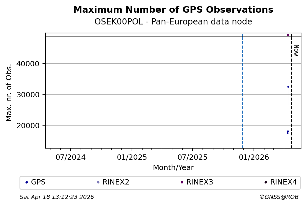 The plots below present the long-term tracking performance of the EPOS-GNSS station OSEK00POL based on the daily RINEX data available from the Pan-European EPOS-GNSS data node. The data quality metrics have been computed at the data node using the G-Nut/Anubis software.