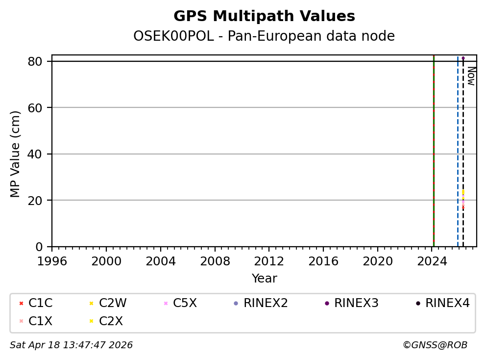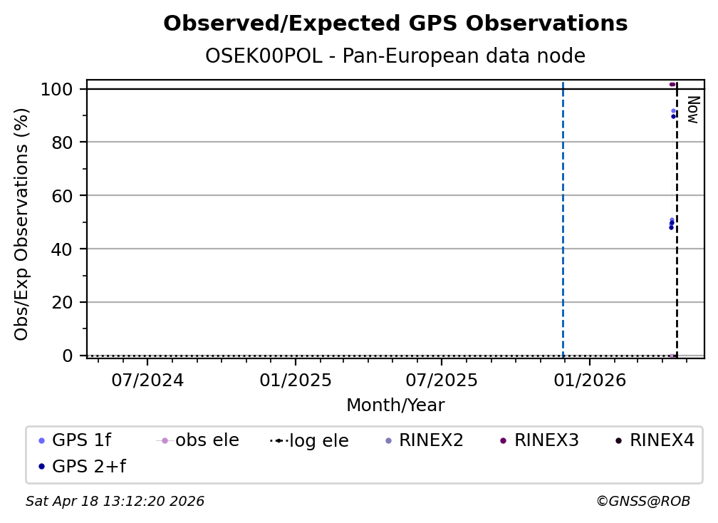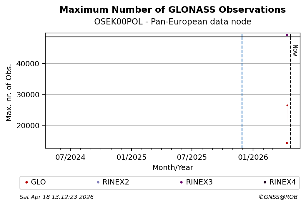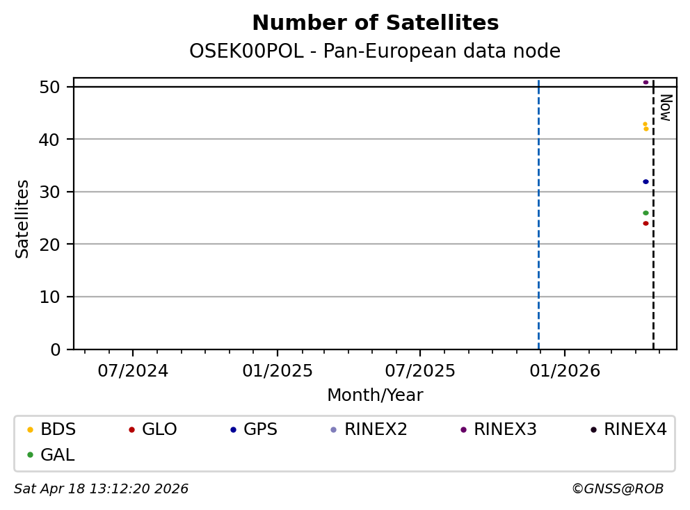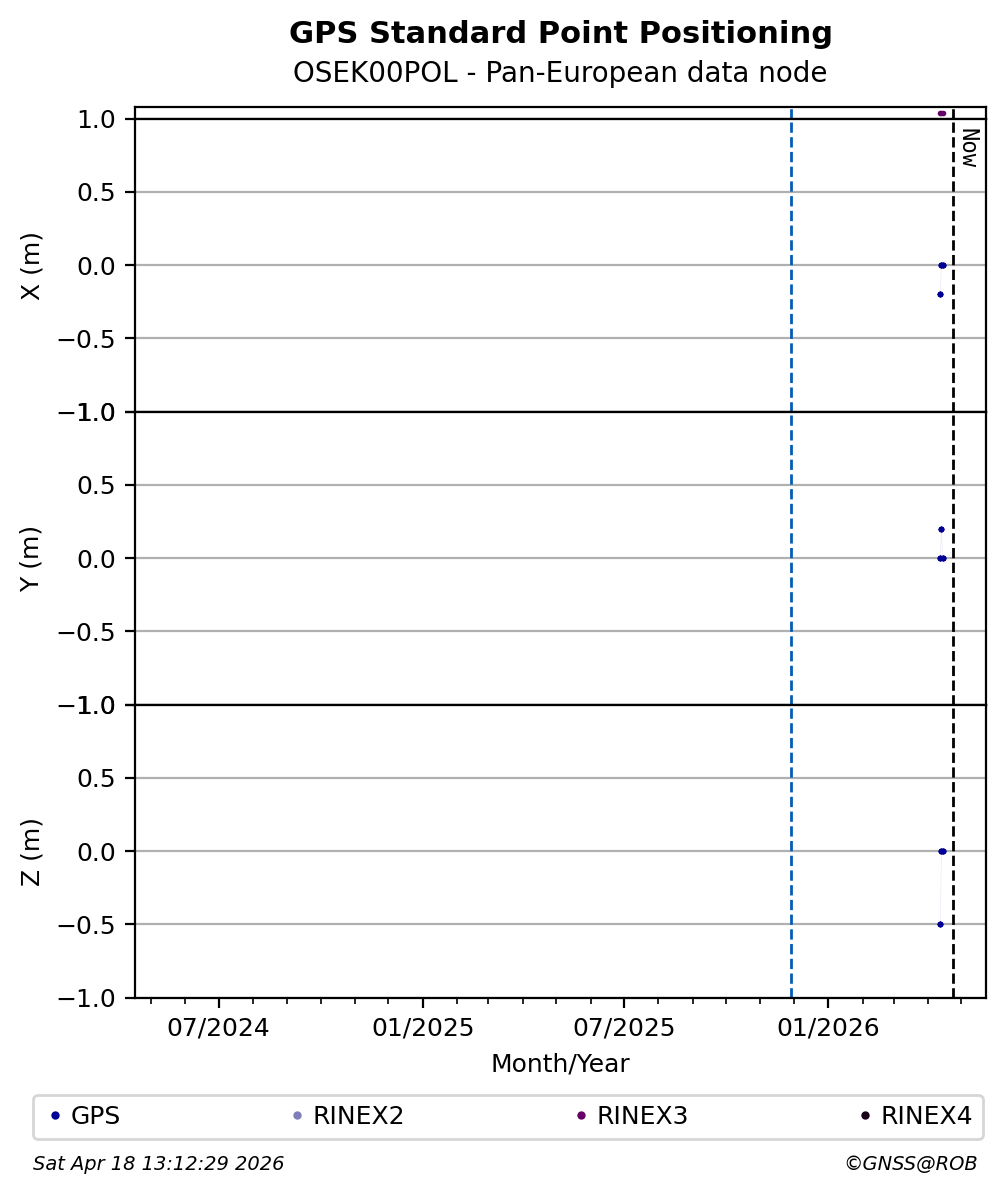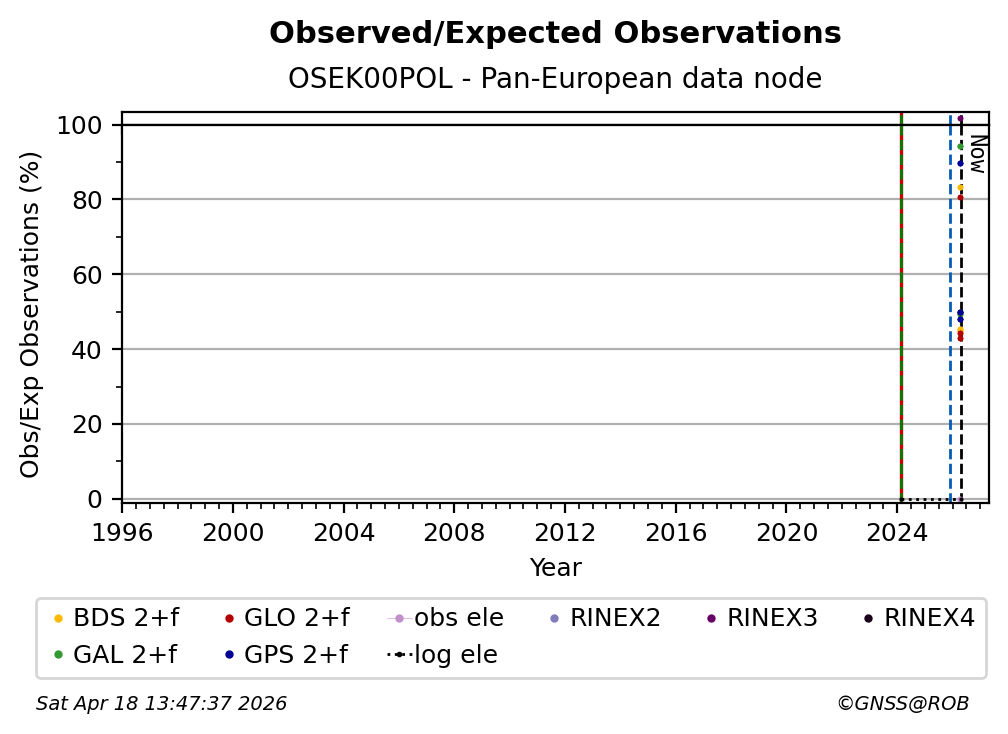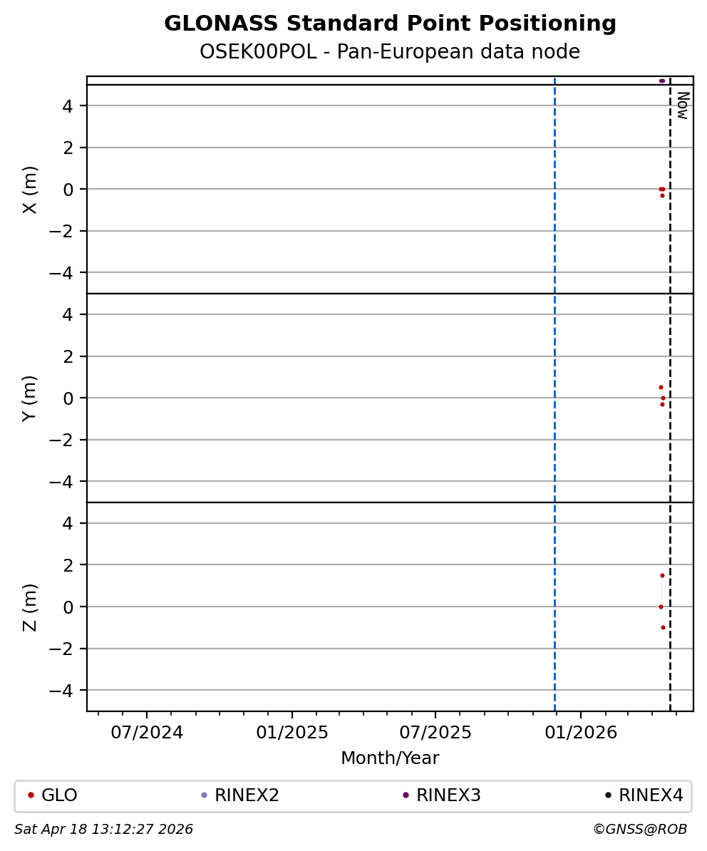 The plots below present the long-term tracking performance of the EPOS-GNSS station OSEK00POL based on the daily RINEX data available from the Pan-European EPOS-GNSS data node. The data quality metrics have been computed at the data node using the G-Nut/Anubis software.