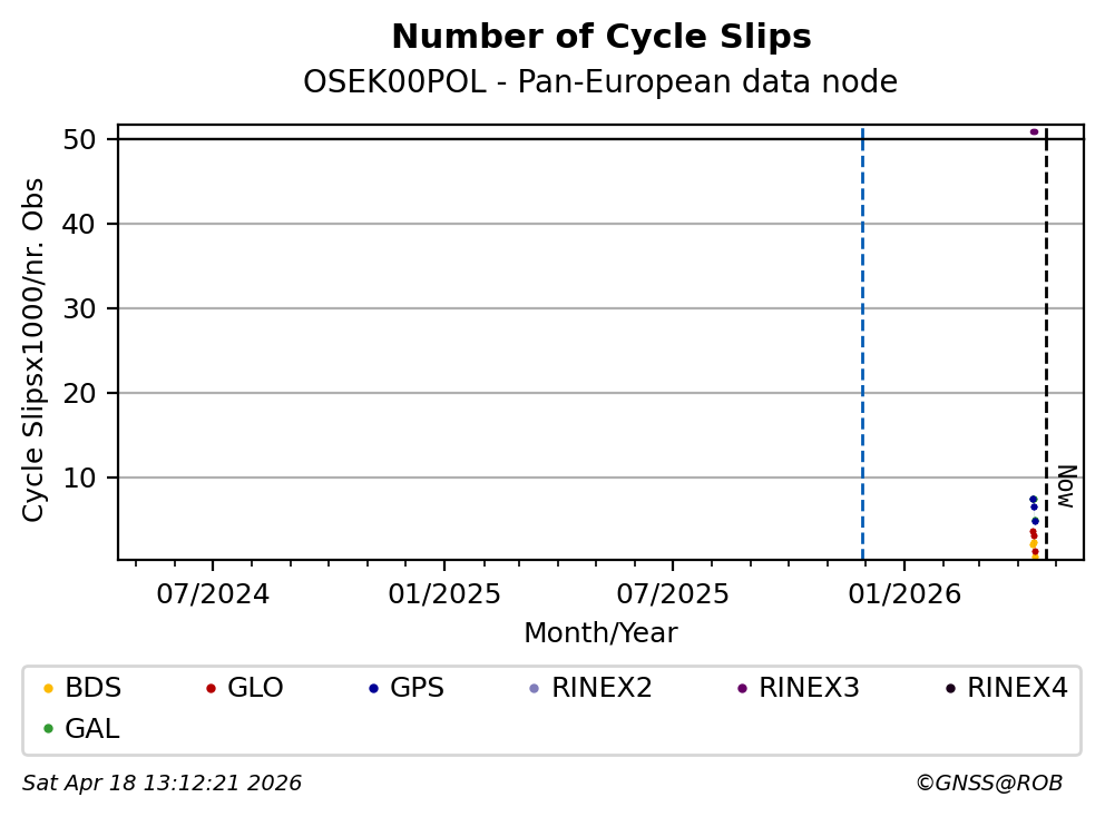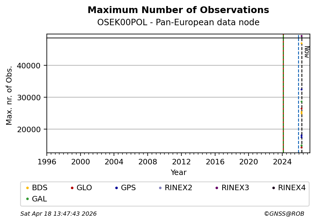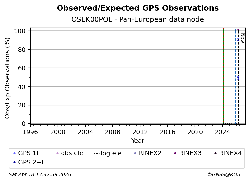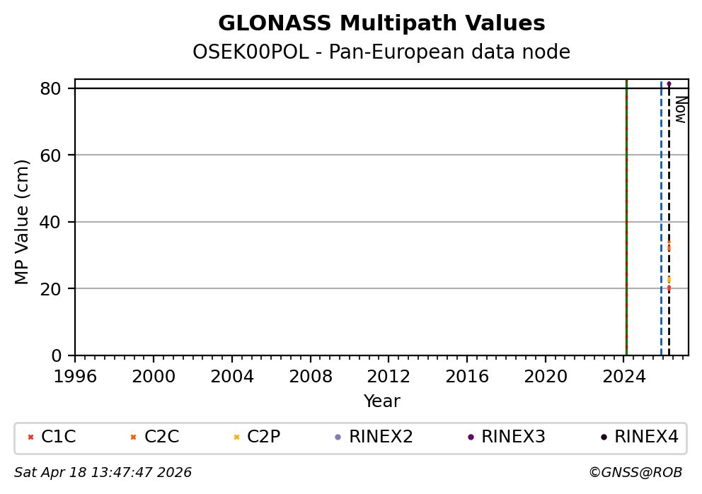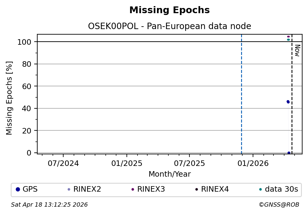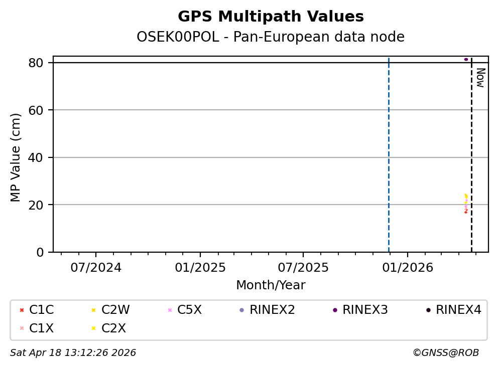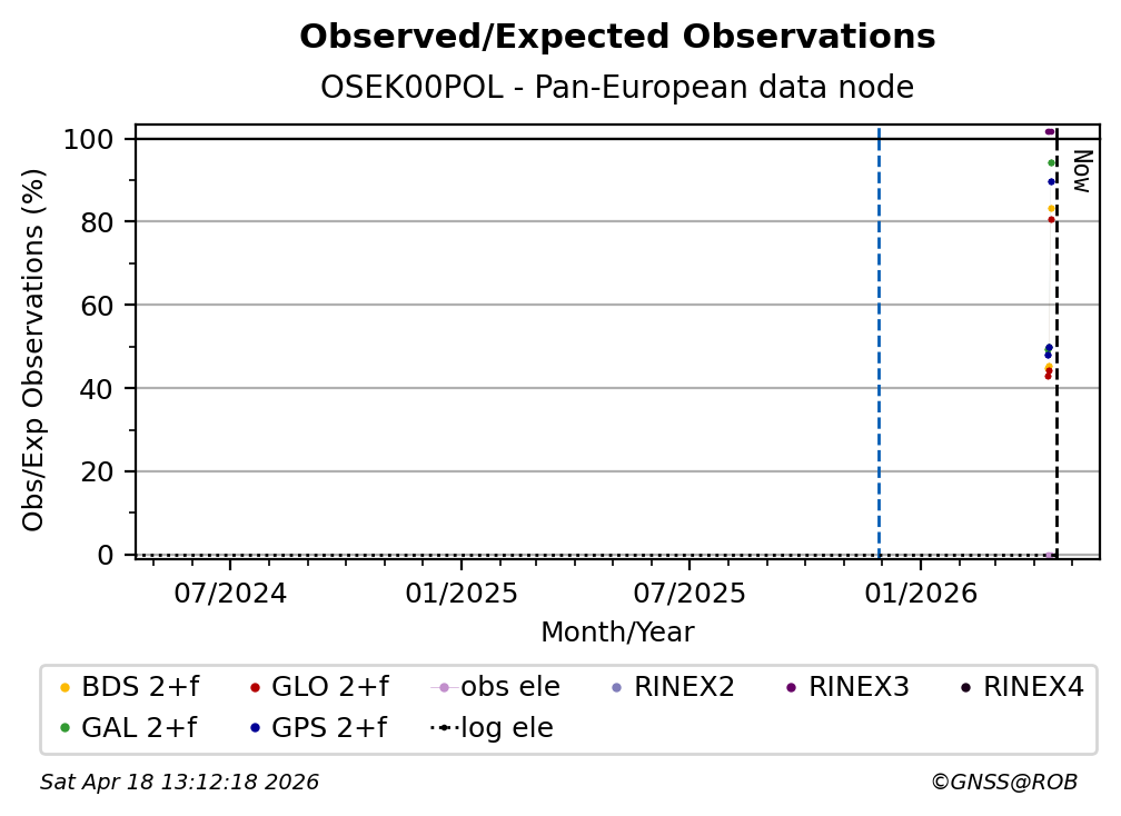 The plots below present the long-term tracking performance of the EPOS-GNSS station OSEK00POL based on the daily RINEX data available from the Pan-European EPOS-GNSS data node. The data quality metrics have been computed at the data node using the G-Nut/Anubis software.