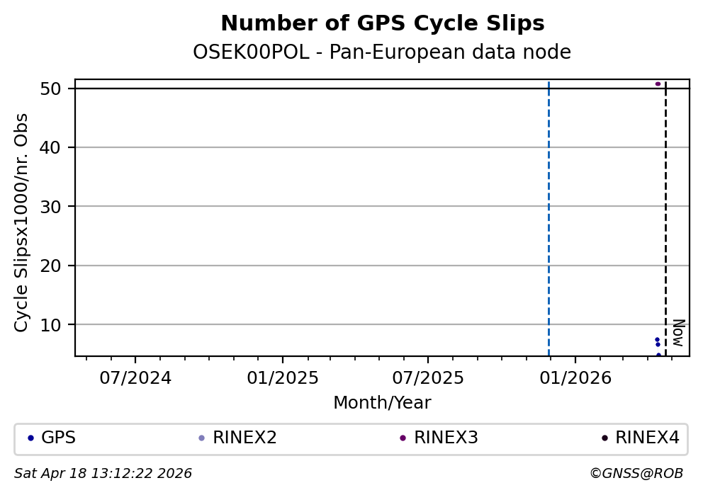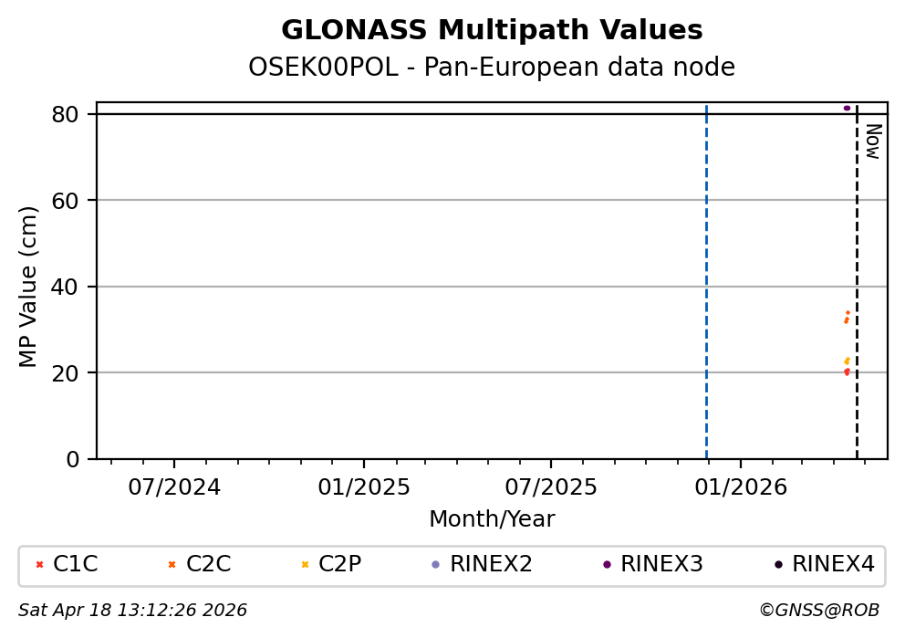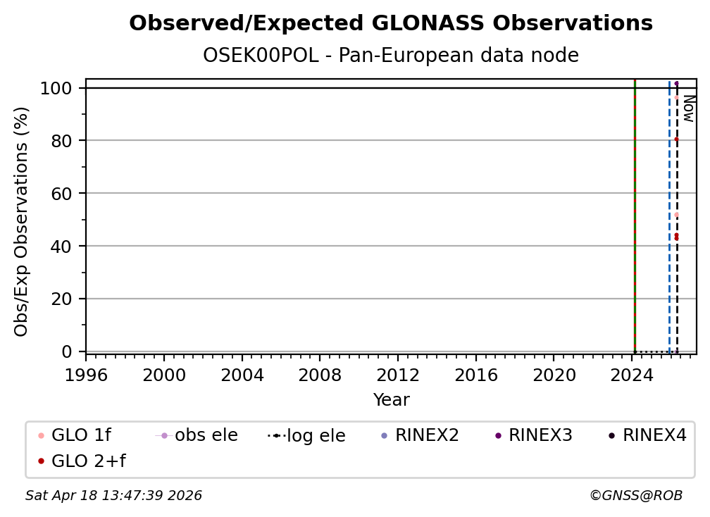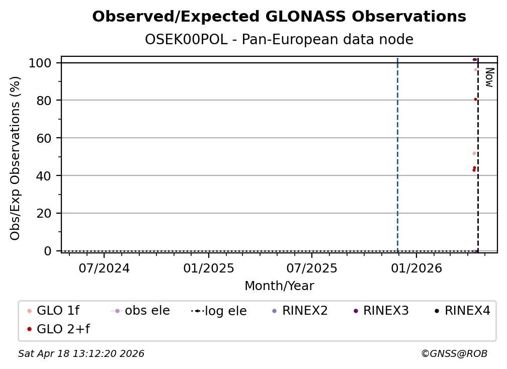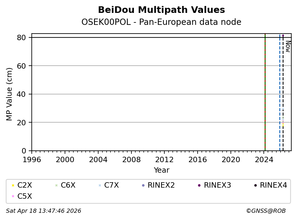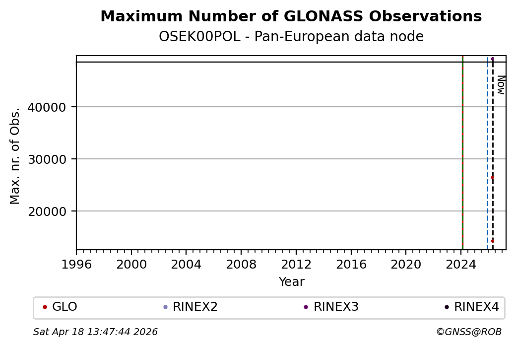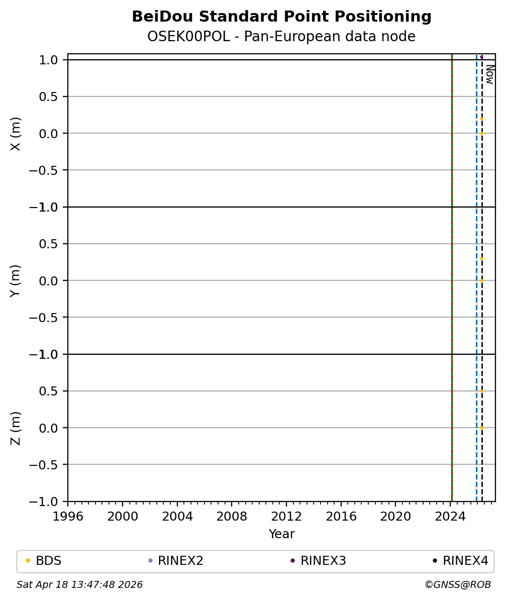 The plots below present the long-term tracking performance of the EPOS-GNSS station OSEK00POL based on the daily RINEX data available from the Pan-European EPOS-GNSS data node. The data quality metrics have been computed at the data node using the G-Nut/Anubis software.