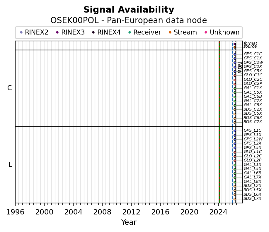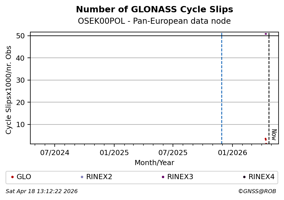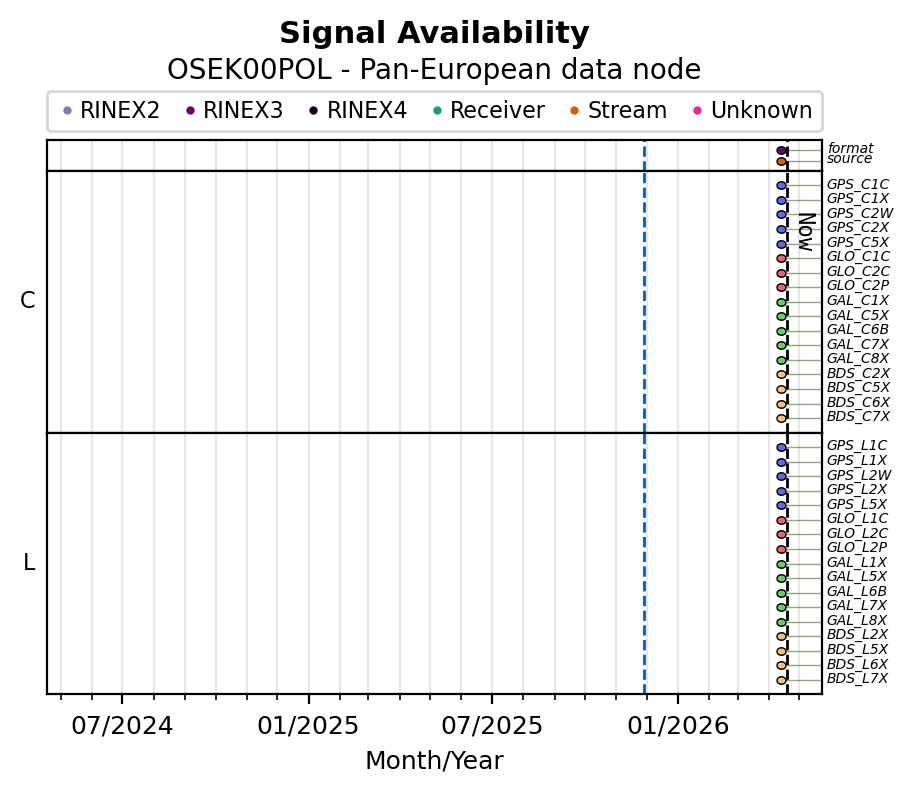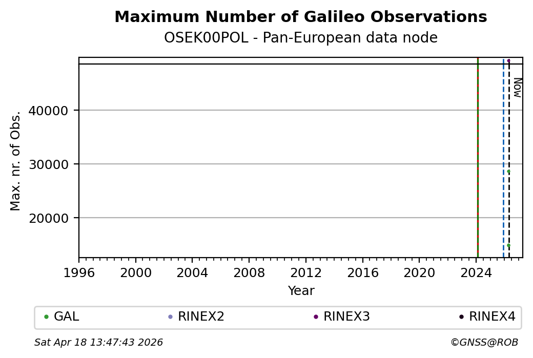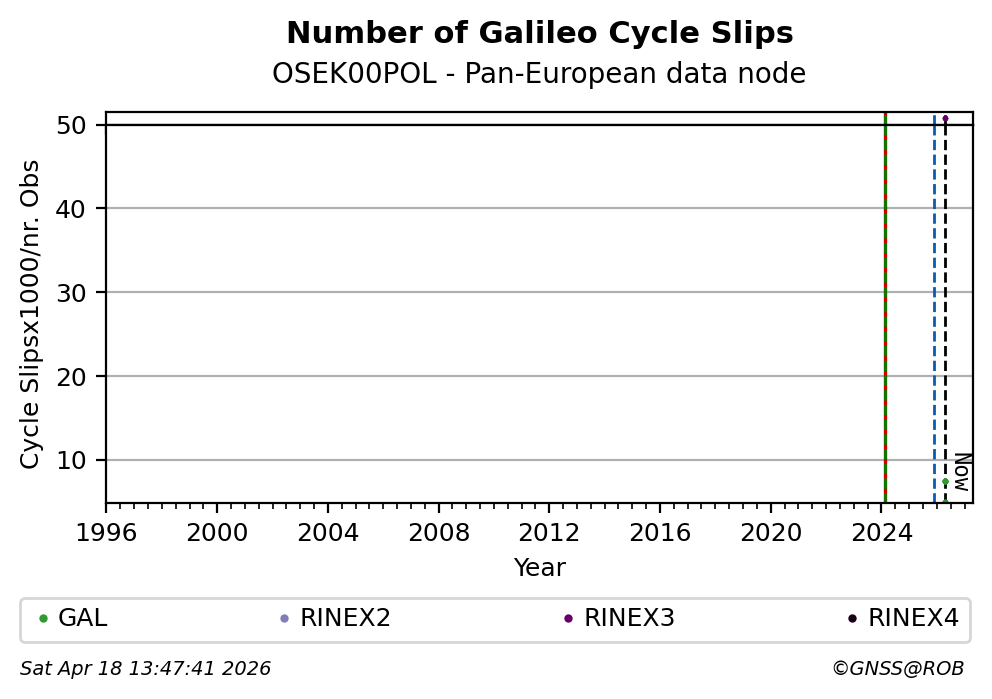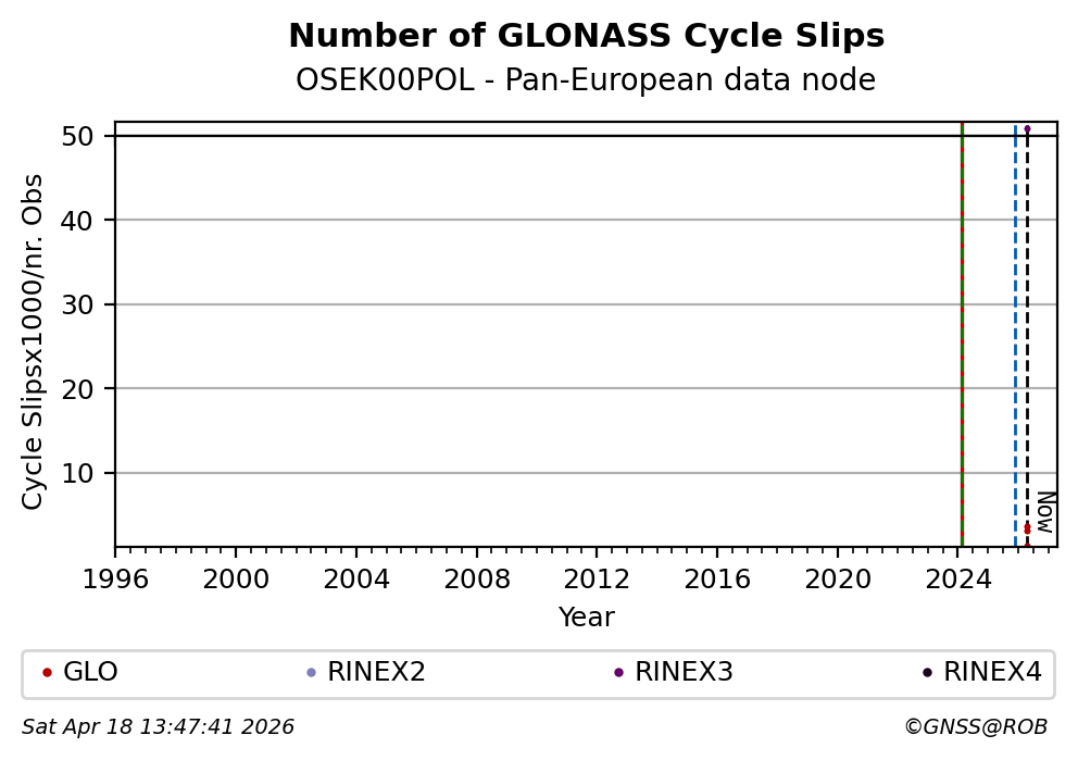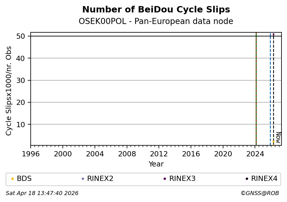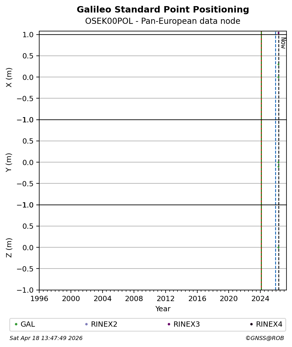 The plots below present the long-term tracking performance of the EPOS-GNSS station OSEK00POL based on the daily RINEX data available from the Pan-European EPOS-GNSS data node. The data quality metrics have been computed at the data node using the G-Nut/Anubis software.