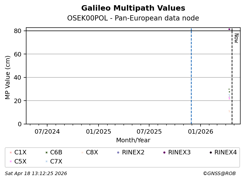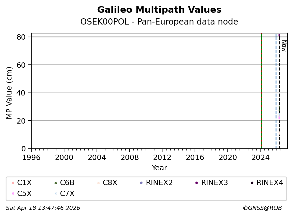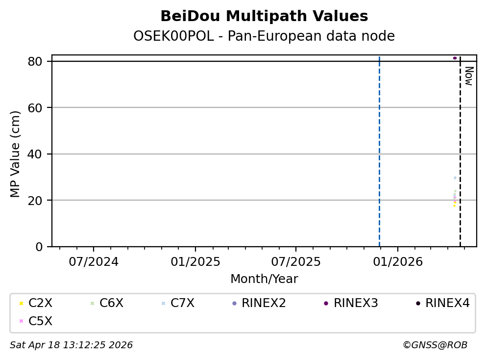 These plots display the daily mean of code multipath per frequency band and satellite constellation. Code multipath statistics are calculated for all pseudorange codes of all GNSS satellites providing dual-frequency carrier-phase observations. The code multipath characterizes the quality of the observed signal and the site environment.
