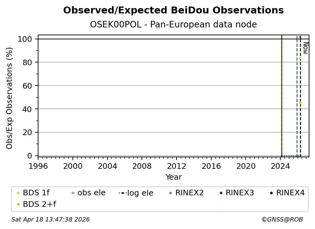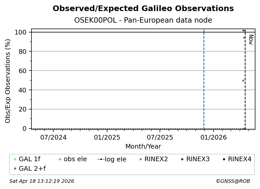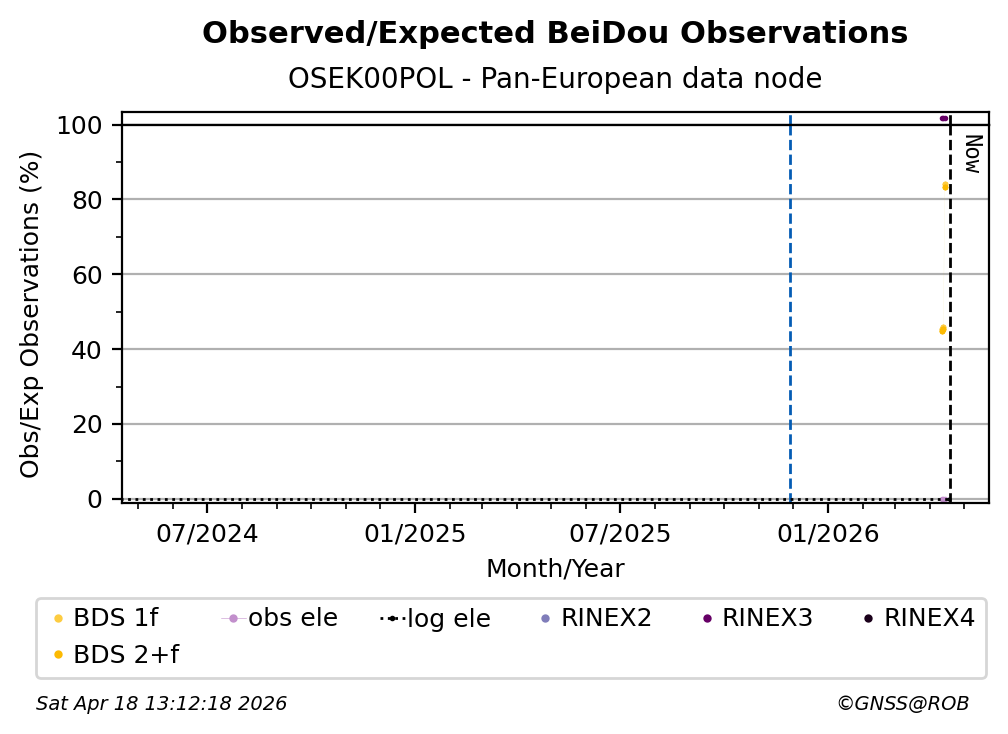 The percentage corresponds, for each constellation tracked by the station, to the ratio of the number of observations in the daily RINEX file with respect to the number of expected observations: