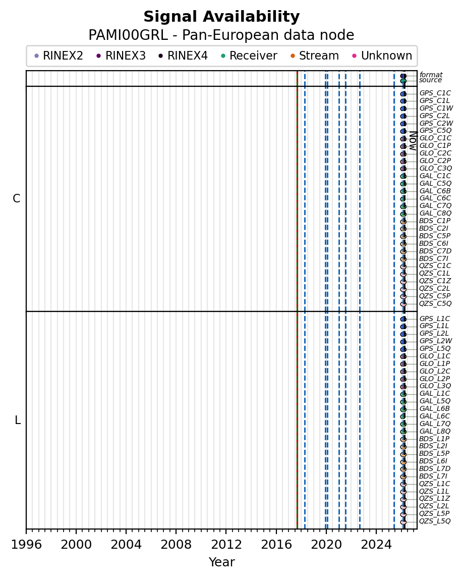 Red vertical lines, green and blue vertical dotted lines indicate respectively a change of antenna, receiver or receiver configuration (including firmware) as indicated by the station manager in the station site log available from the M3G GNSS Metadata Catalog. The purple points in the top of the plot indicate the daily RINEX data availability at the data node.
