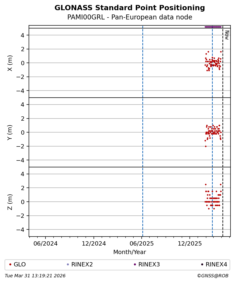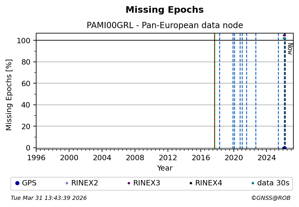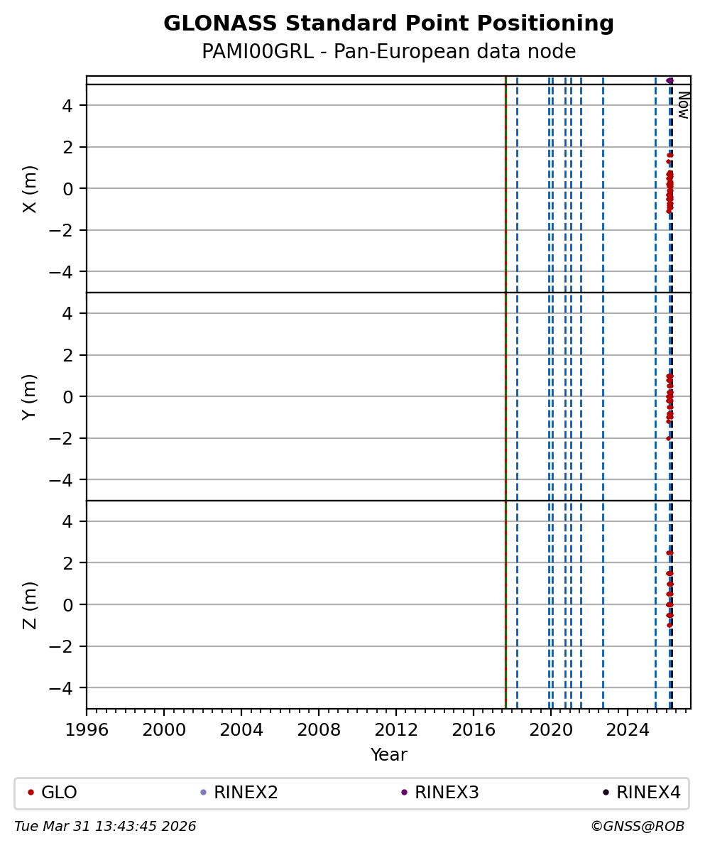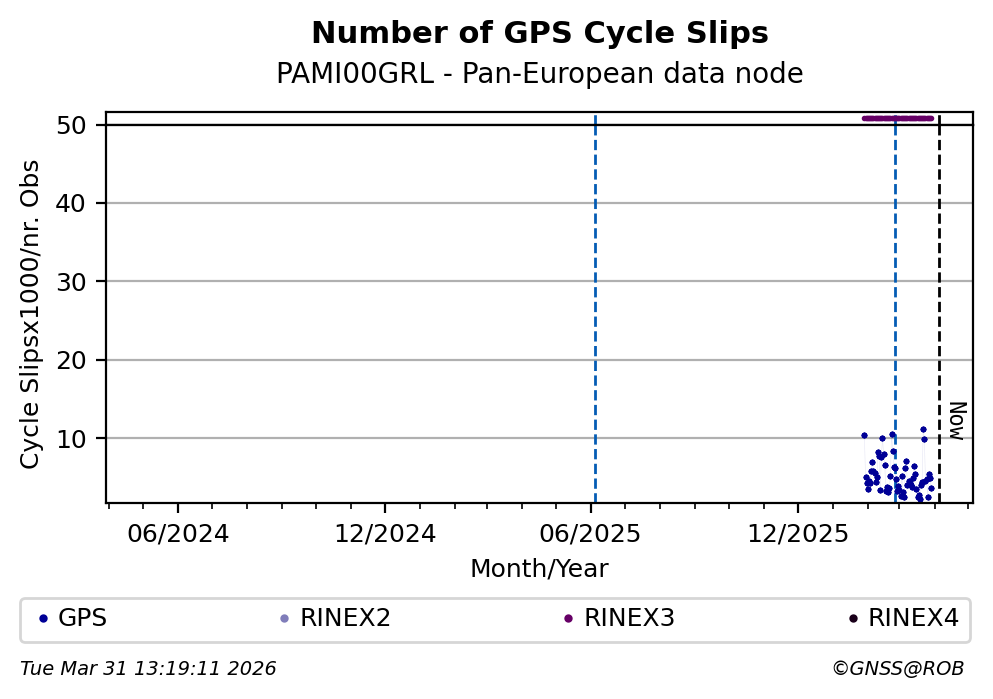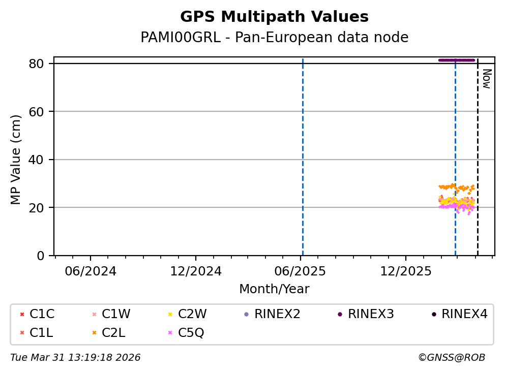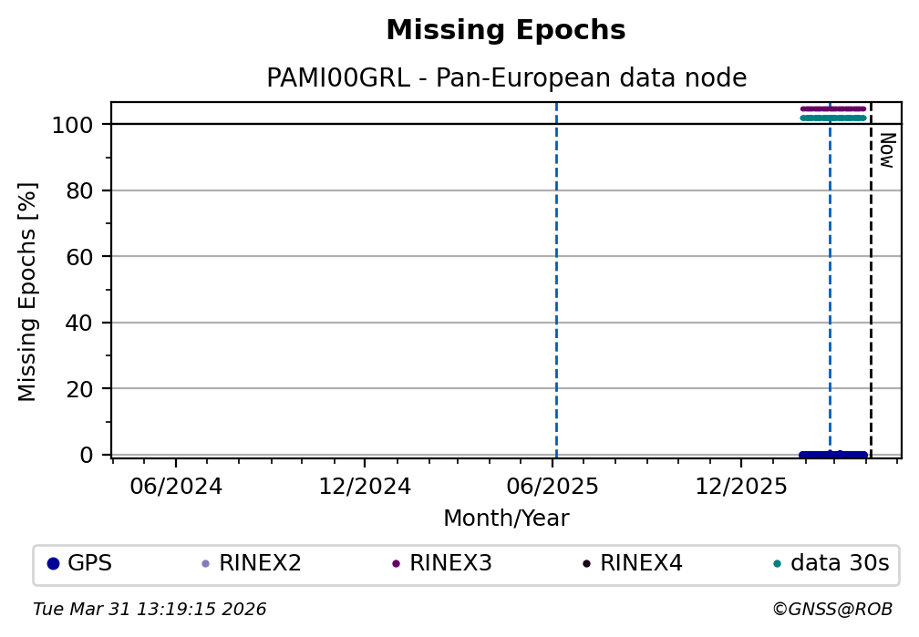 The plots below present the long-term tracking performance of the EPOS-GNSS station PAMI00GRL based on the daily RINEX data available from the Pan-European EPOS-GNSS data node. The data quality metrics have been computed at the data node using the G-Nut/Anubis software.
