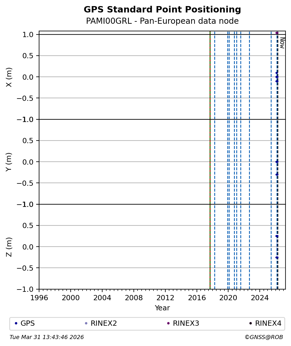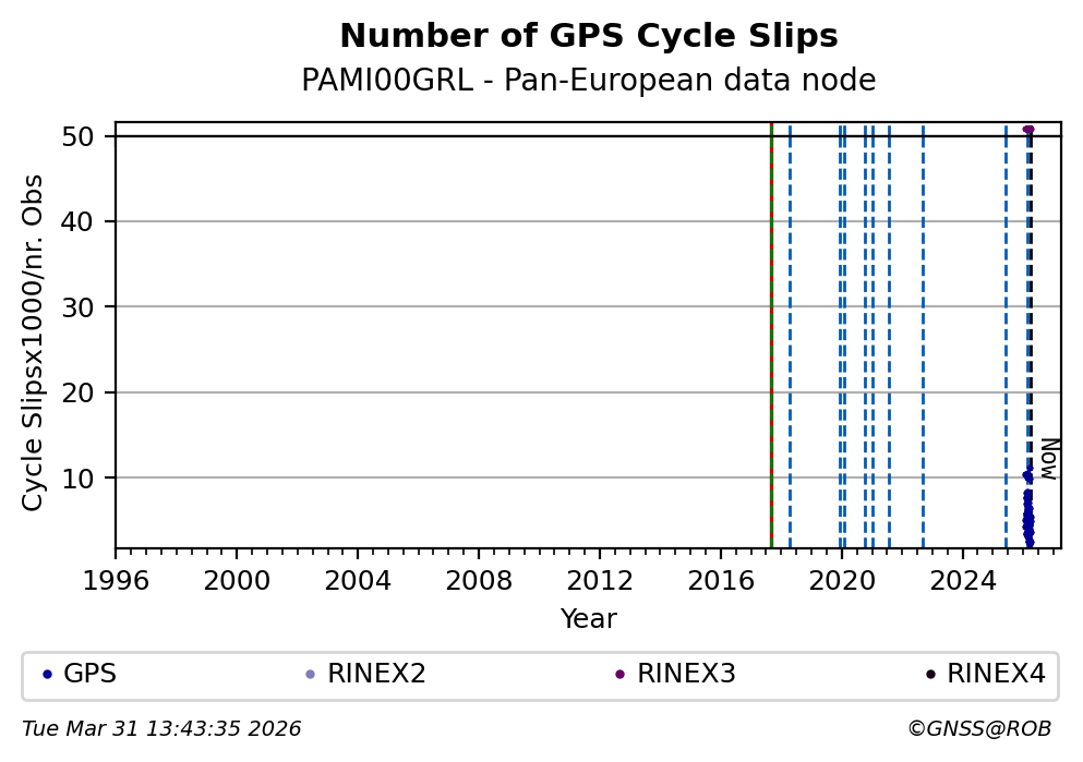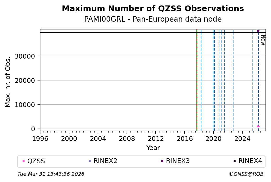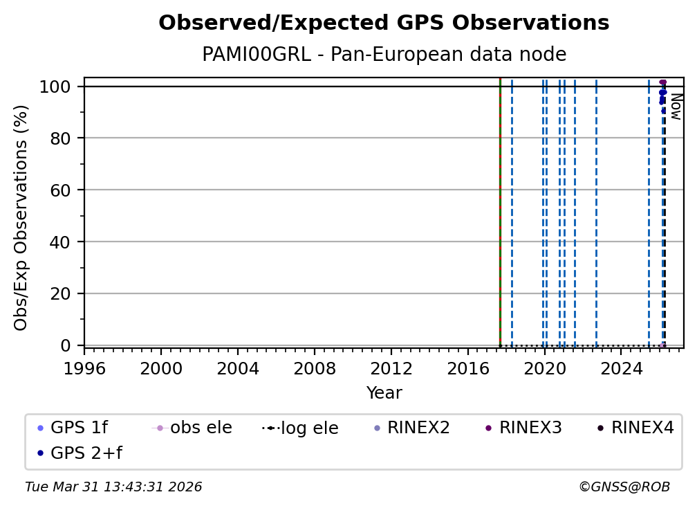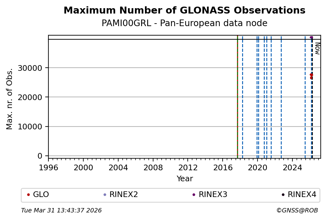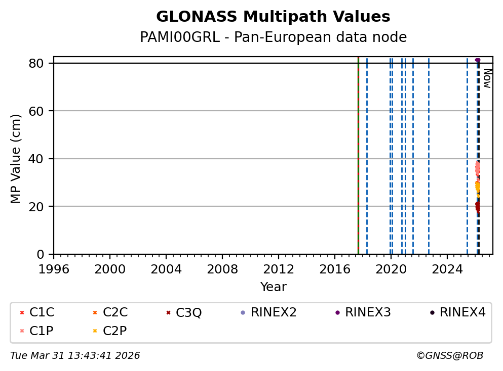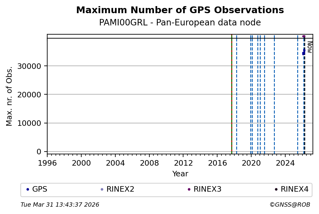 The plots below present the long-term tracking performance of the EPOS-GNSS station PAMI00GRL based on the daily RINEX data available from the Pan-European EPOS-GNSS data node. The data quality metrics have been computed at the data node using the G-Nut/Anubis software.
