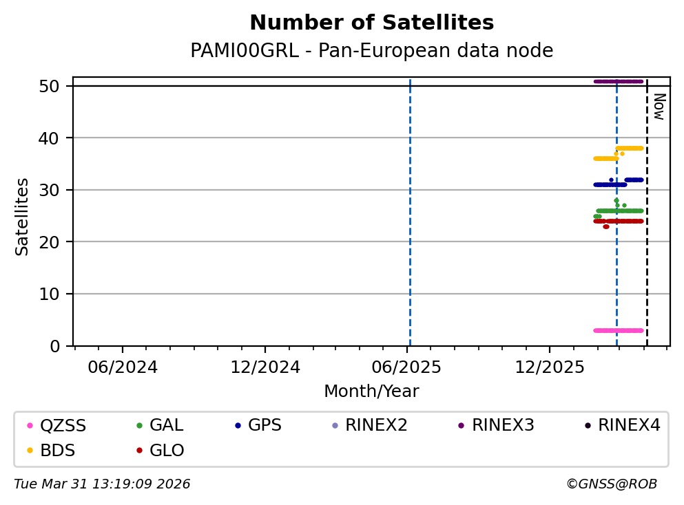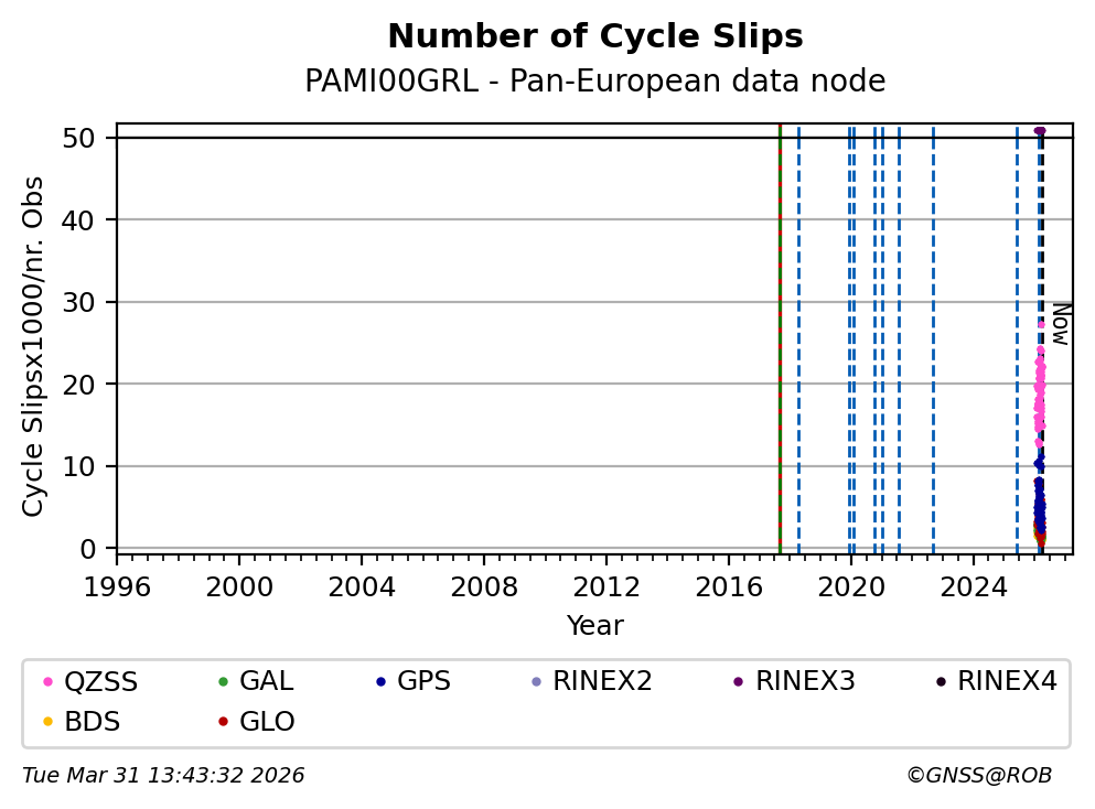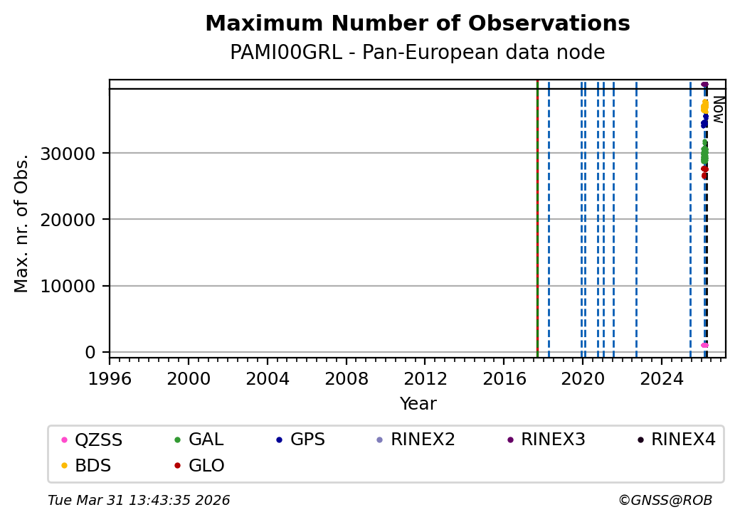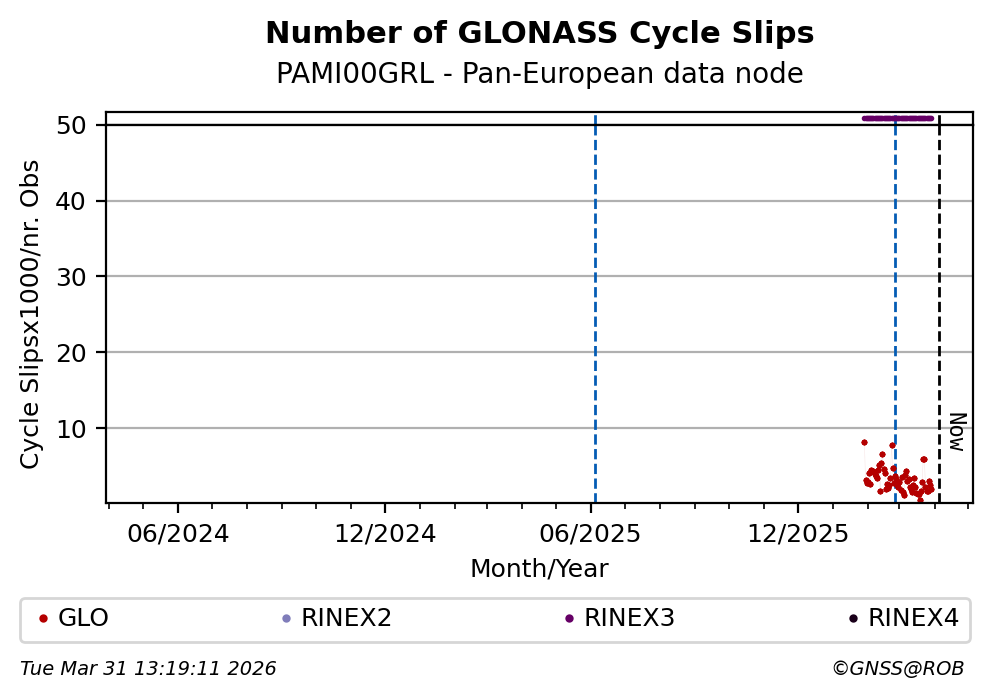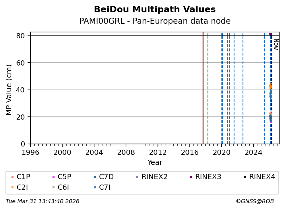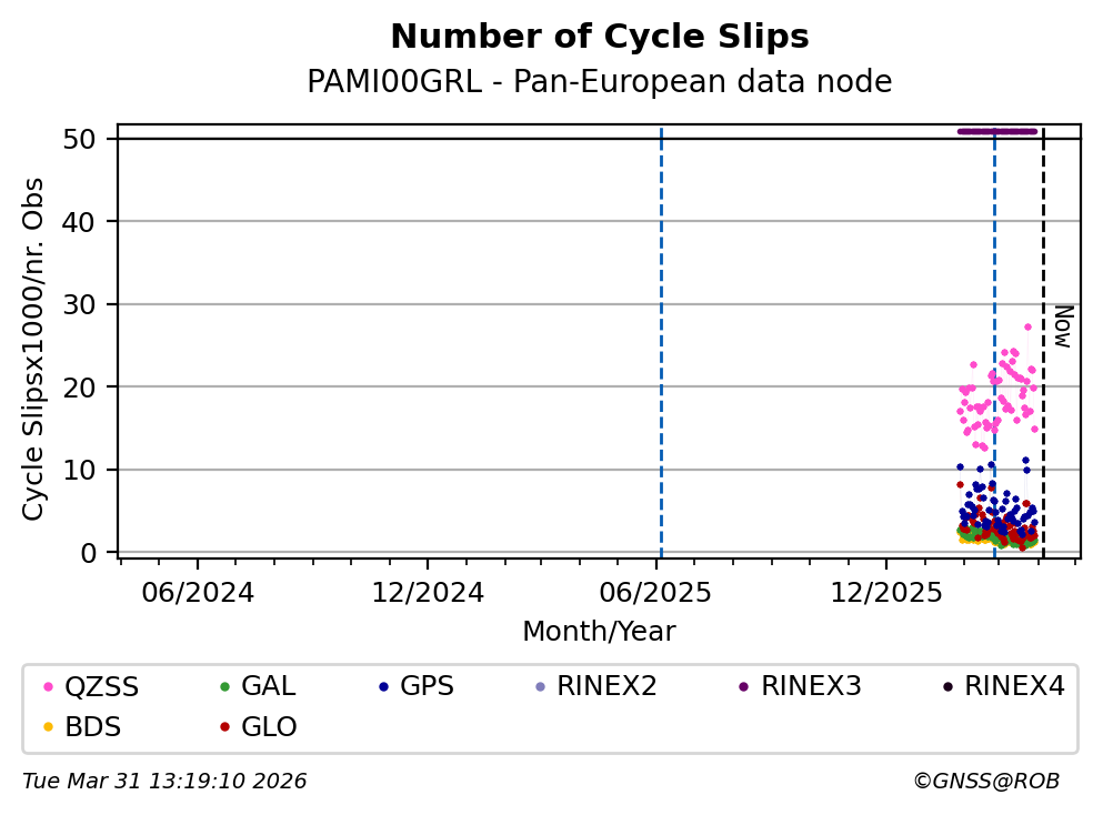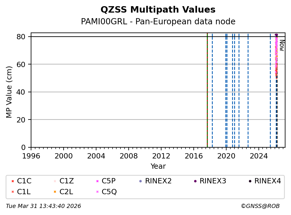 The plots below present the long-term tracking performance of the EPOS-GNSS station PAMI00GRL based on the daily RINEX data available from the Pan-European EPOS-GNSS data node. The data quality metrics have been computed at the data node using the G-Nut/Anubis software.