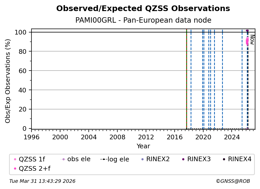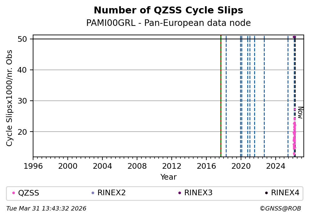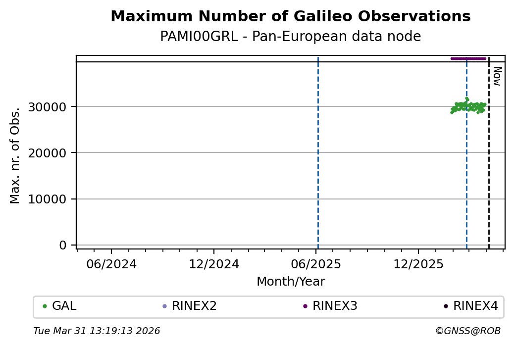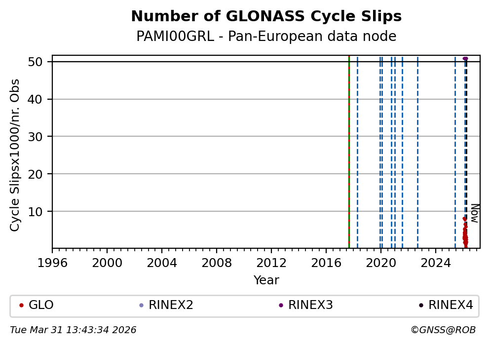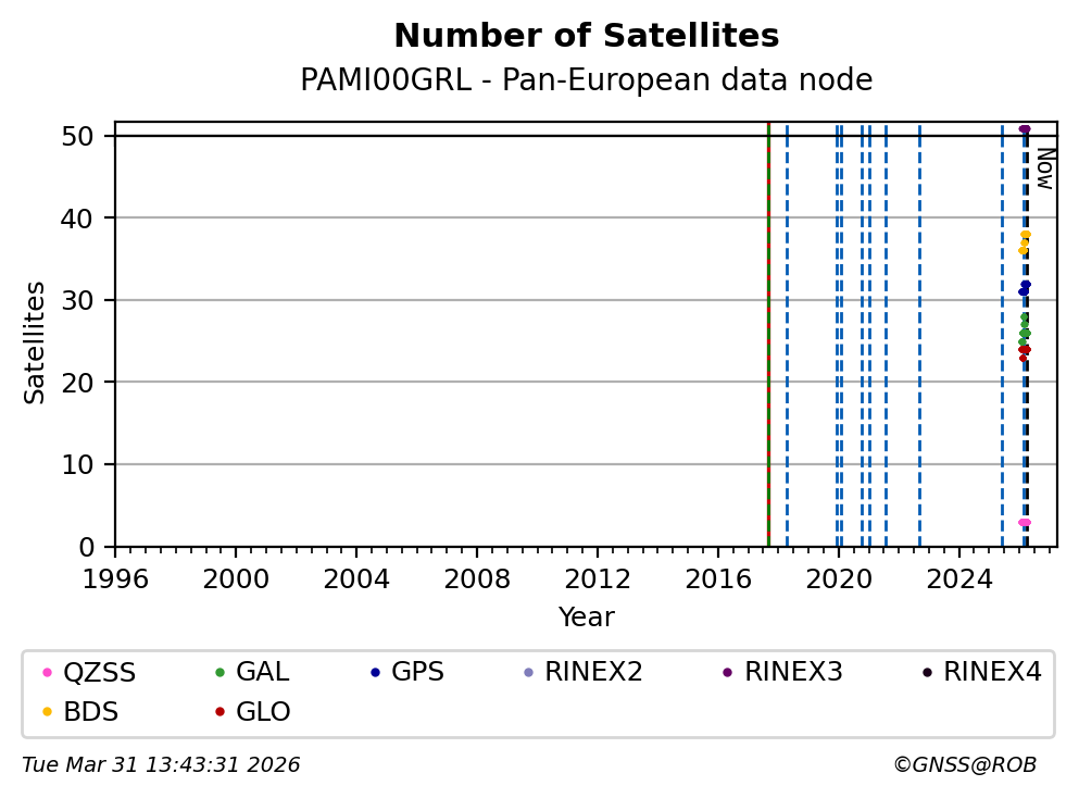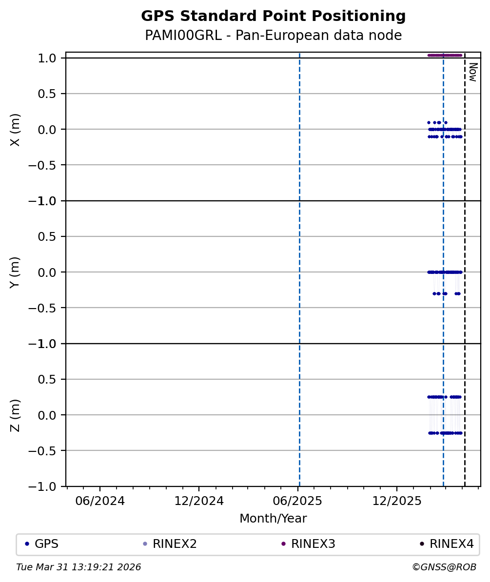 The plots below present the long-term tracking performance of the EPOS-GNSS station PAMI00GRL based on the daily RINEX data available from the Pan-European EPOS-GNSS data node. The data quality metrics have been computed at the data node using the G-Nut/Anubis software.