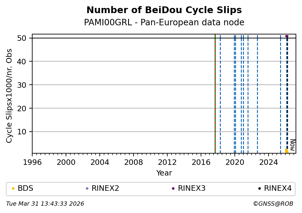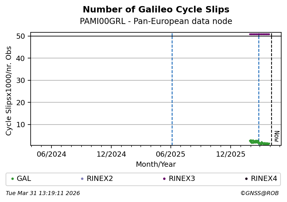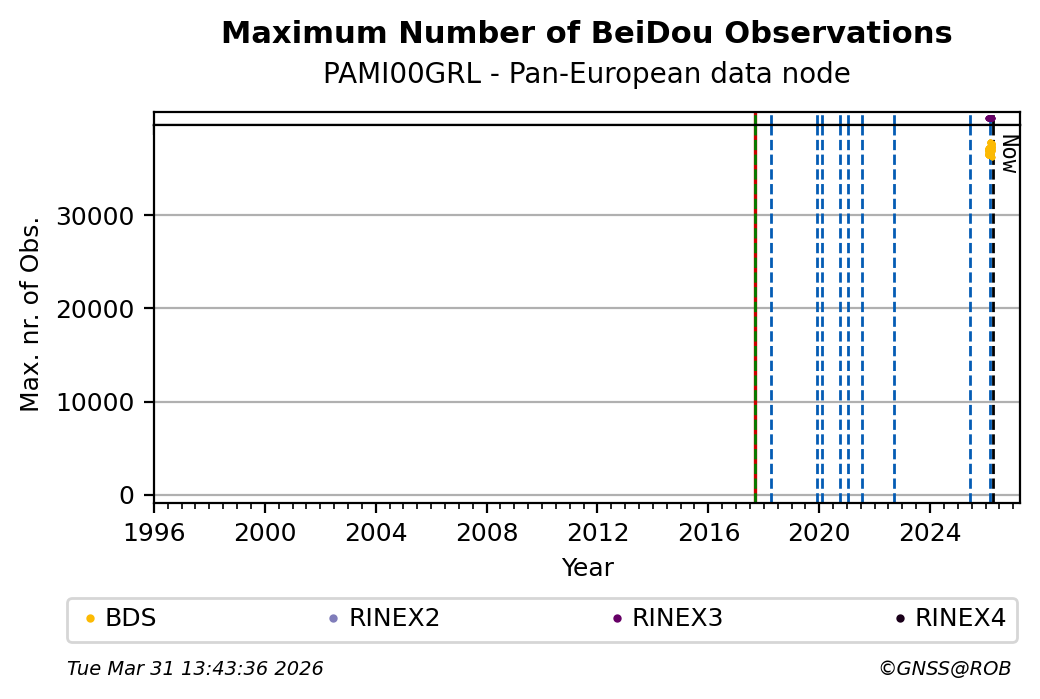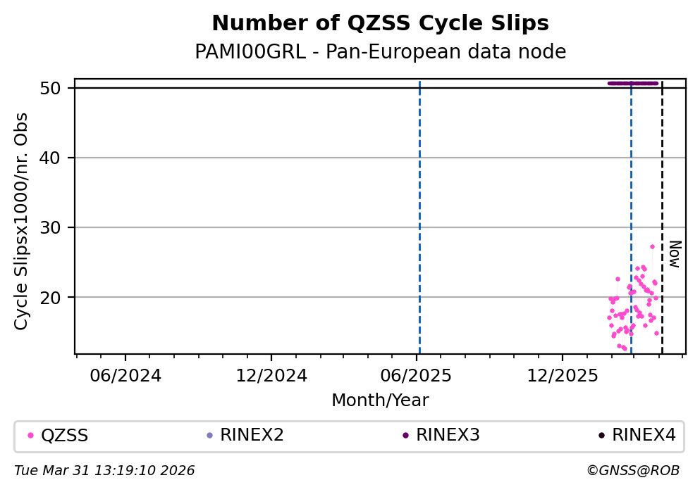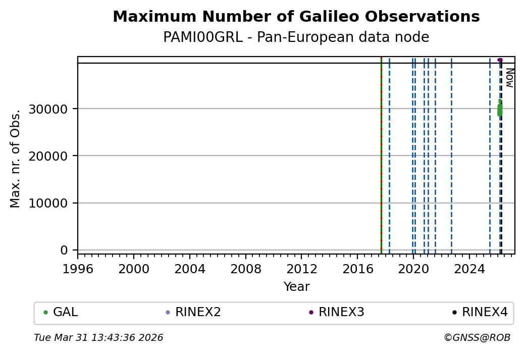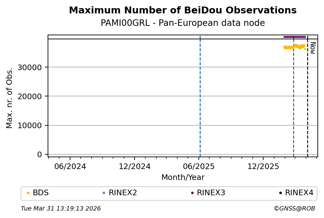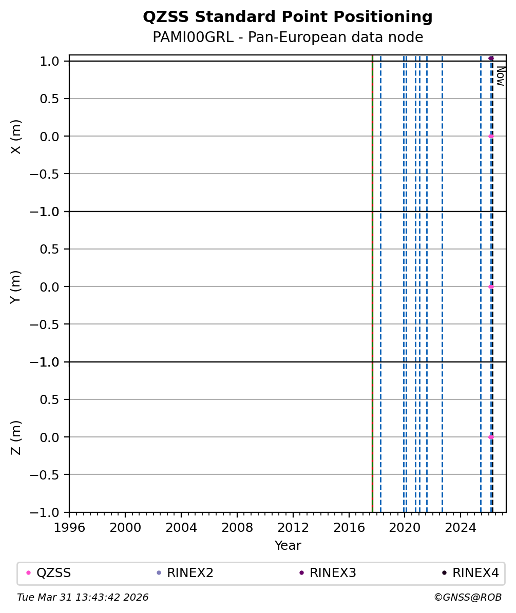 The plots below present the long-term tracking performance of the EPOS-GNSS station PAMI00GRL based on the daily RINEX data available from the Pan-European EPOS-GNSS data node. The data quality metrics have been computed at the data node using the G-Nut/Anubis software.