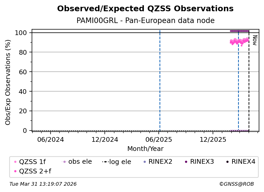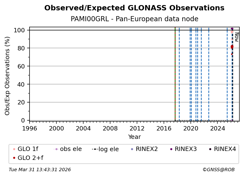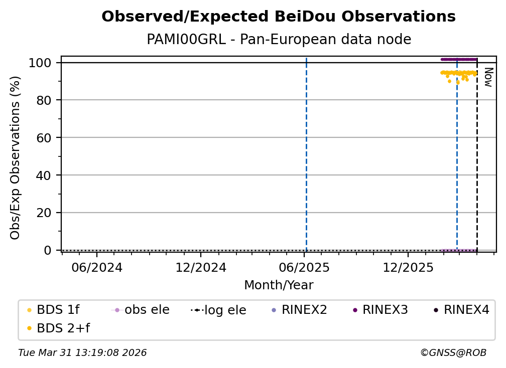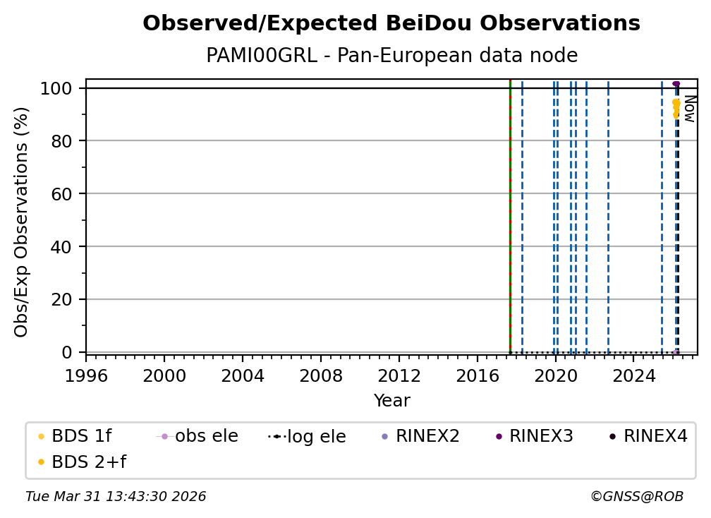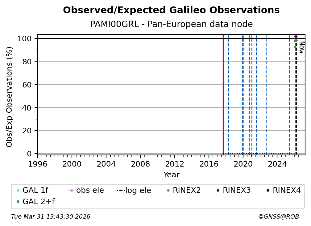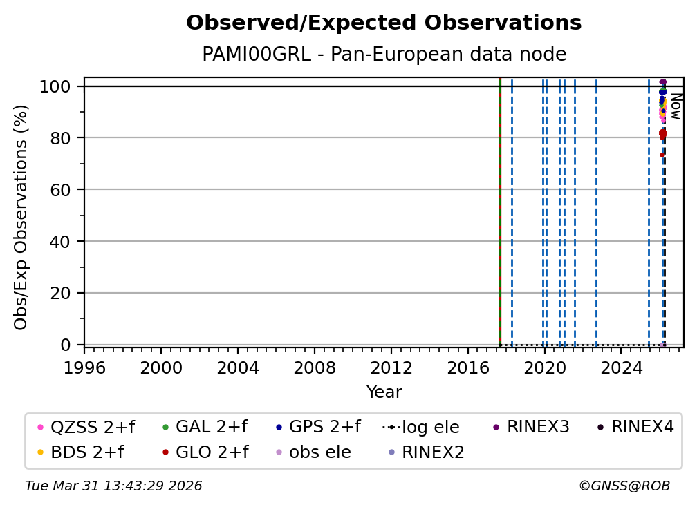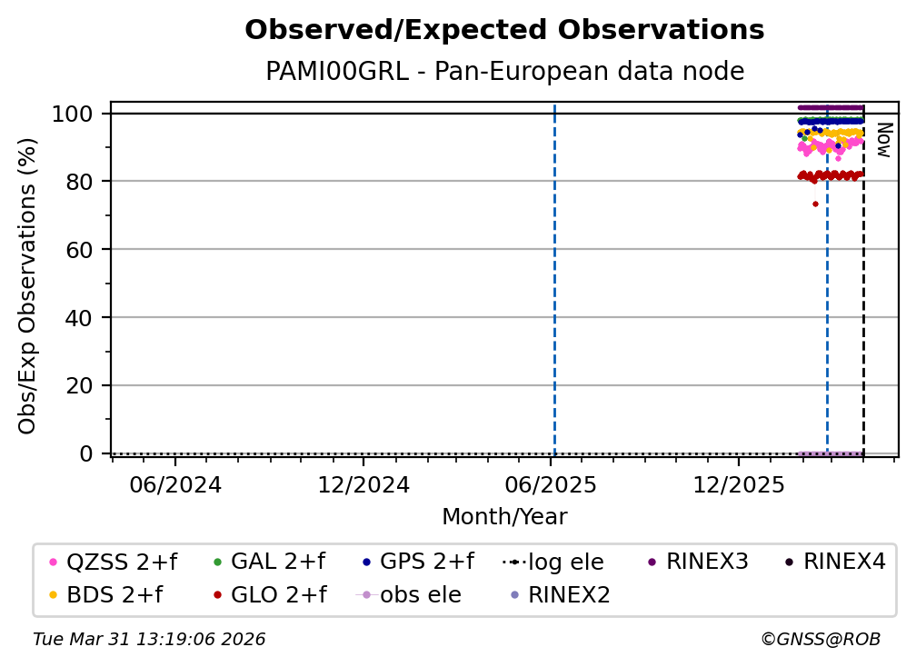 The percentage corresponds, for each constellation tracked by the station, to the ratio of the number of observations in the daily RINEX file with respect to the number of expected observations: