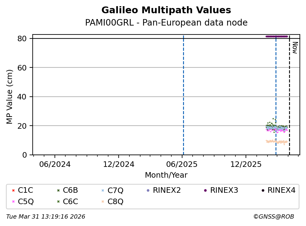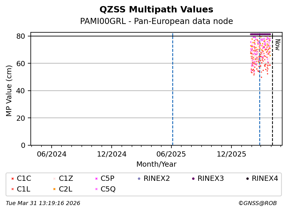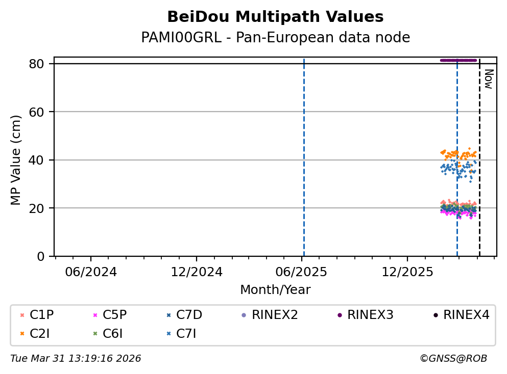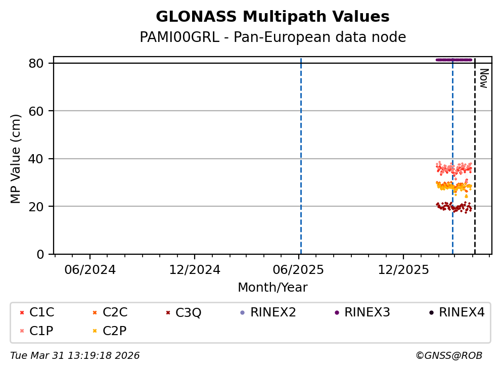 These plots display the daily mean of code multipath per frequency band and satellite constellation. Code multipath statistics are calculated for all pseudorange codes of all GNSS satellites providing dual-frequency carrier-phase observations. The code multipath characterizes the quality of the observed signal and the site environment.