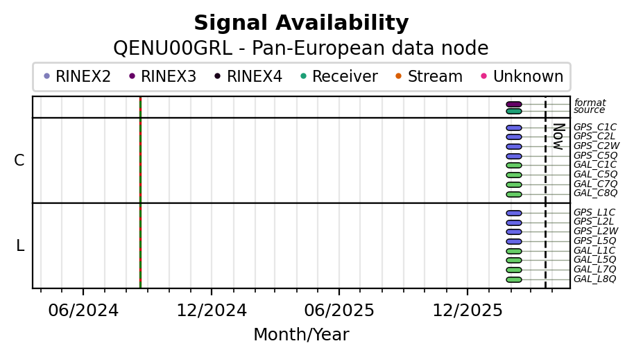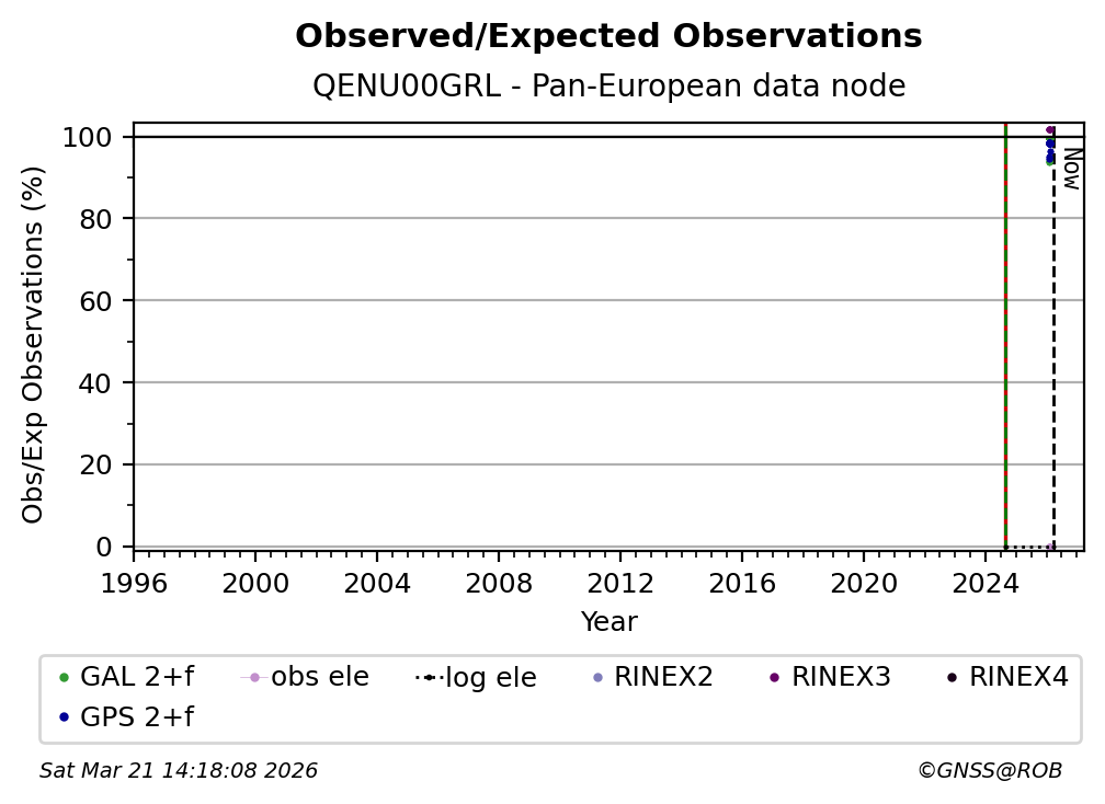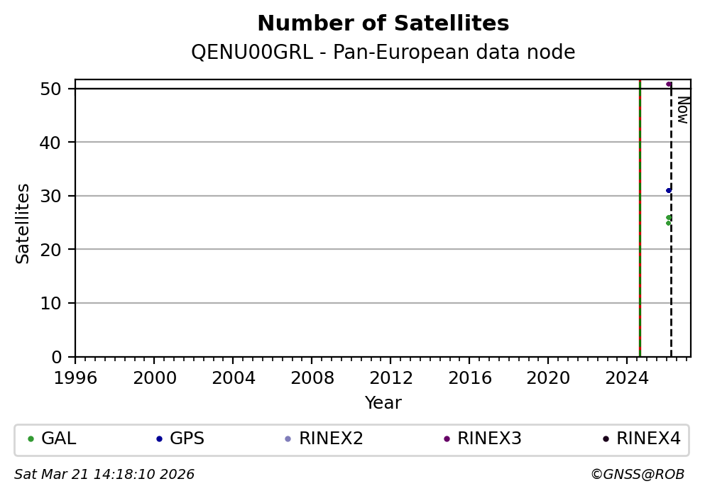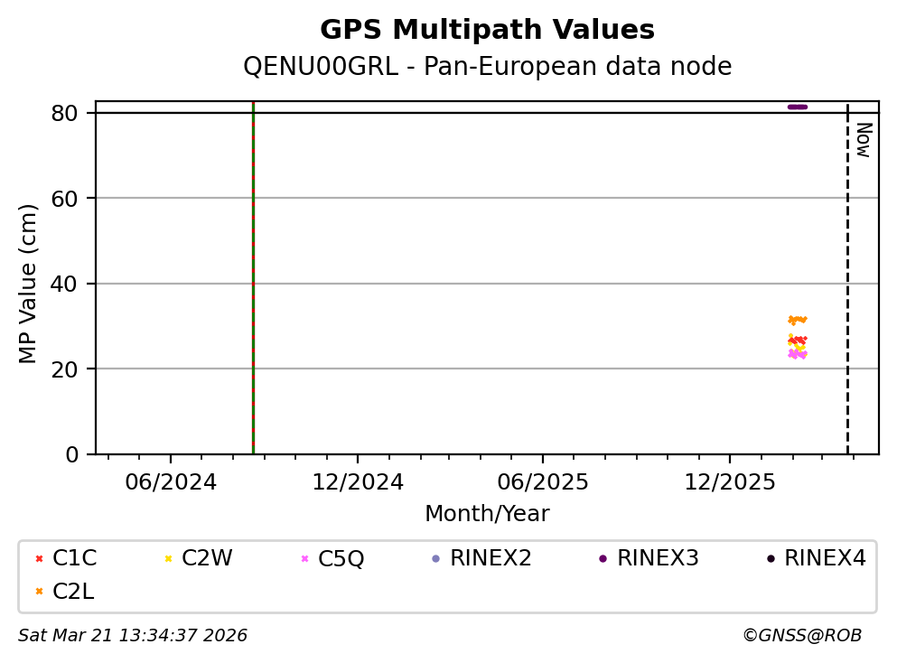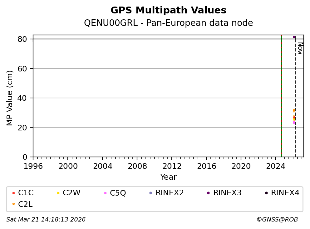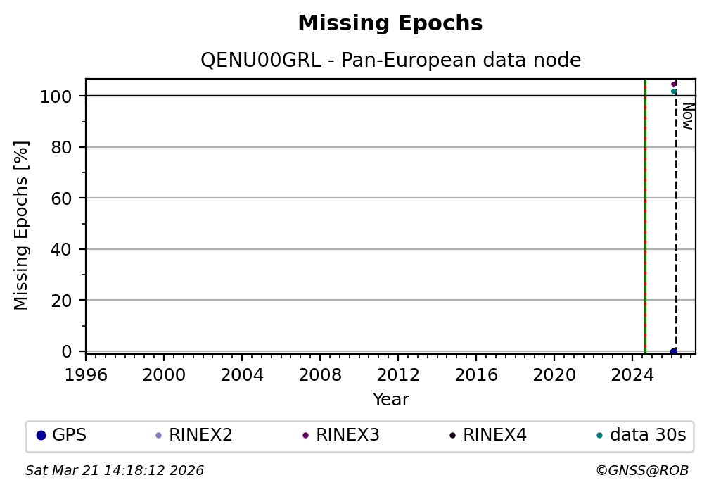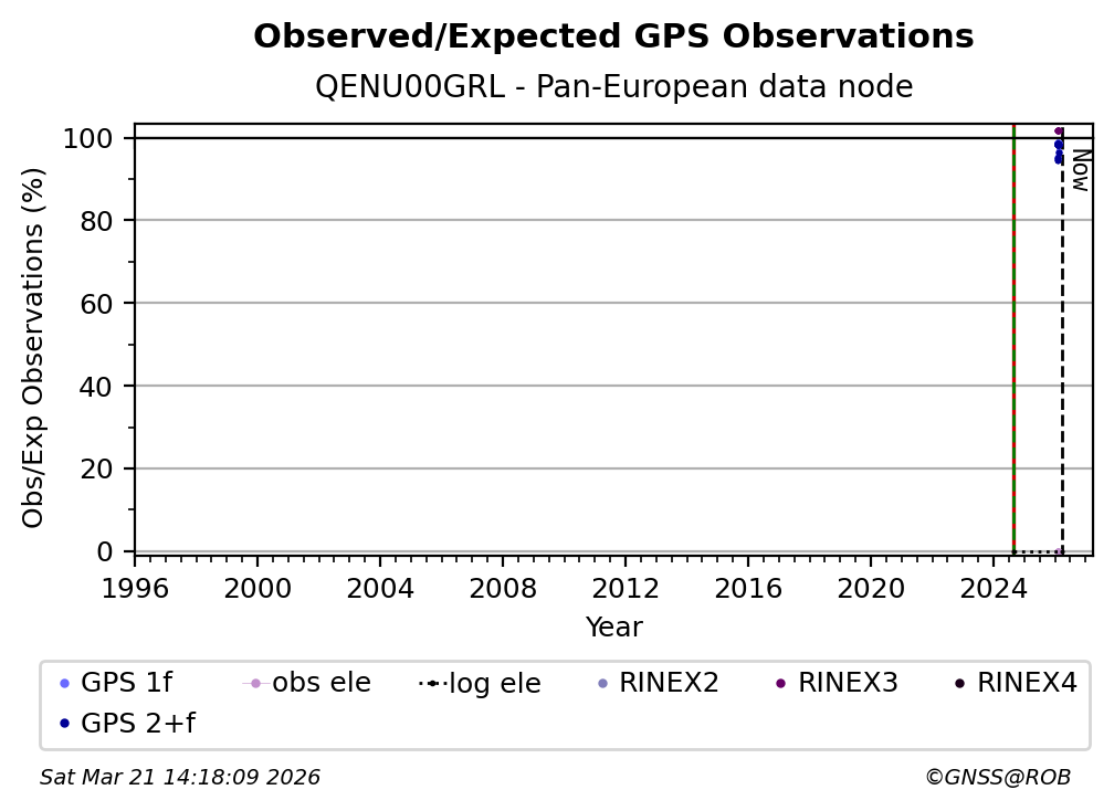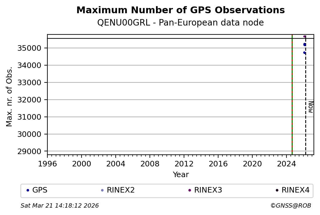 The plots below present the long-term tracking performance of the EPOS-GNSS station QENU00GRL based on the daily RINEX data available from the Pan-European EPOS-GNSS data node. The data quality metrics have been computed at the data node using the G-Nut/Anubis software.