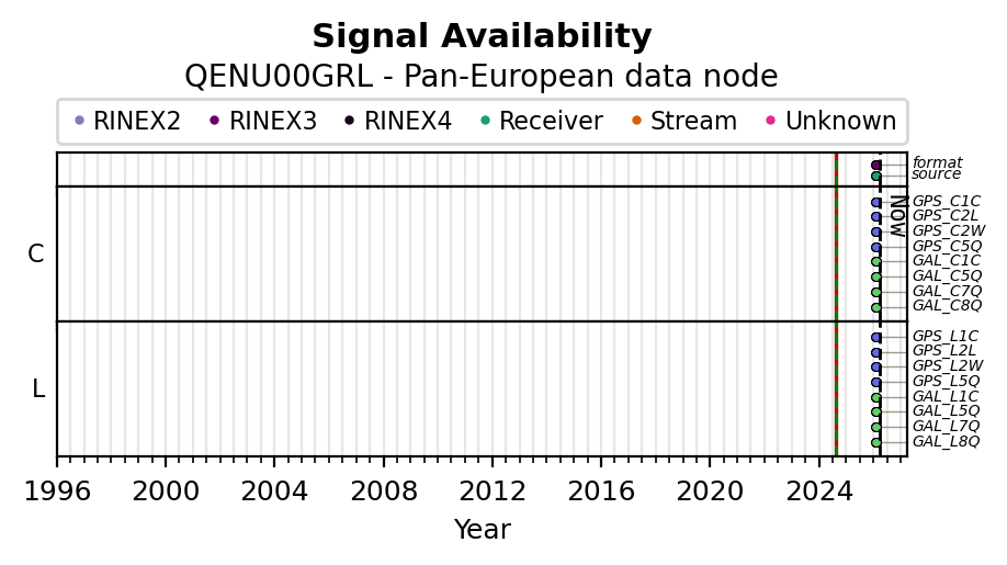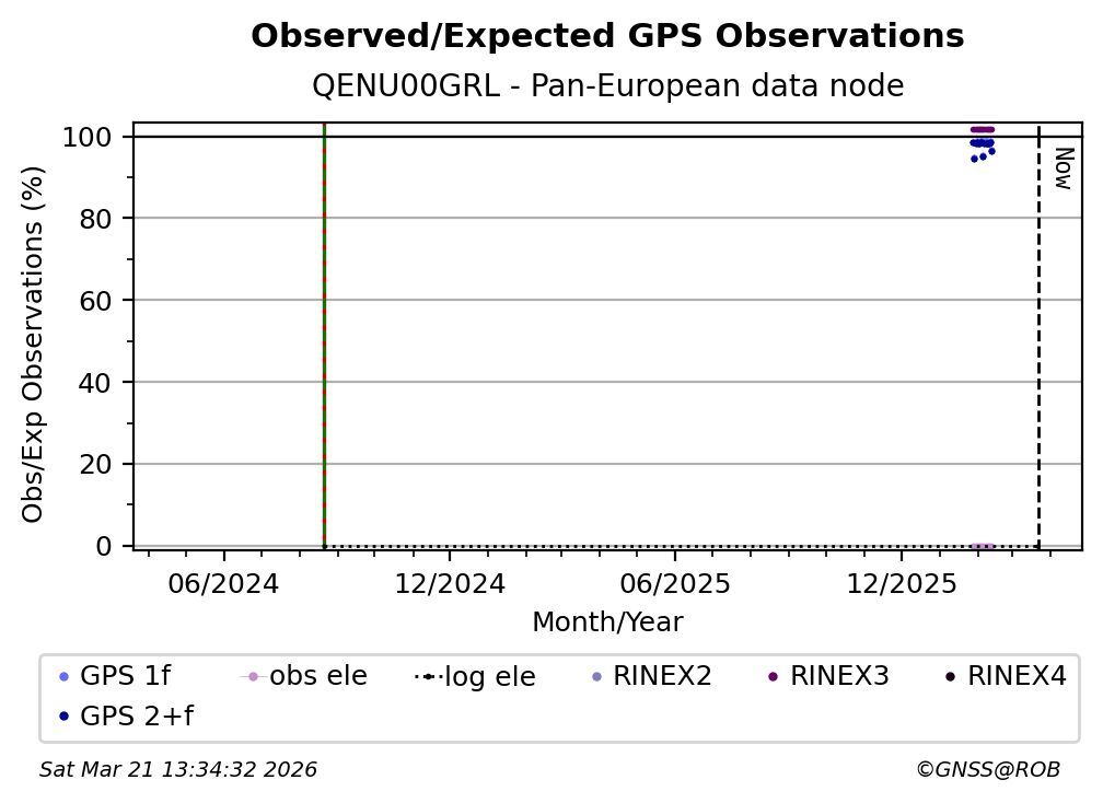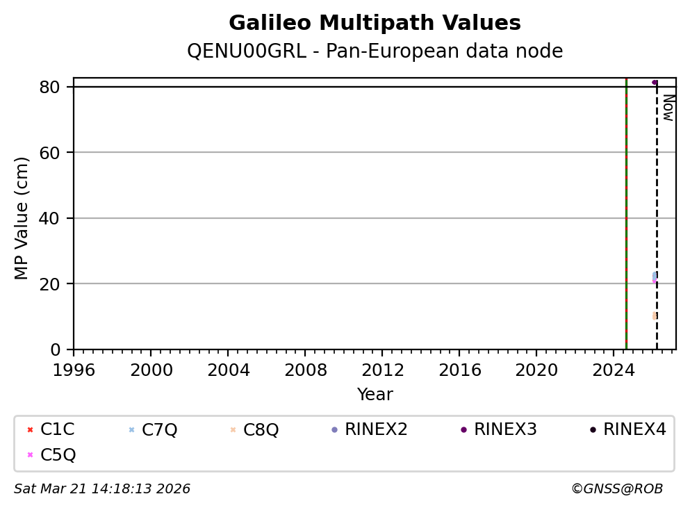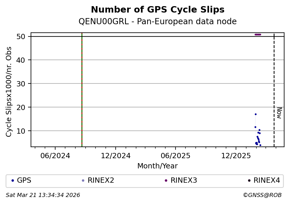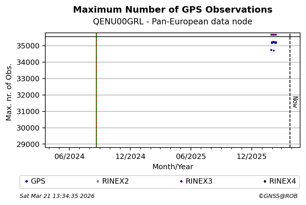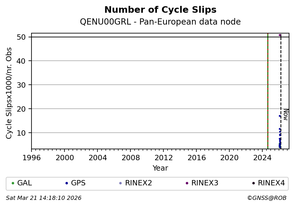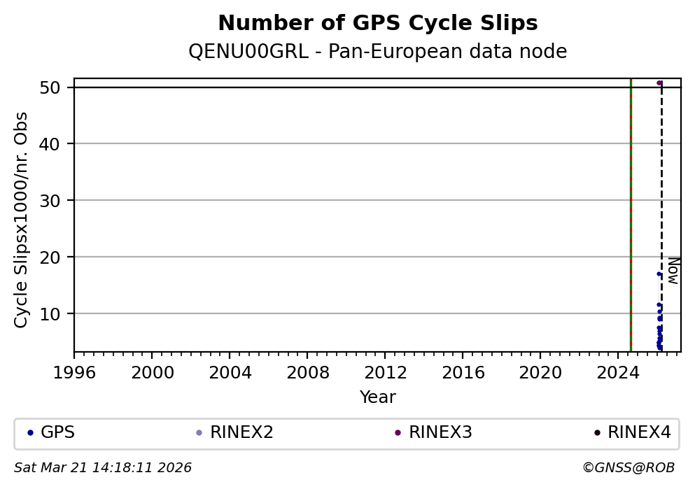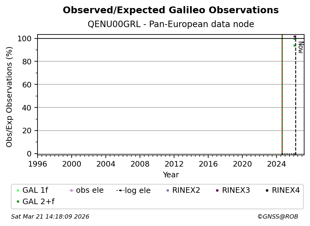 The plots below present the long-term tracking performance of the EPOS-GNSS station QENU00GRL based on the daily RINEX data available from the Pan-European EPOS-GNSS data node. The data quality metrics have been computed at the data node using the G-Nut/Anubis software.