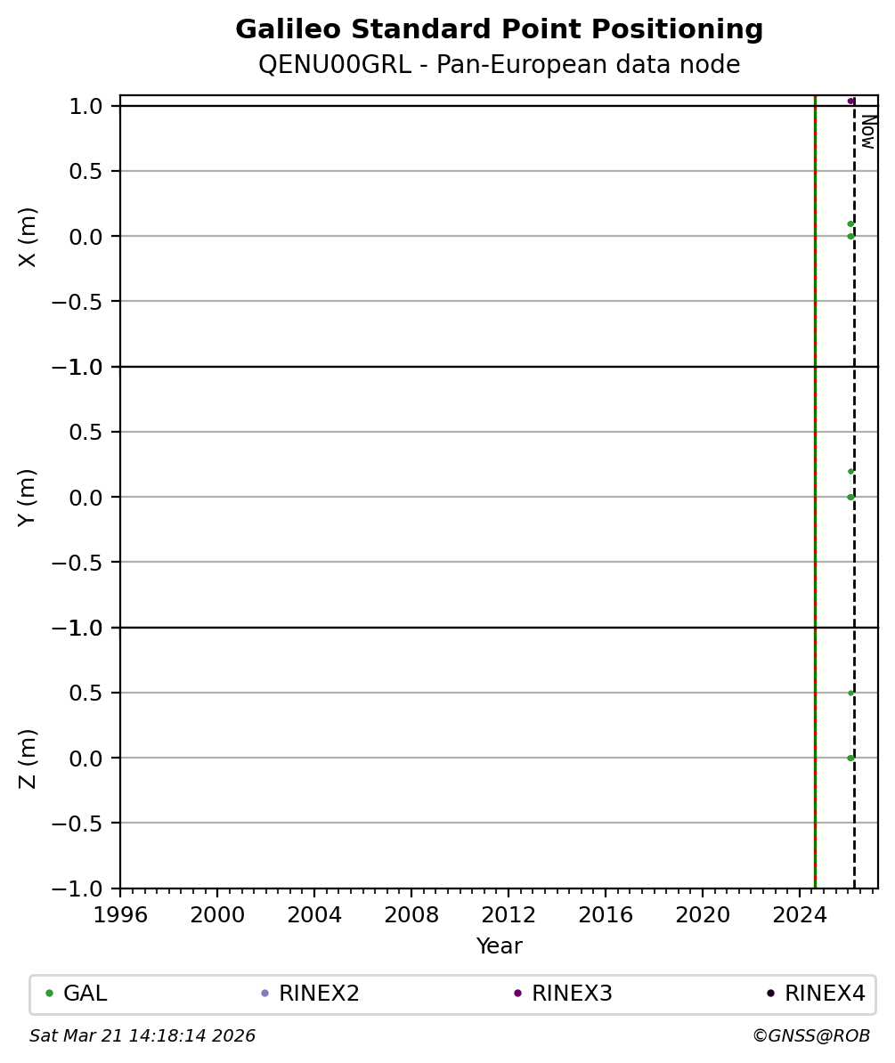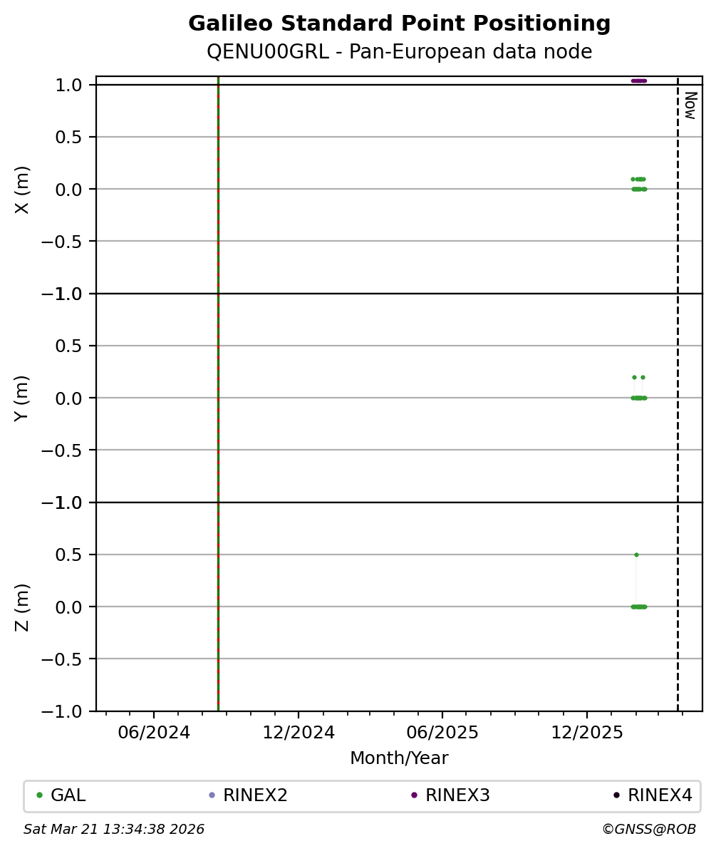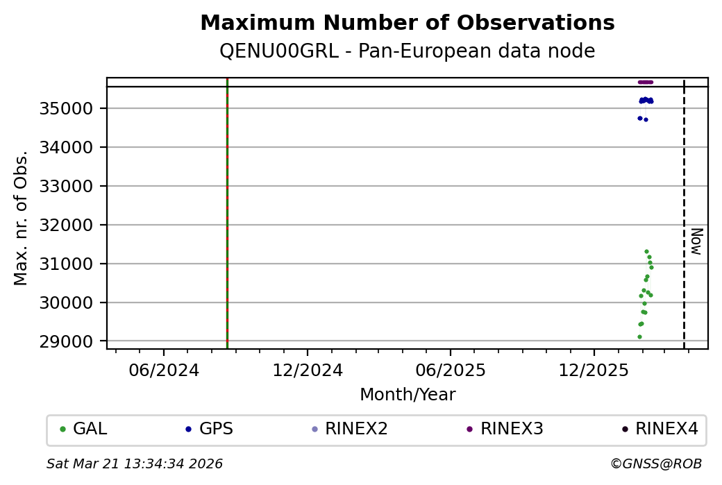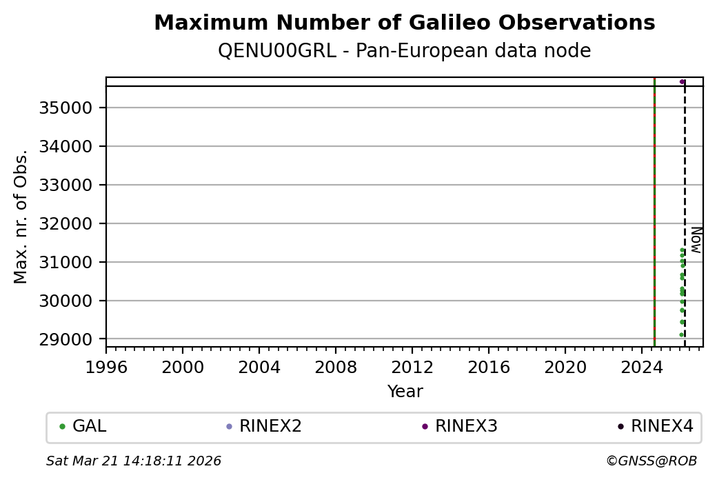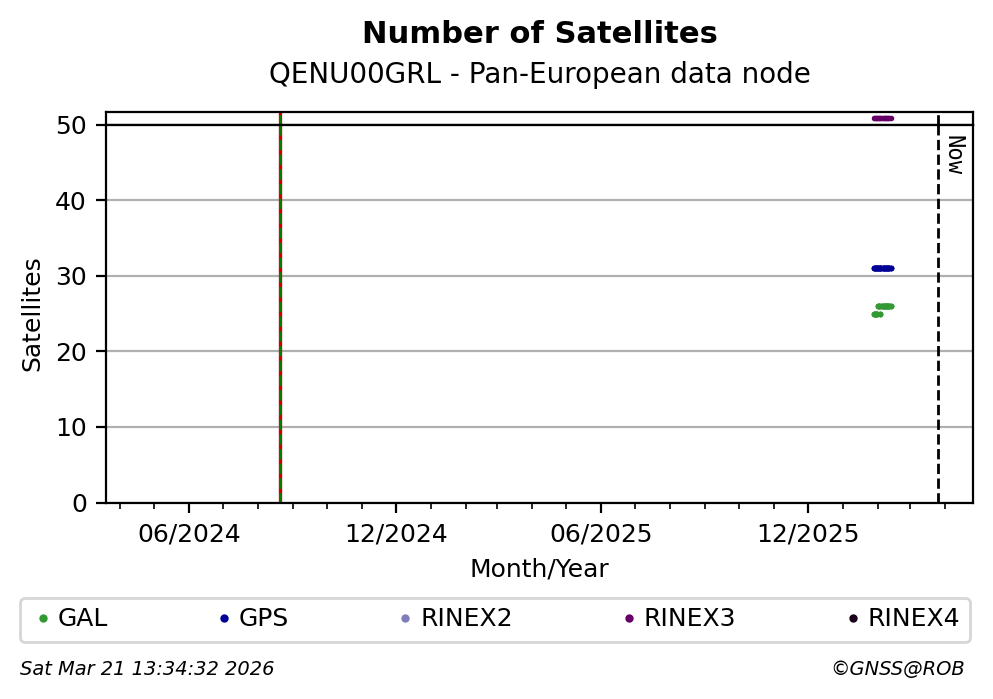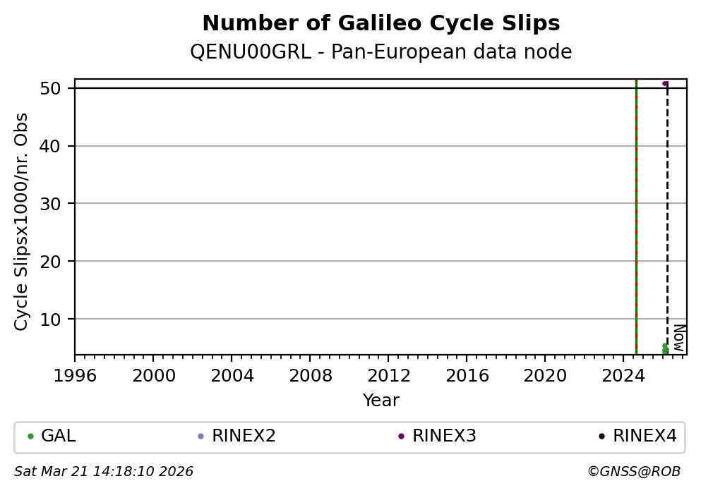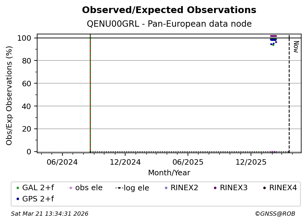 The plots below present the long-term tracking performance of the EPOS-GNSS station QENU00GRL based on the daily RINEX data available from the Pan-European EPOS-GNSS data node. The data quality metrics have been computed at the data node using the G-Nut/Anubis software.