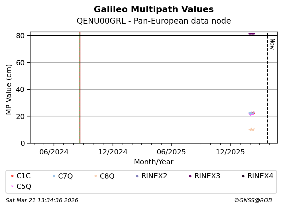 These plots display the daily mean of code multipath per frequency band and satellite constellation. Code multipath statistics are calculated for all pseudorange codes of all GNSS satellites providing dual-frequency carrier-phase observations. The code multipath characterizes the quality of the observed signal and the site environment.