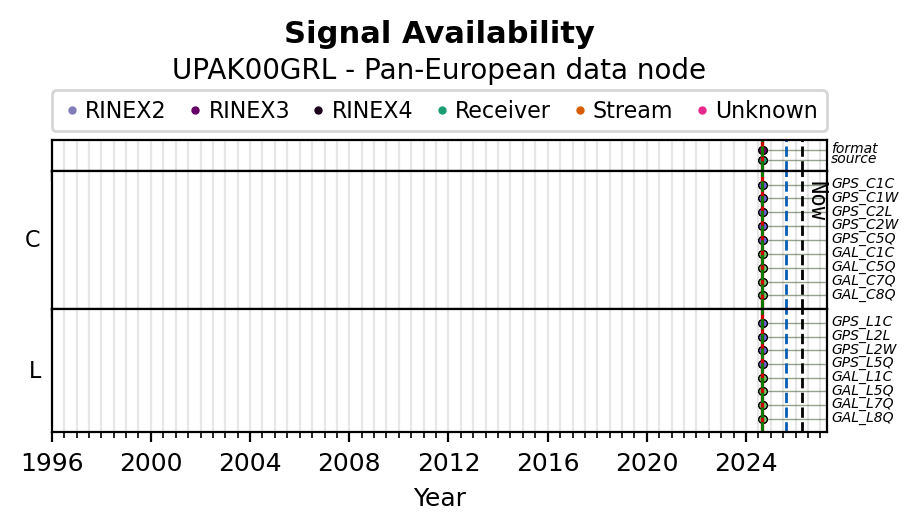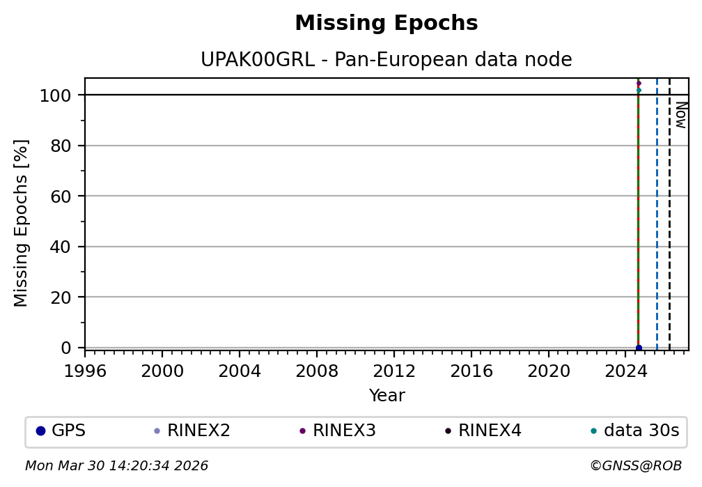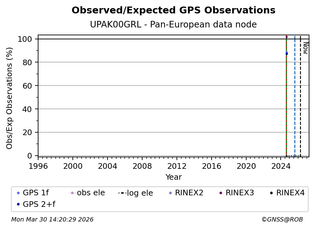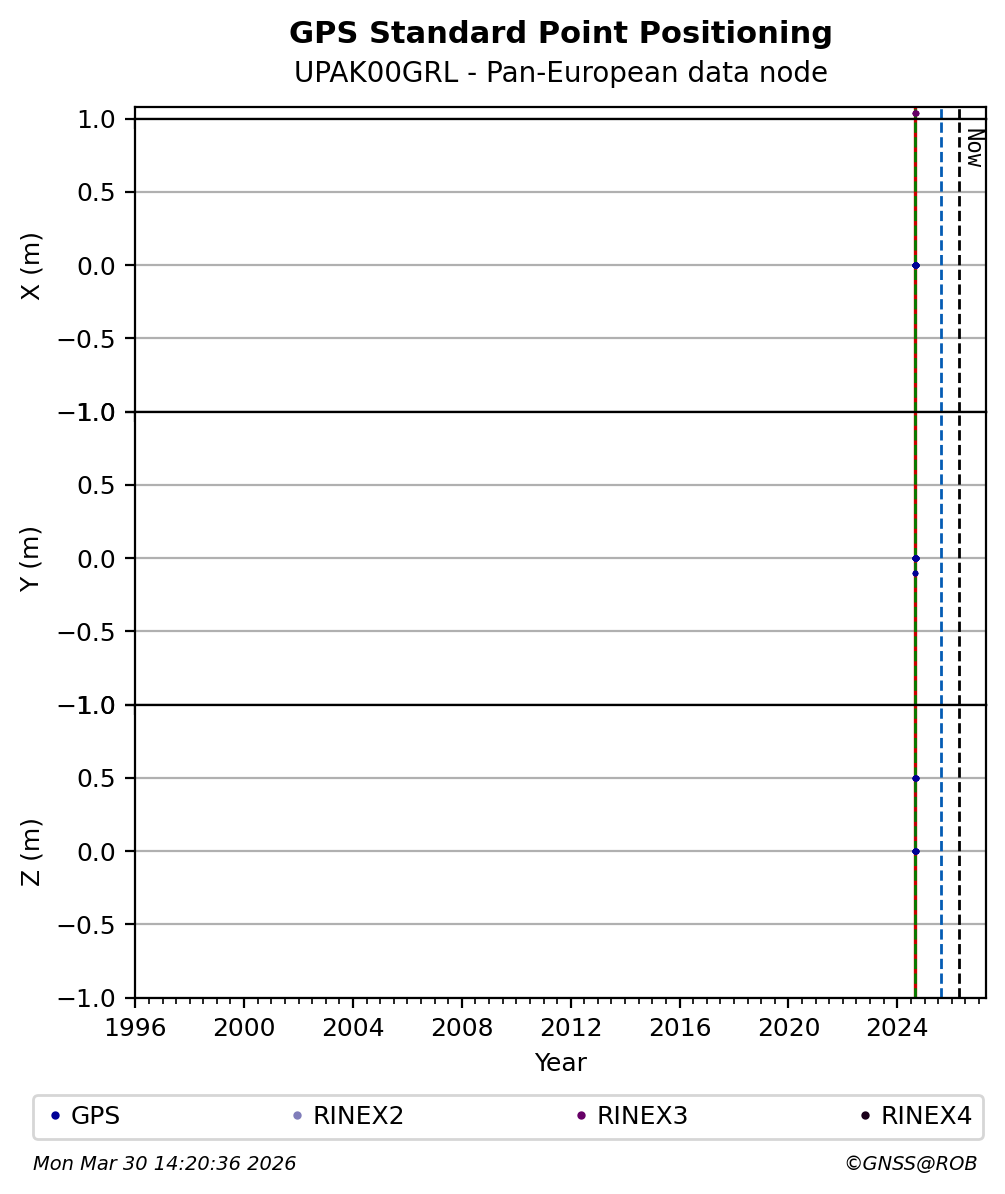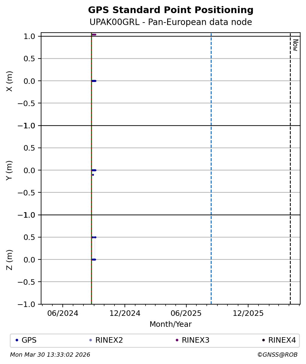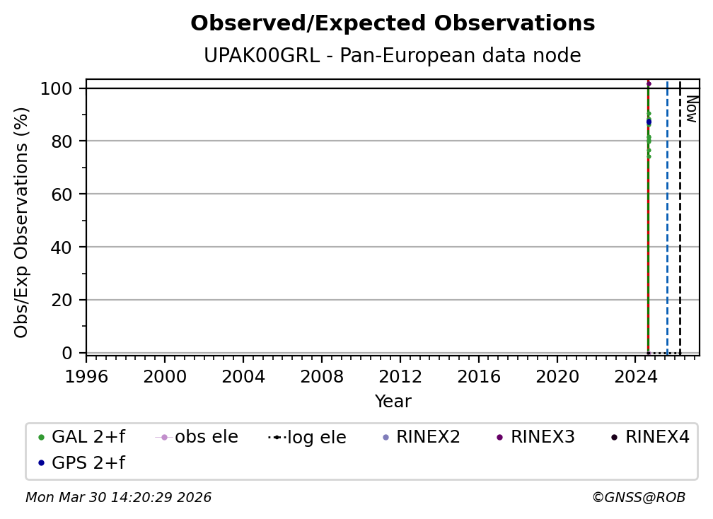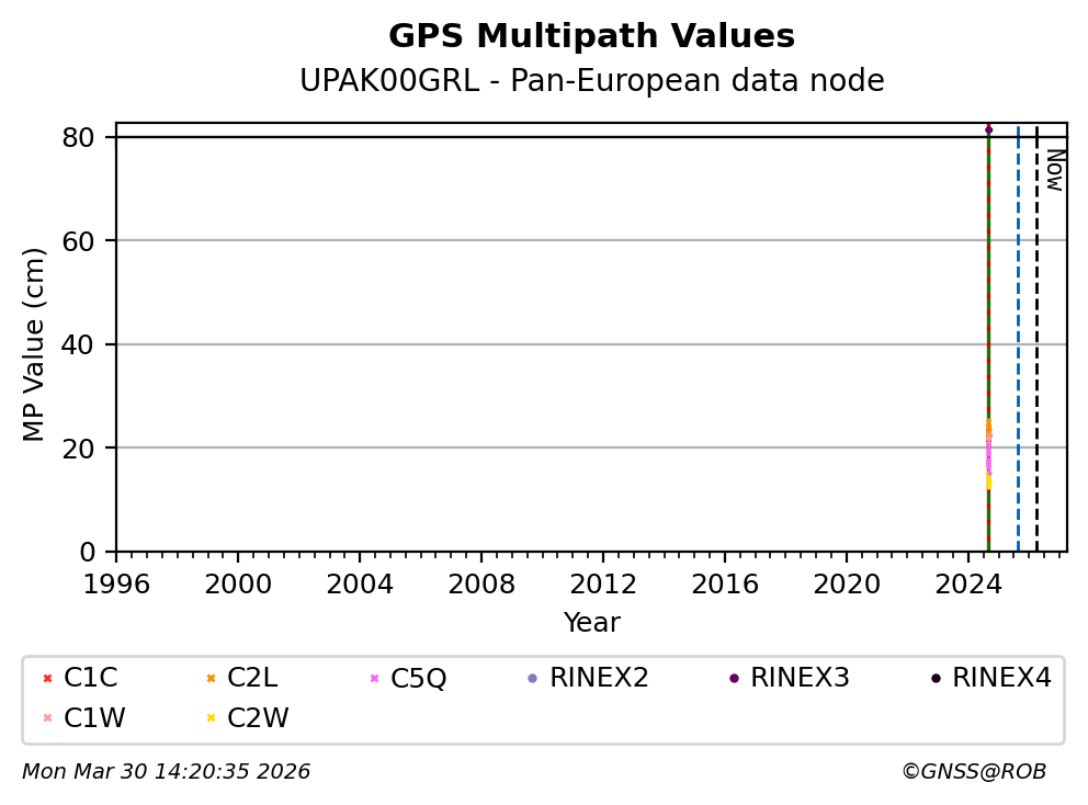 The plots below present the long-term tracking performance of the EPOS-GNSS station UPAK00GRL based on the daily RINEX data available from the Pan-European EPOS-GNSS data node. The data quality metrics have been computed at the data node using the G-Nut/Anubis software.