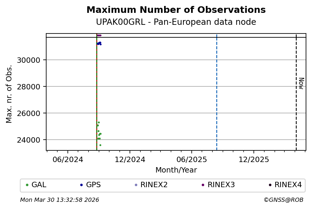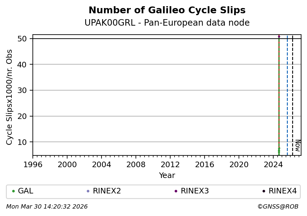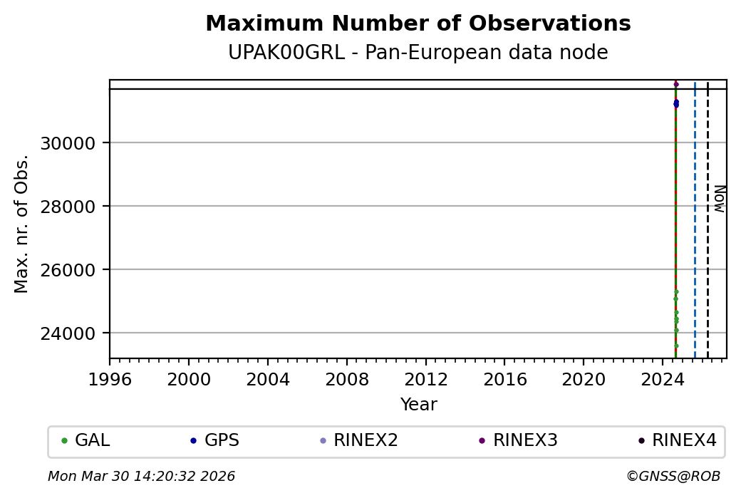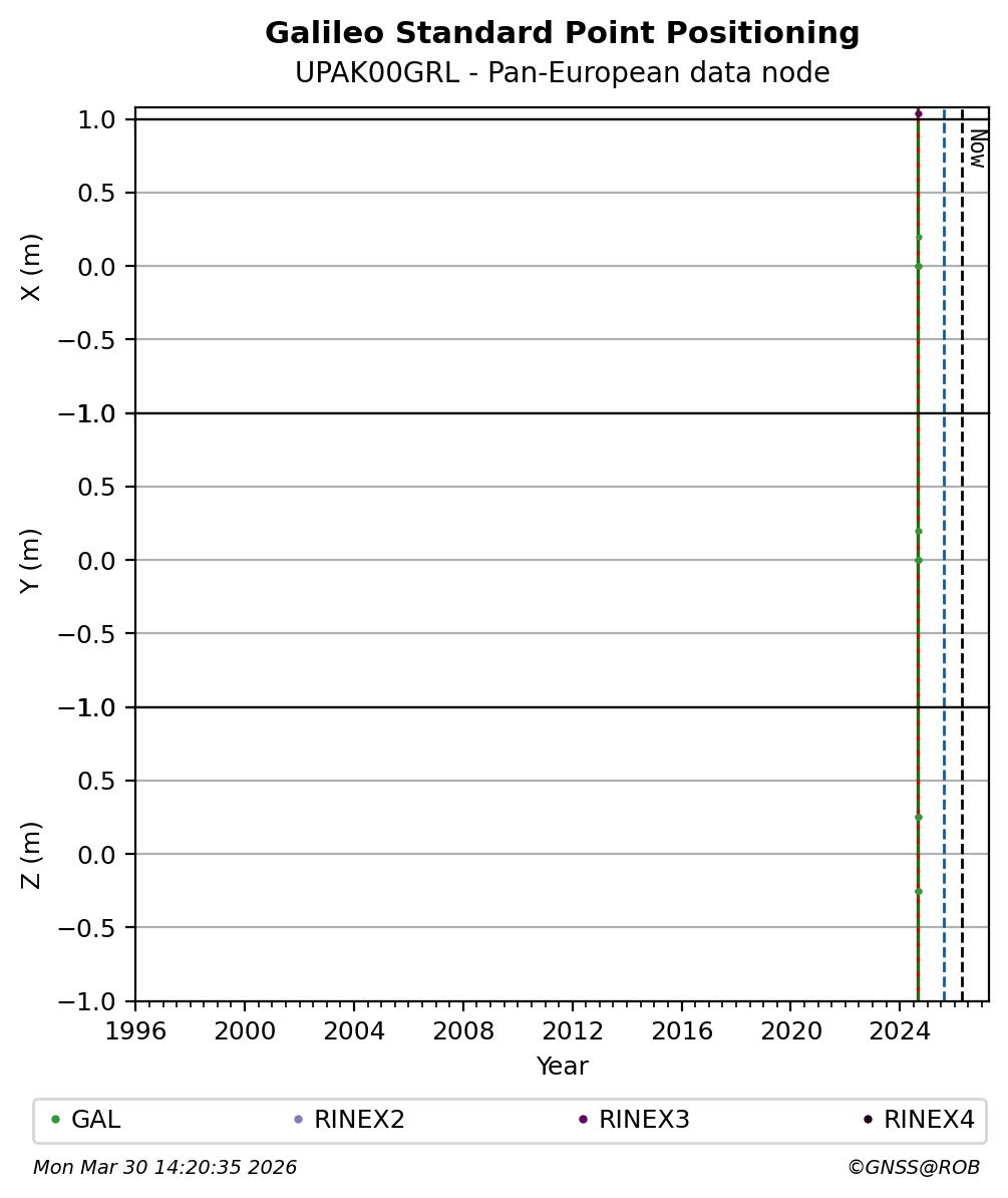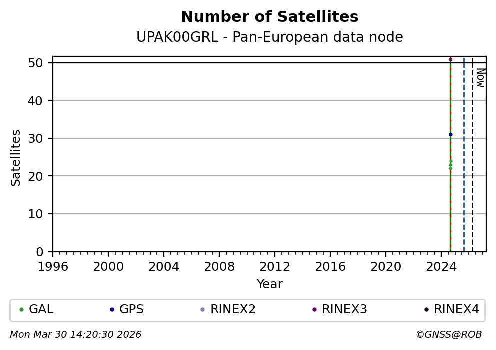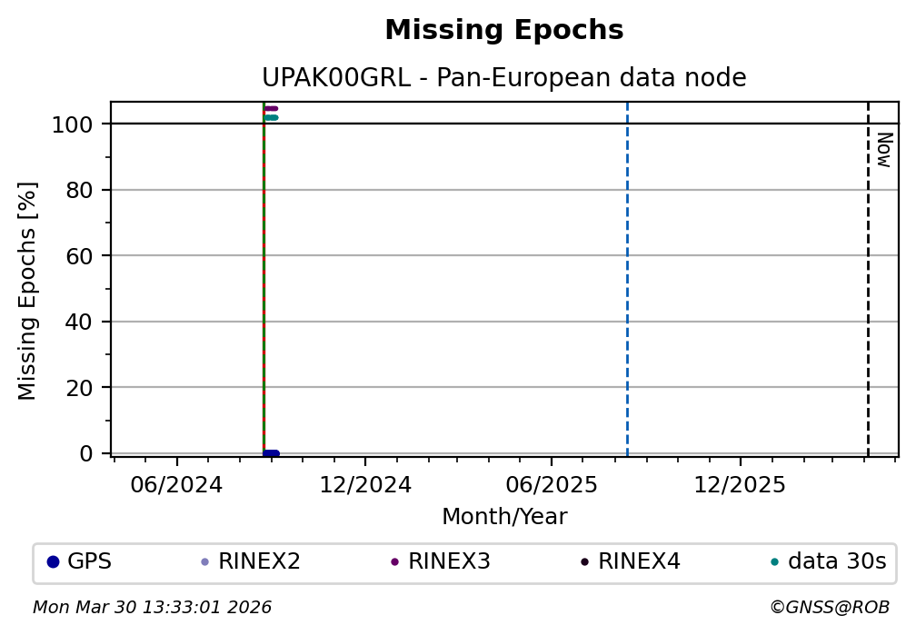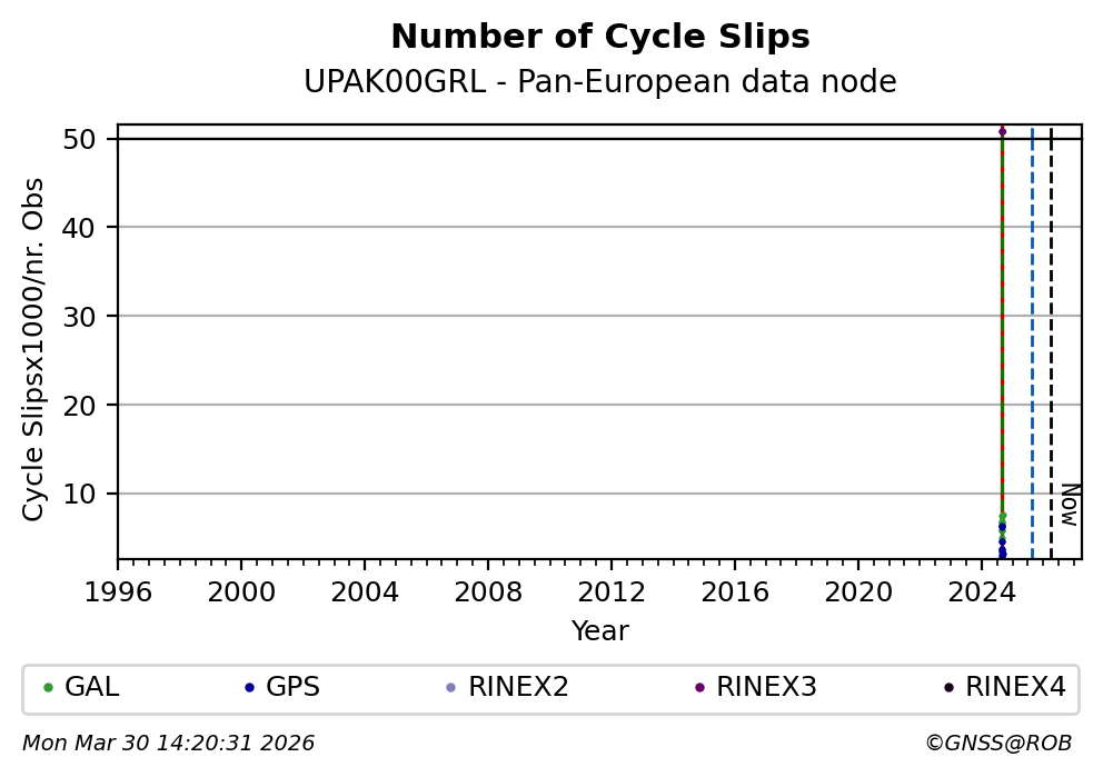 The plots below present the long-term tracking performance of the EPOS-GNSS station UPAK00GRL based on the daily RINEX data available from the Pan-European EPOS-GNSS data node. The data quality metrics have been computed at the data node using the G-Nut/Anubis software.