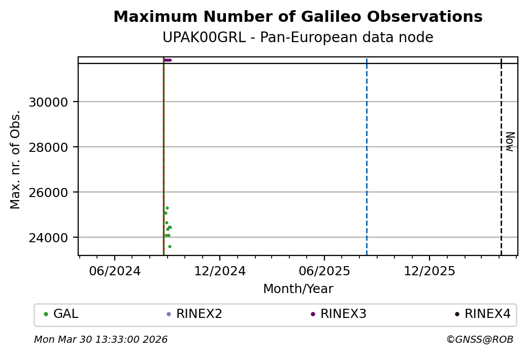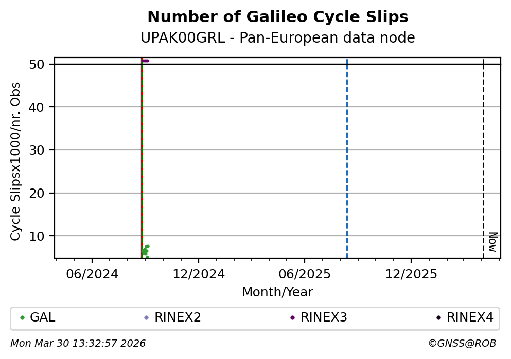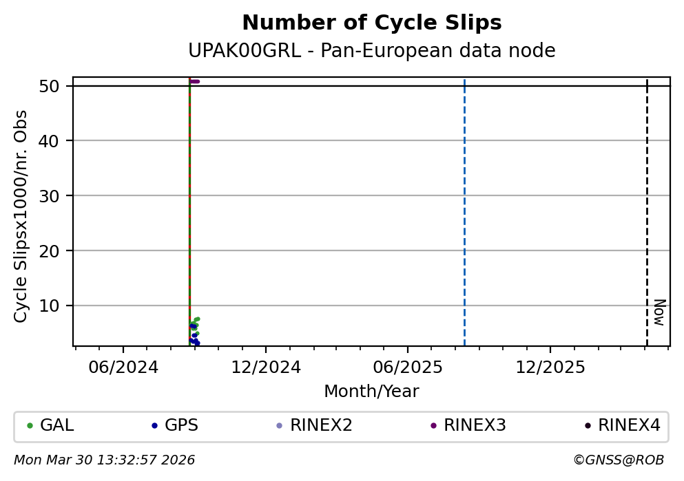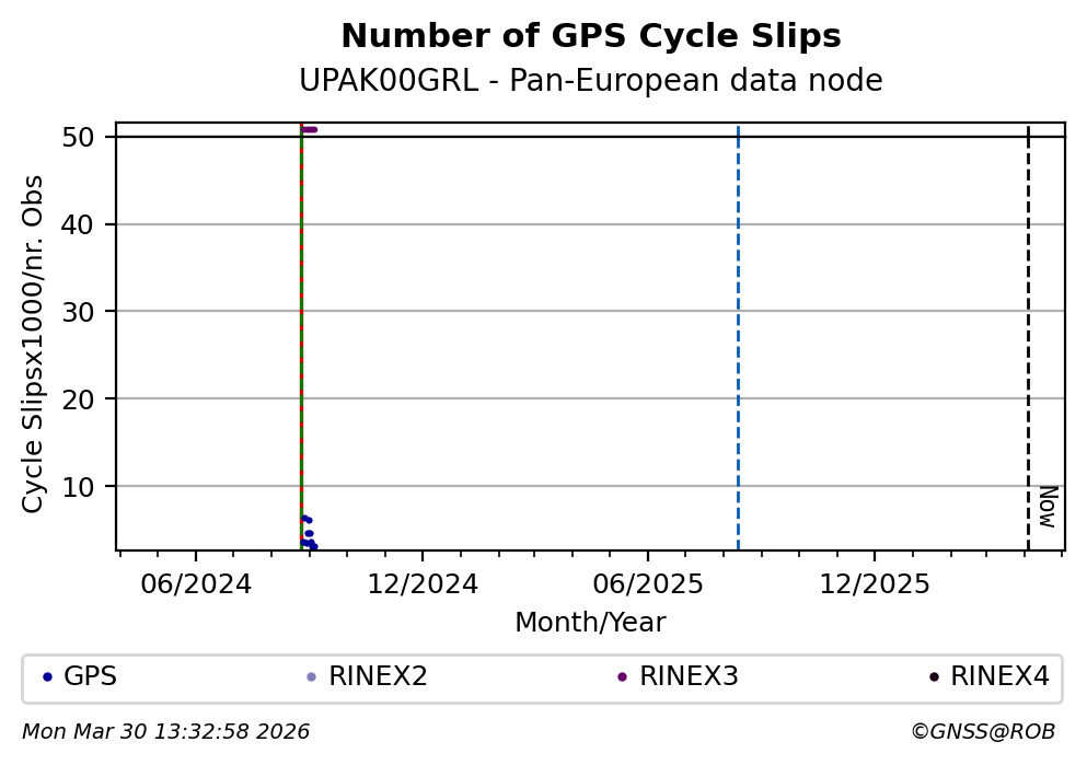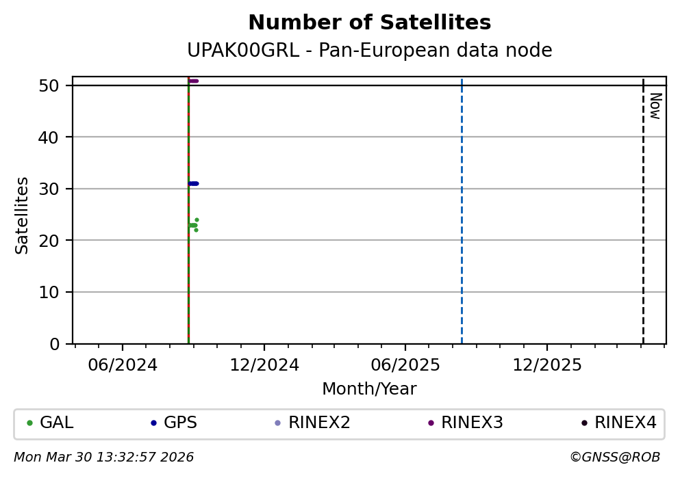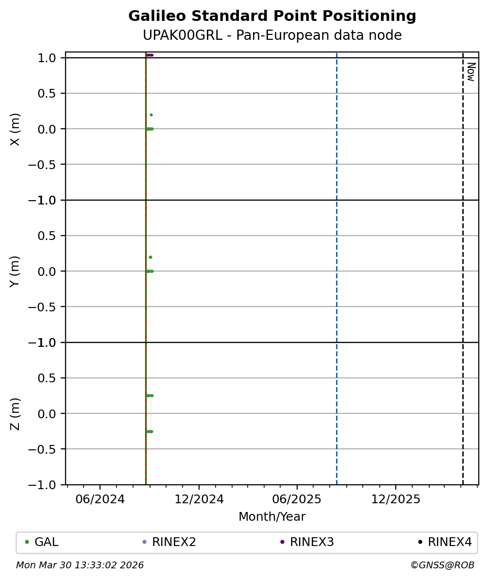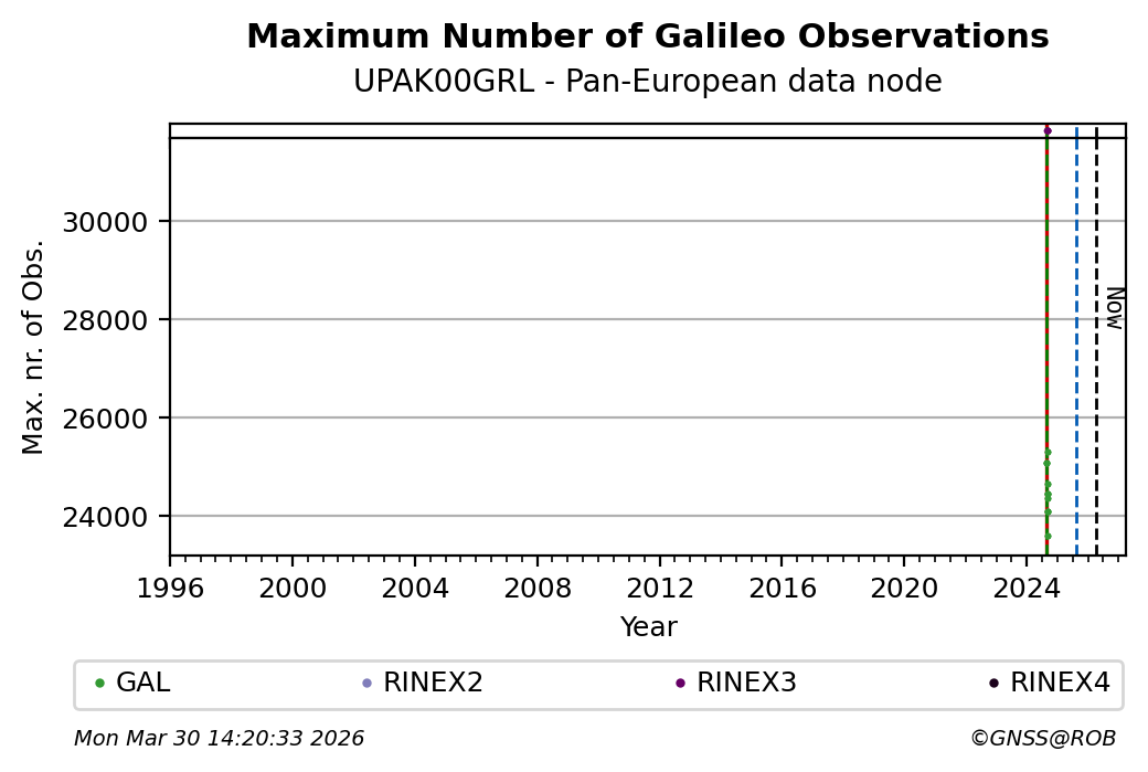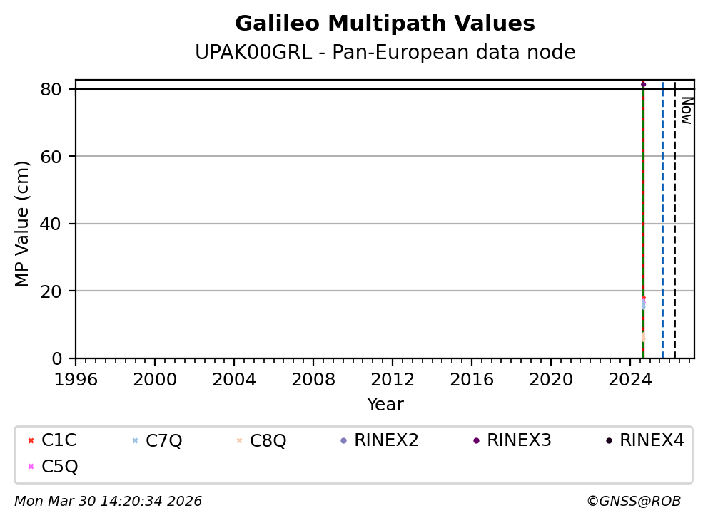 The plots below present the long-term tracking performance of the EPOS-GNSS station UPAK00GRL based on the daily RINEX data available from the Pan-European EPOS-GNSS data node. The data quality metrics have been computed at the data node using the G-Nut/Anubis software.