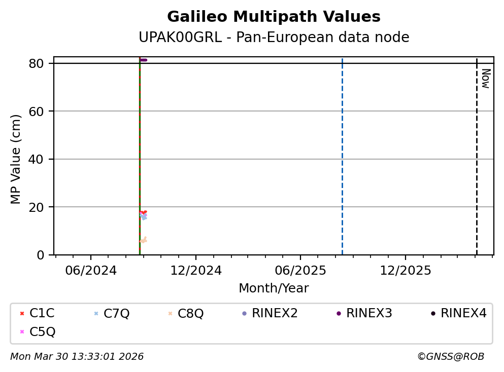 These plots display the daily mean of code multipath per frequency band and satellite constellation. Code multipath statistics are calculated for all pseudorange codes of all GNSS satellites providing dual-frequency carrier-phase observations. The code multipath characterizes the quality of the observed signal and the site environment.