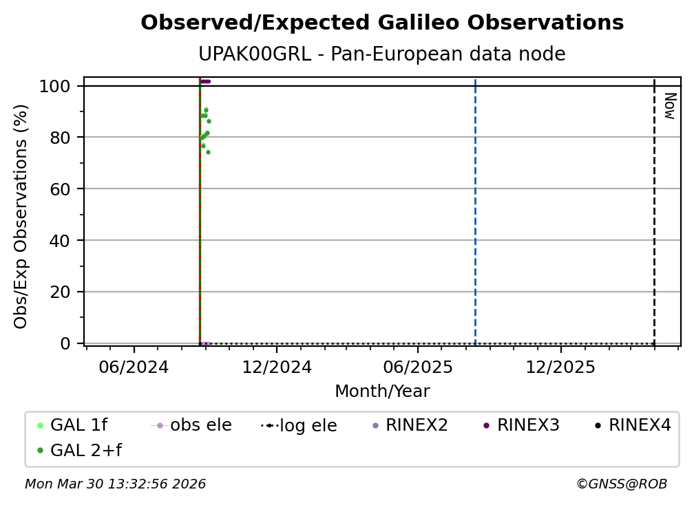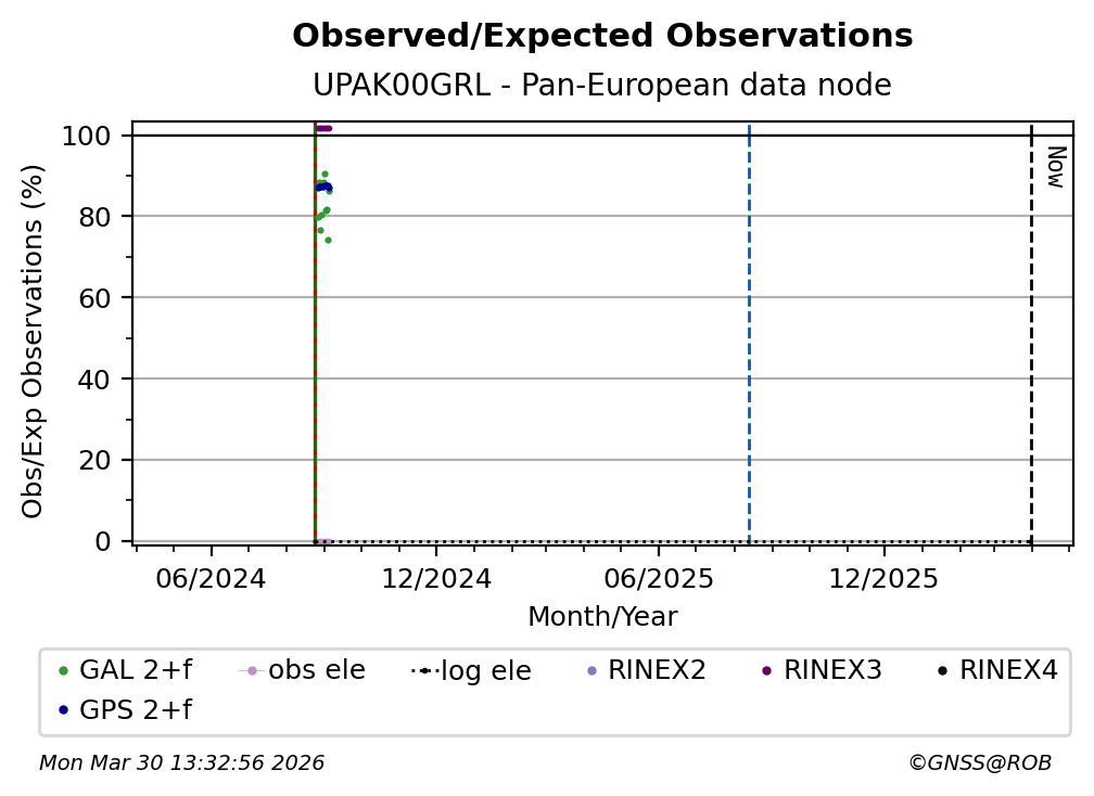 The percentage corresponds, for each constellation tracked by the station, to the ratio of the number of observations in the daily RINEX file with respect to the number of expected observations: