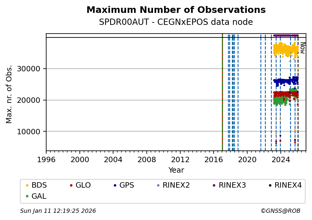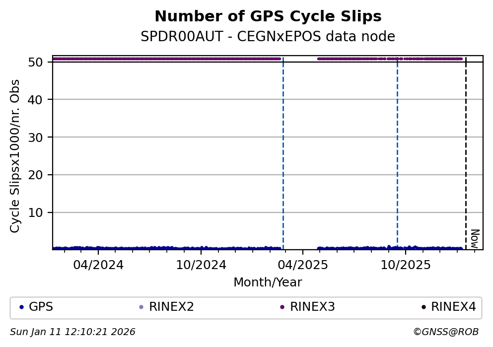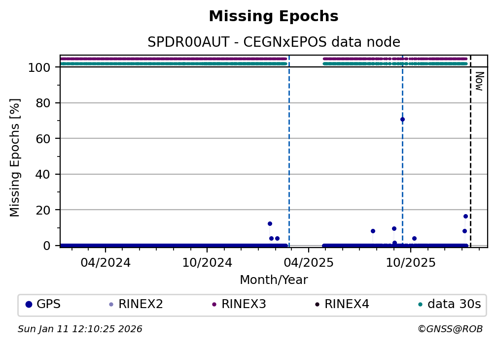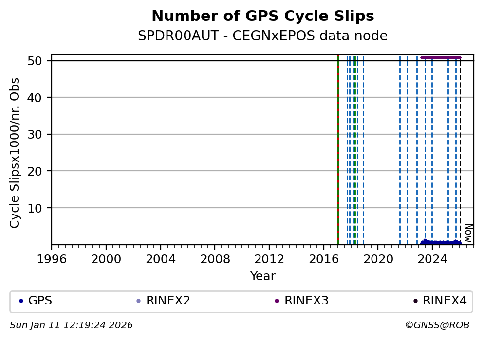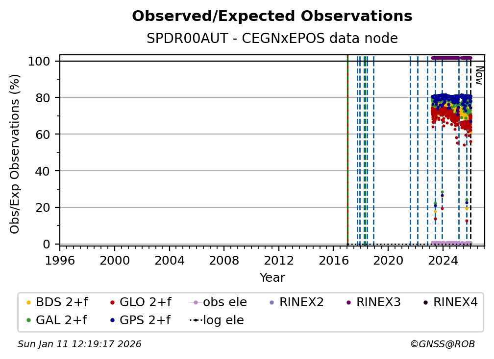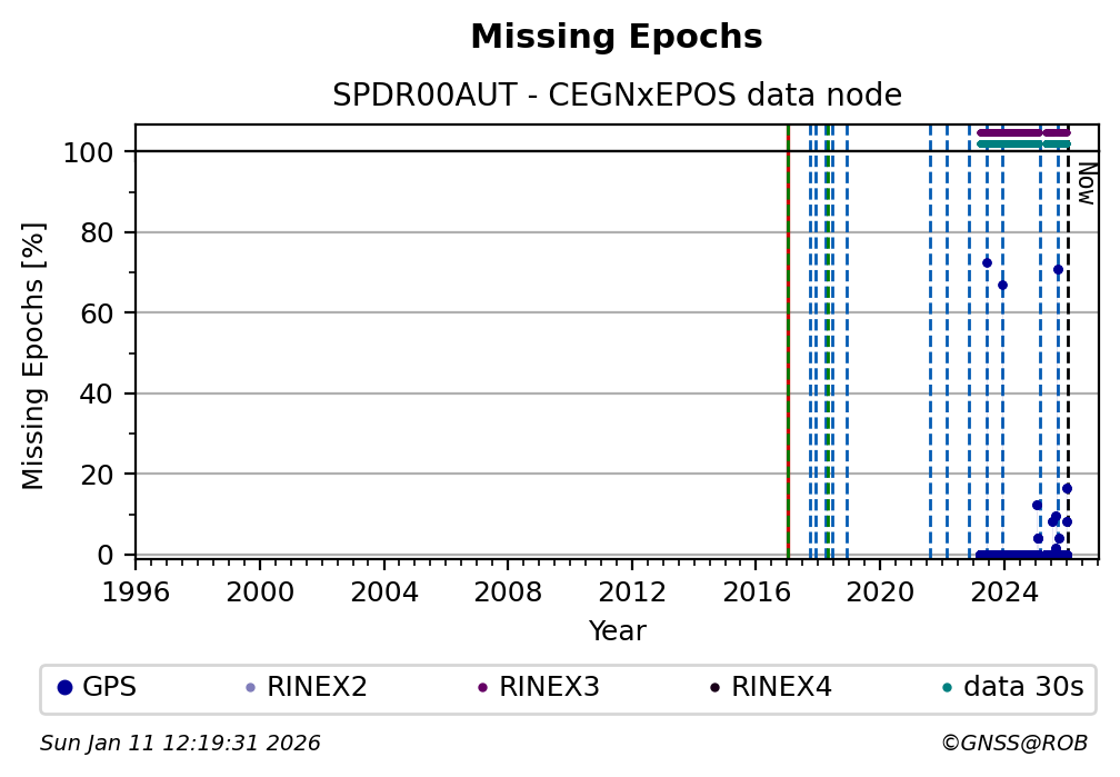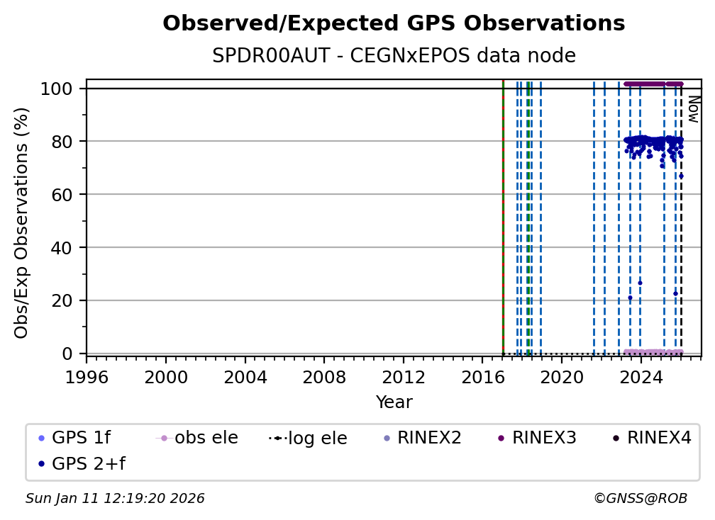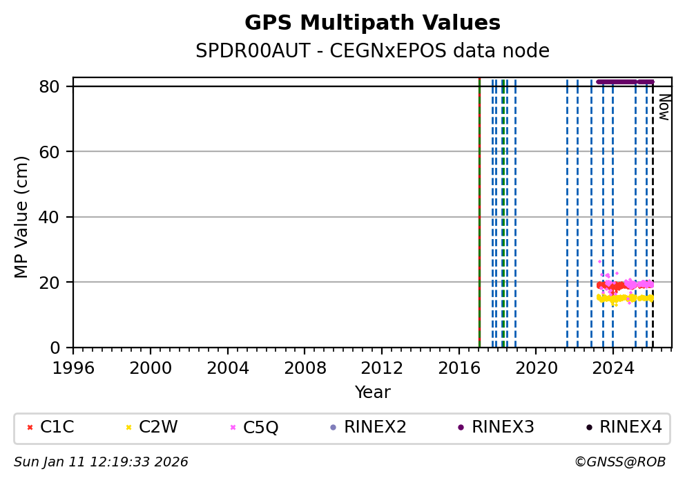 The plots below present the long-term tracking performance of the EPOS-GNSS station SPDR00AUT based on the daily RINEX data available from the CEGNxEPOS EPOS-GNSS data node. The data quality metrics have been computed at the data node using the G-Nut/Anubis software.