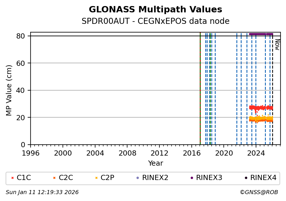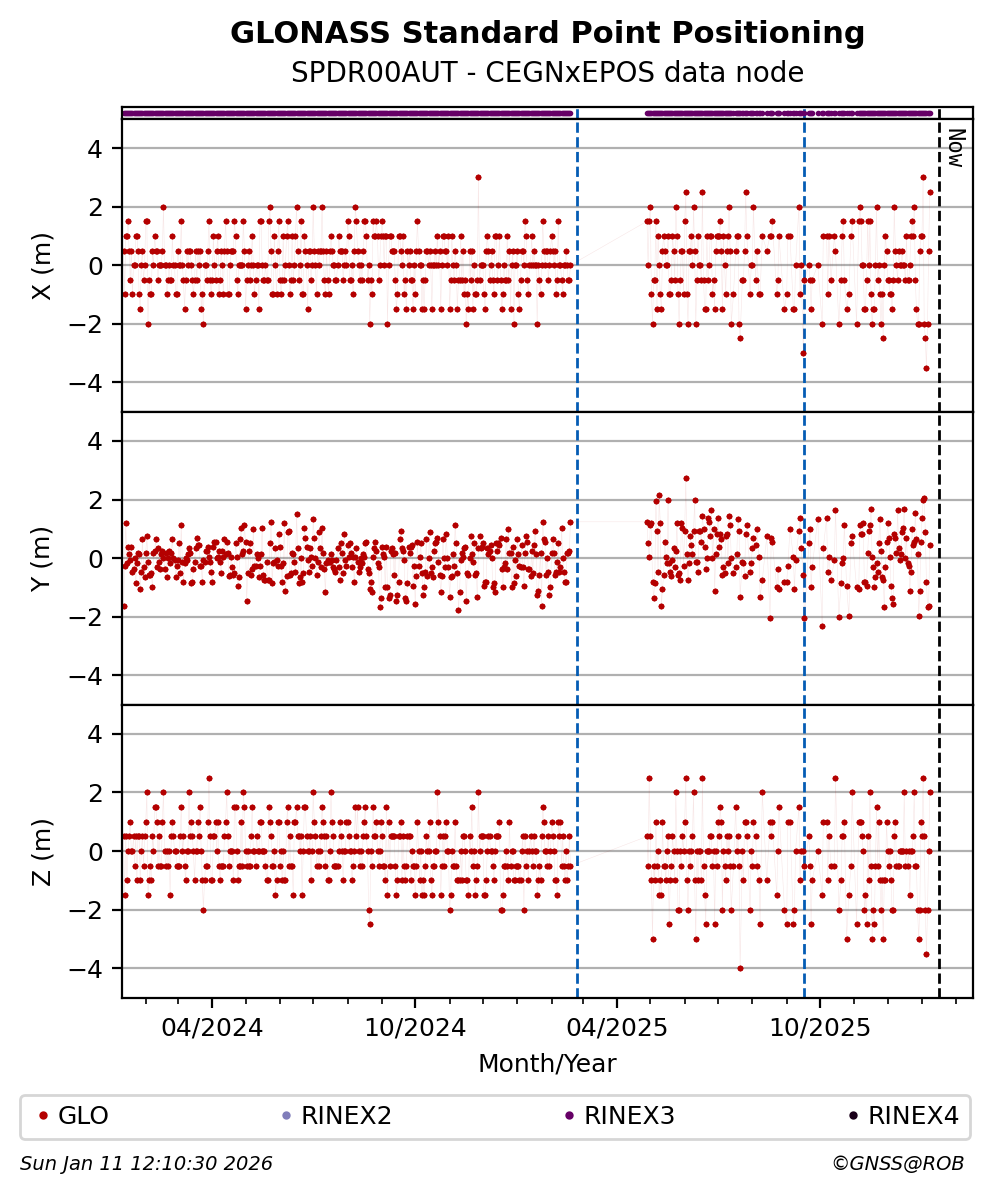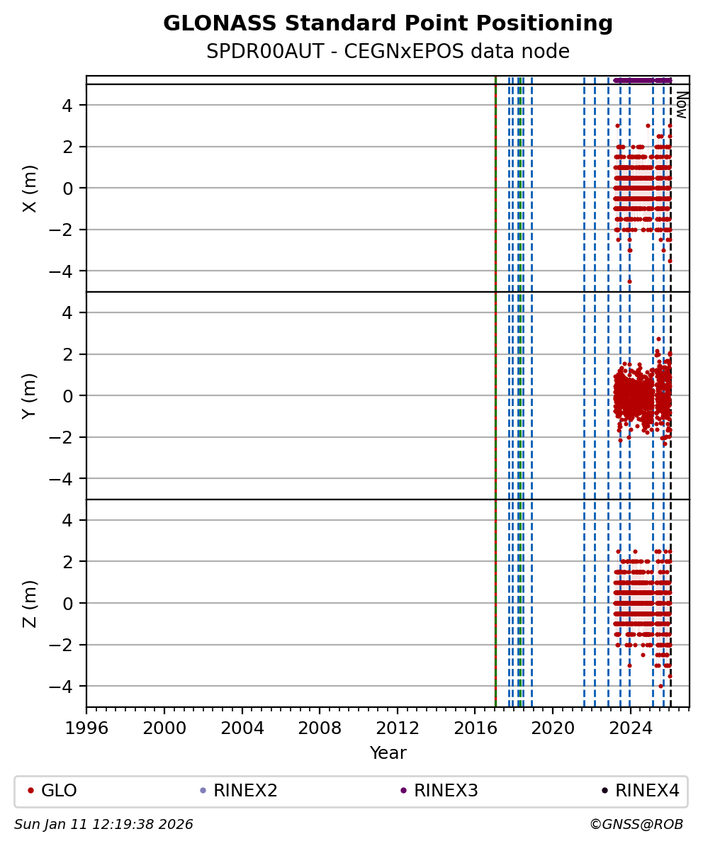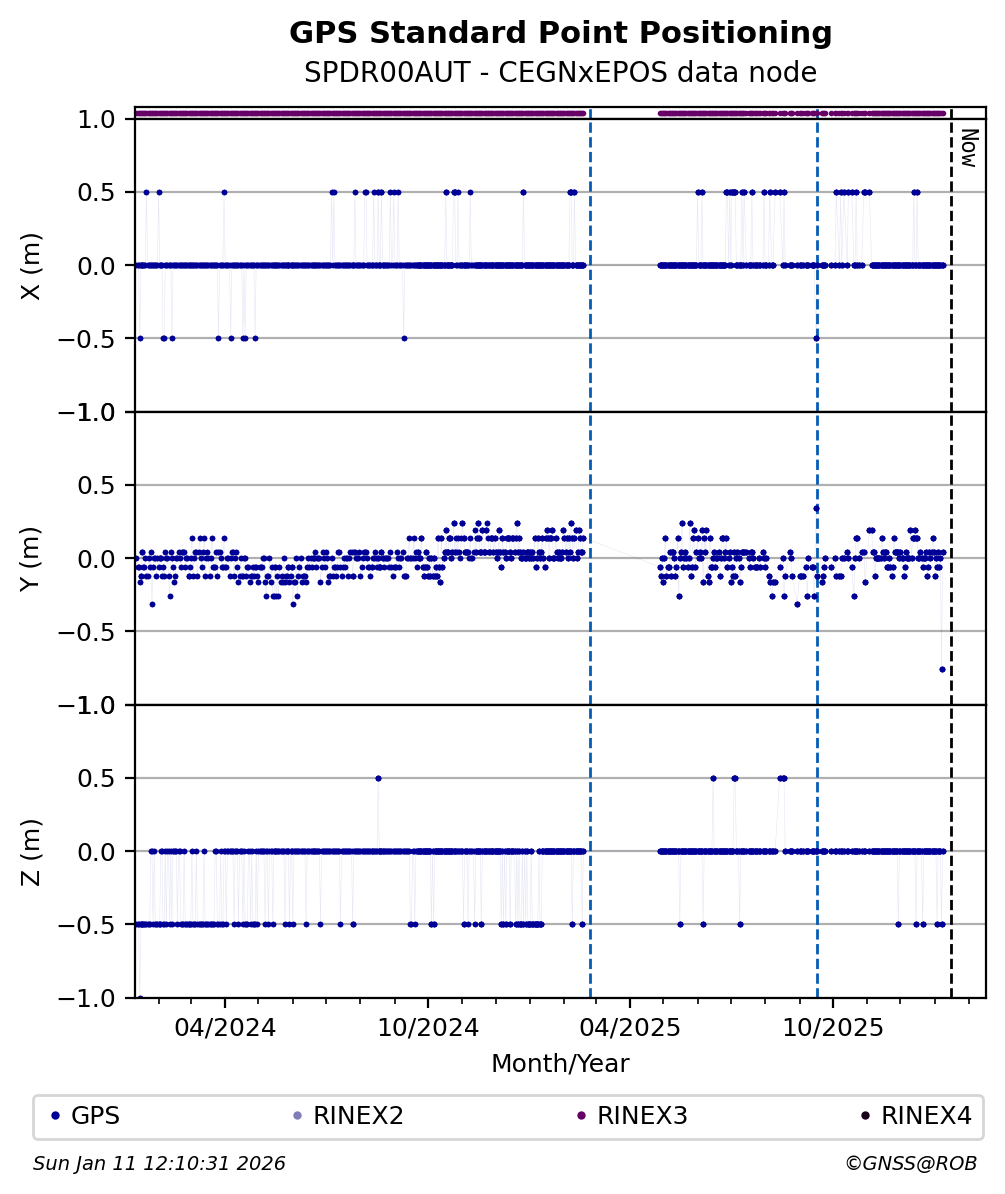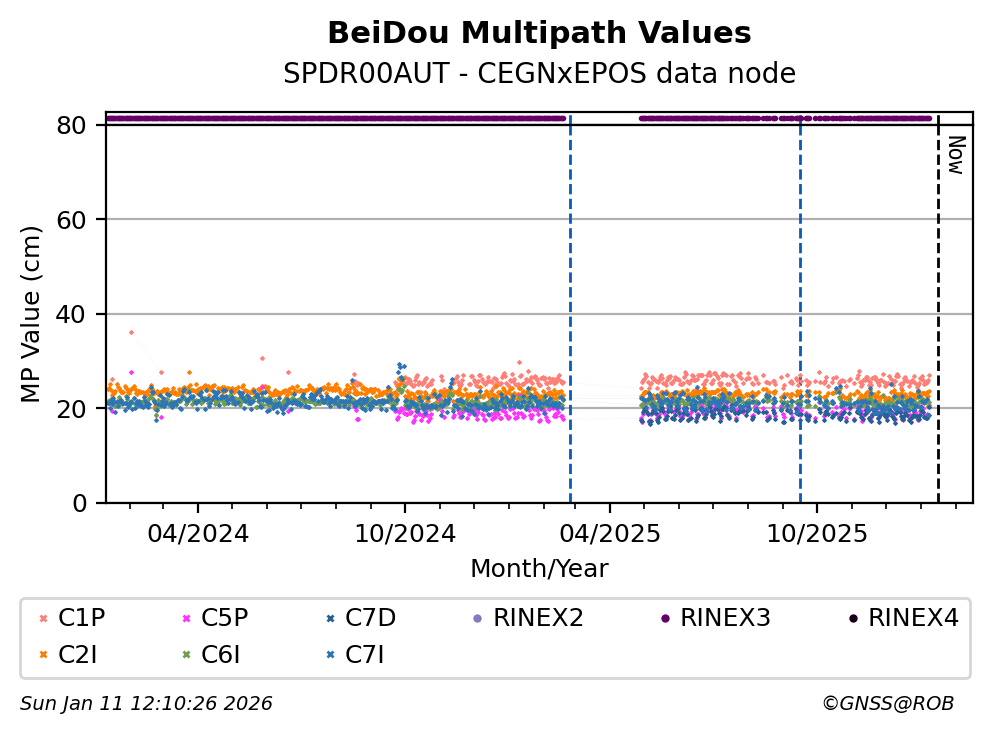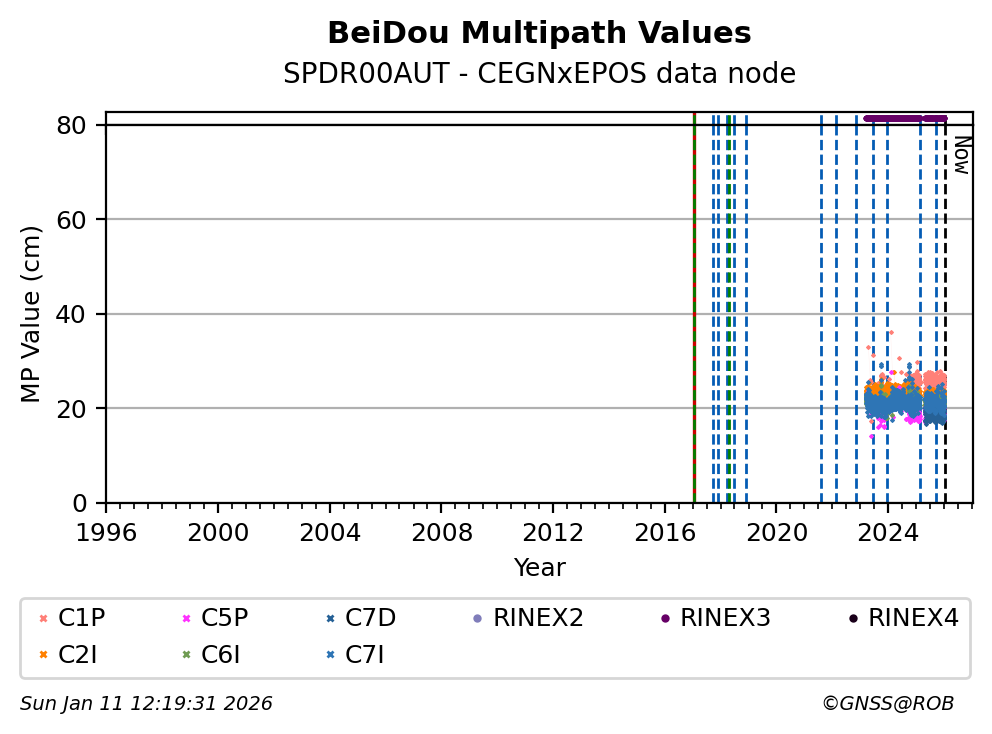 The plots below present the long-term tracking performance of the EPOS-GNSS station SPDR00AUT based on the daily RINEX data available from the CEGNxEPOS EPOS-GNSS data node. The data quality metrics have been computed at the data node using the G-Nut/Anubis software.