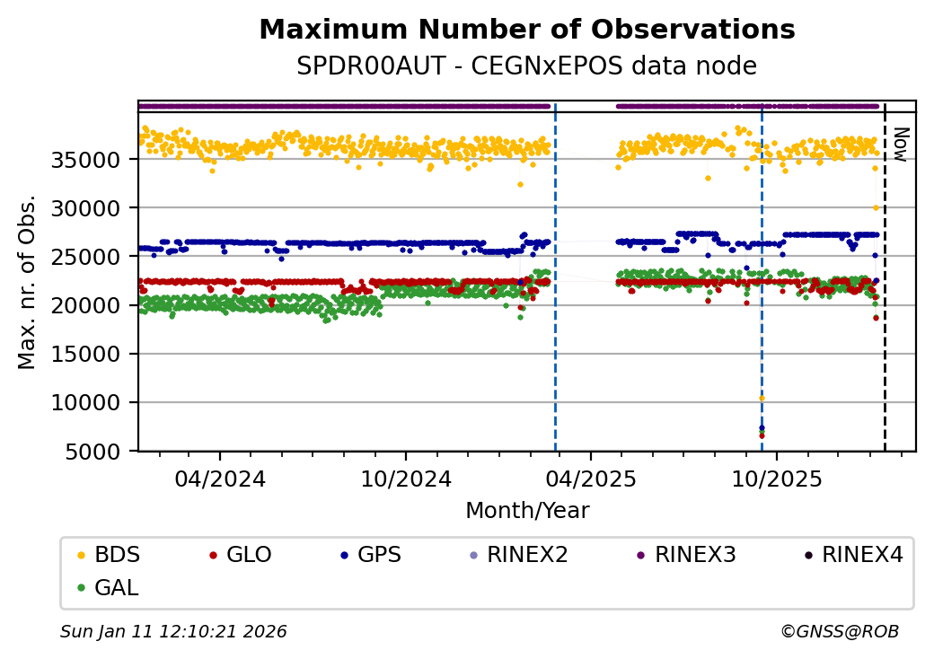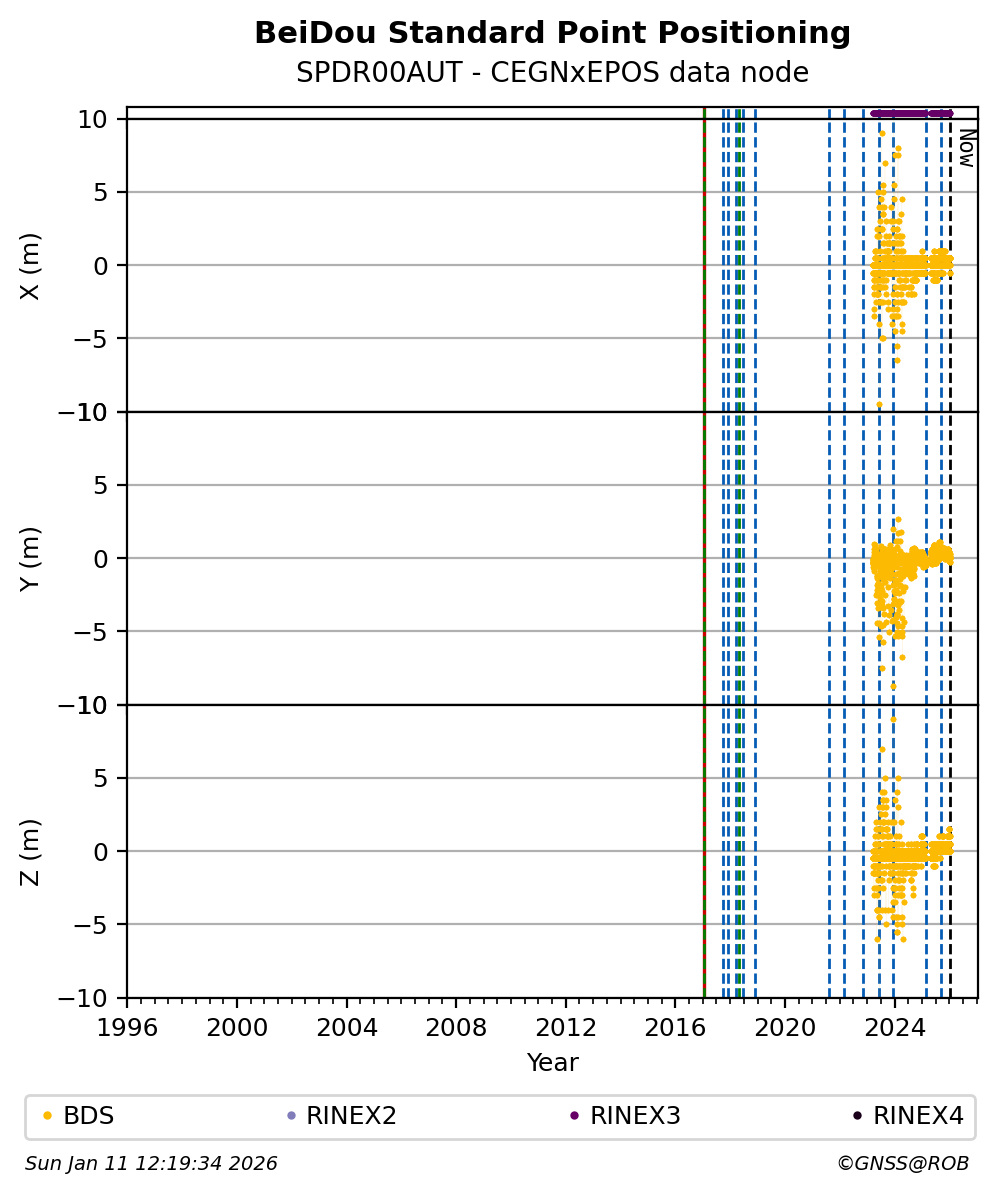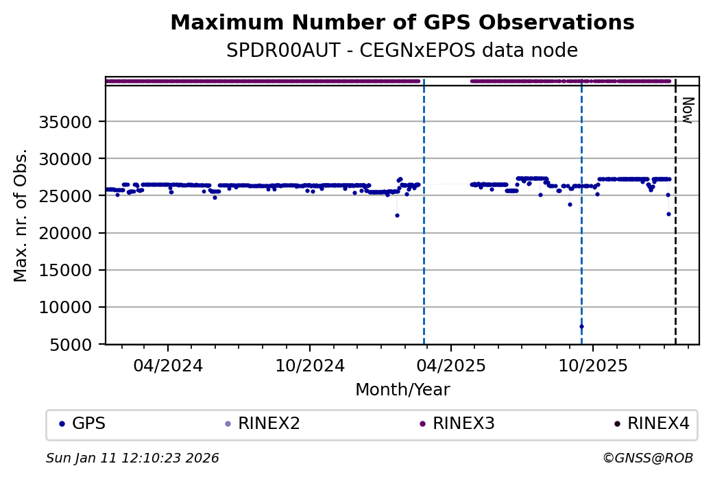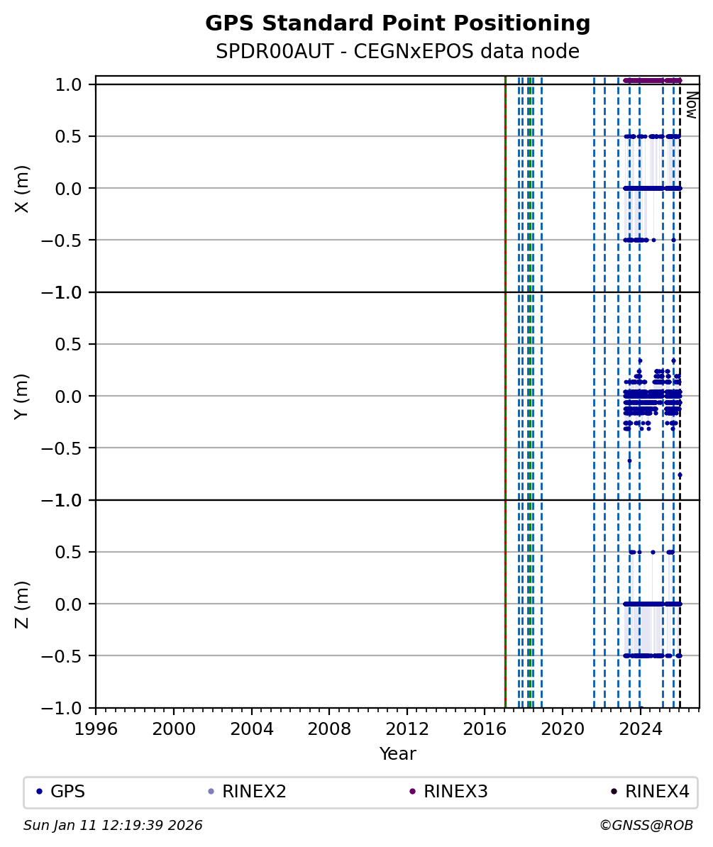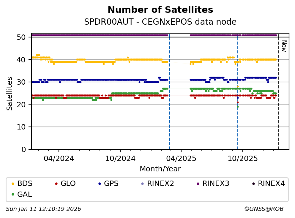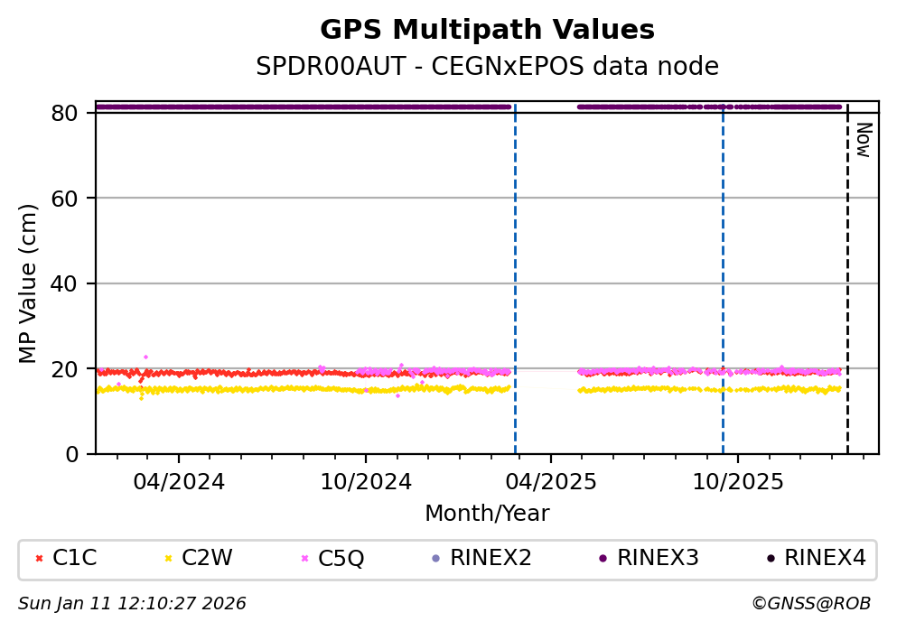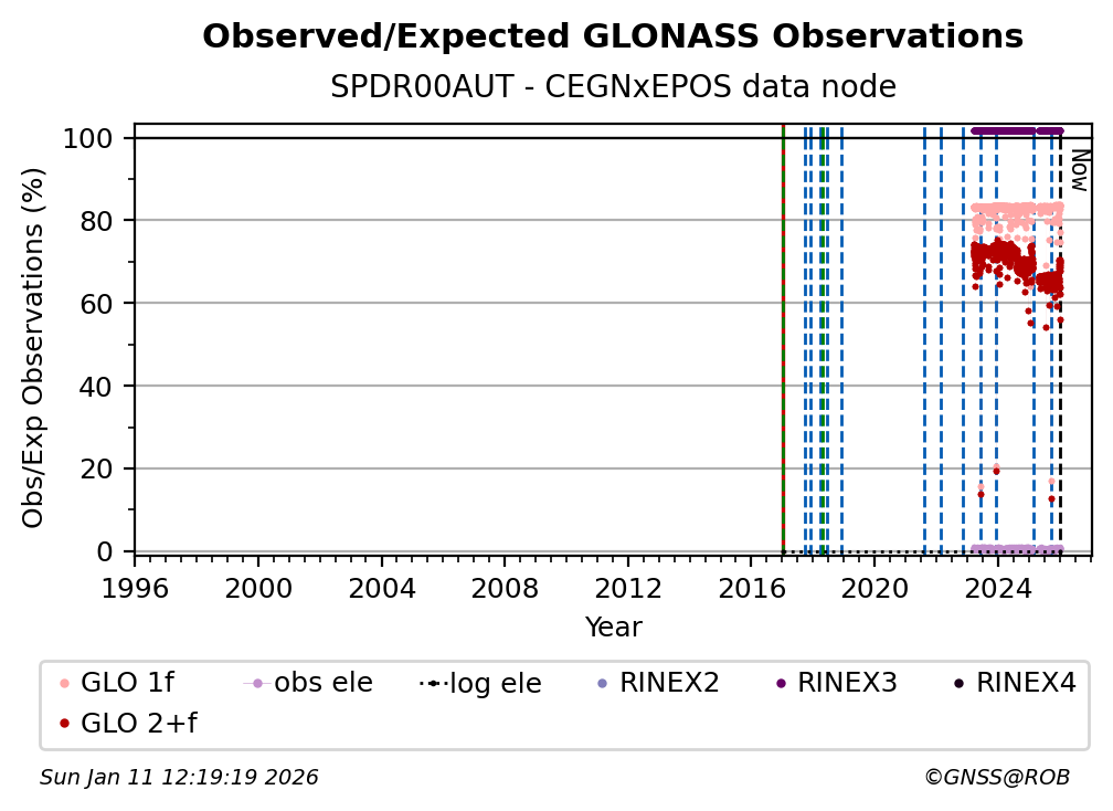 The plots below present the long-term tracking performance of the EPOS-GNSS station SPDR00AUT based on the daily RINEX data available from the CEGNxEPOS EPOS-GNSS data node. The data quality metrics have been computed at the data node using the G-Nut/Anubis software.
