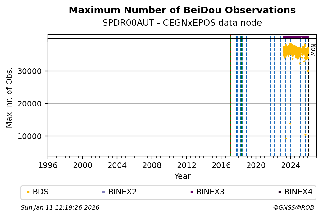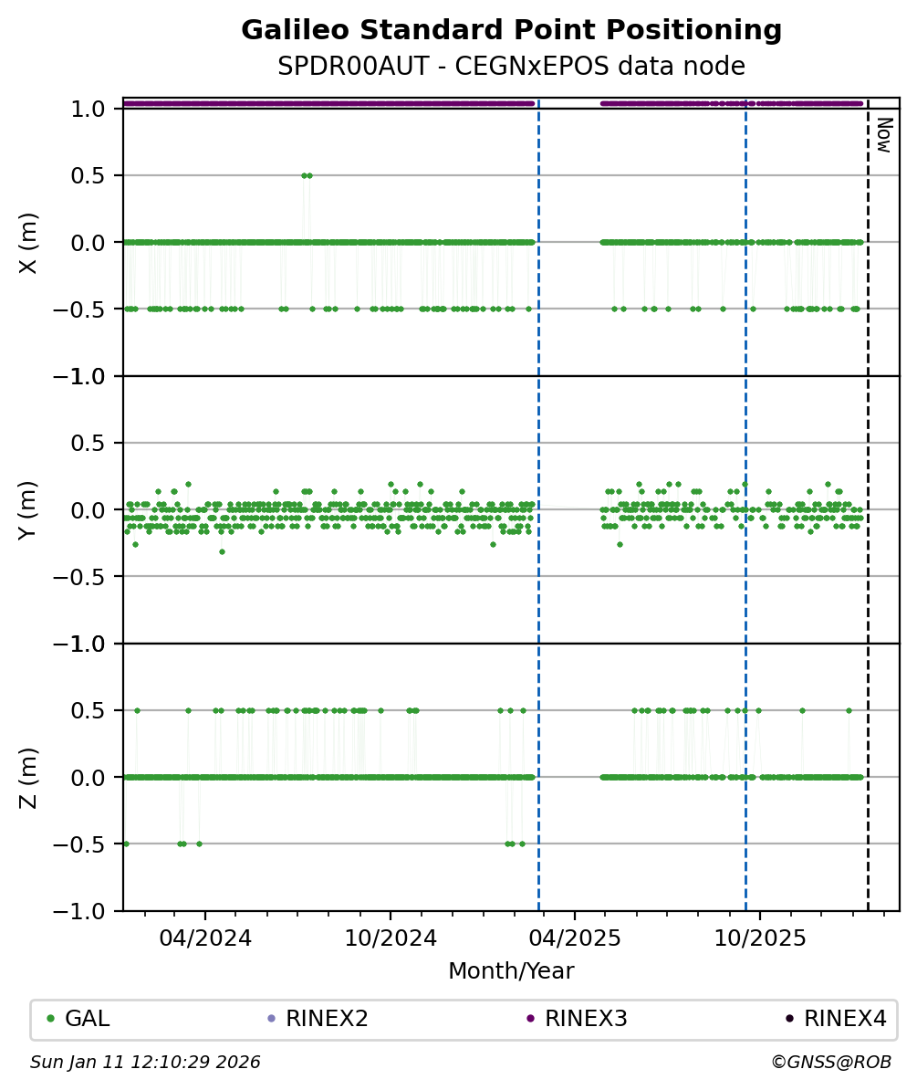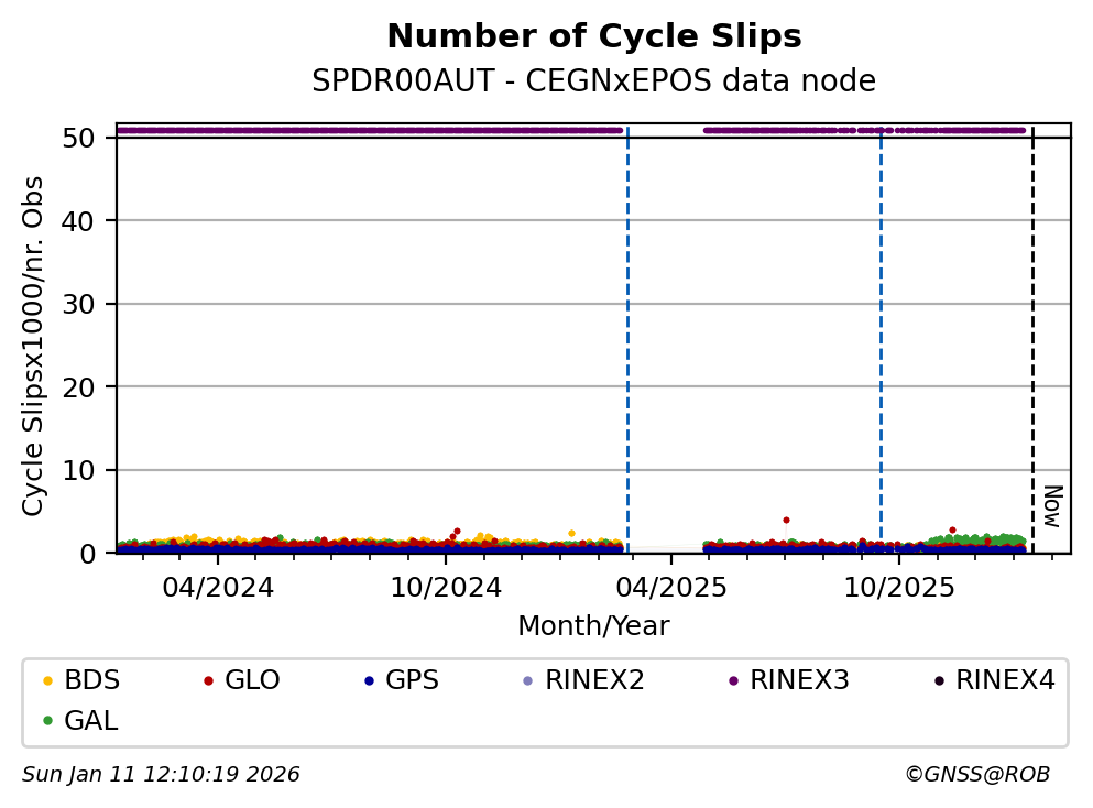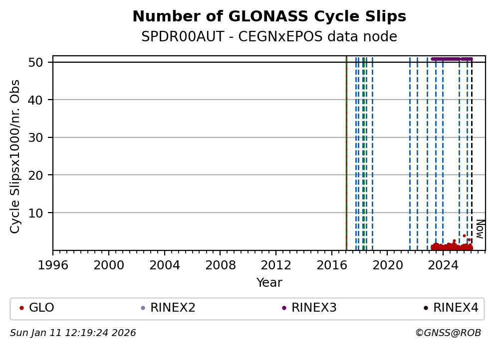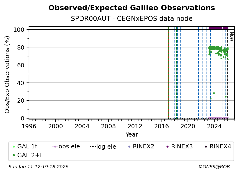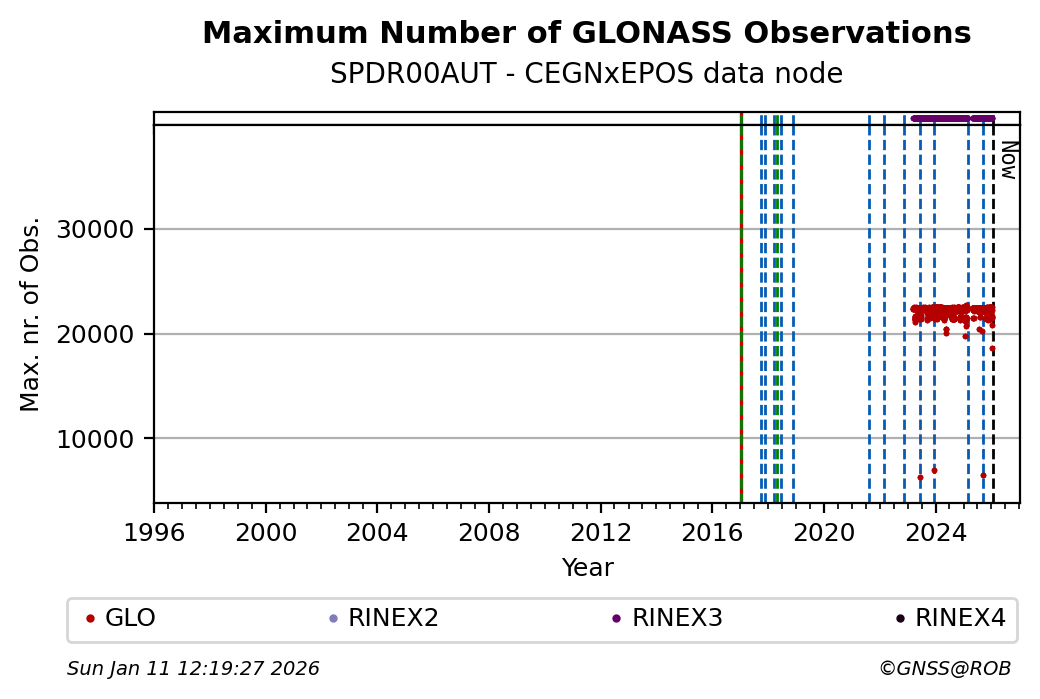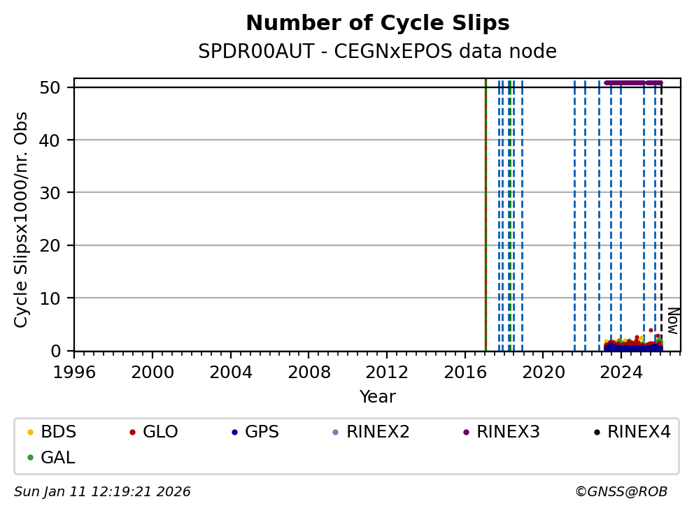 The plots below present the long-term tracking performance of the EPOS-GNSS station SPDR00AUT based on the daily RINEX data available from the CEGNxEPOS EPOS-GNSS data node. The data quality metrics have been computed at the data node using the G-Nut/Anubis software.