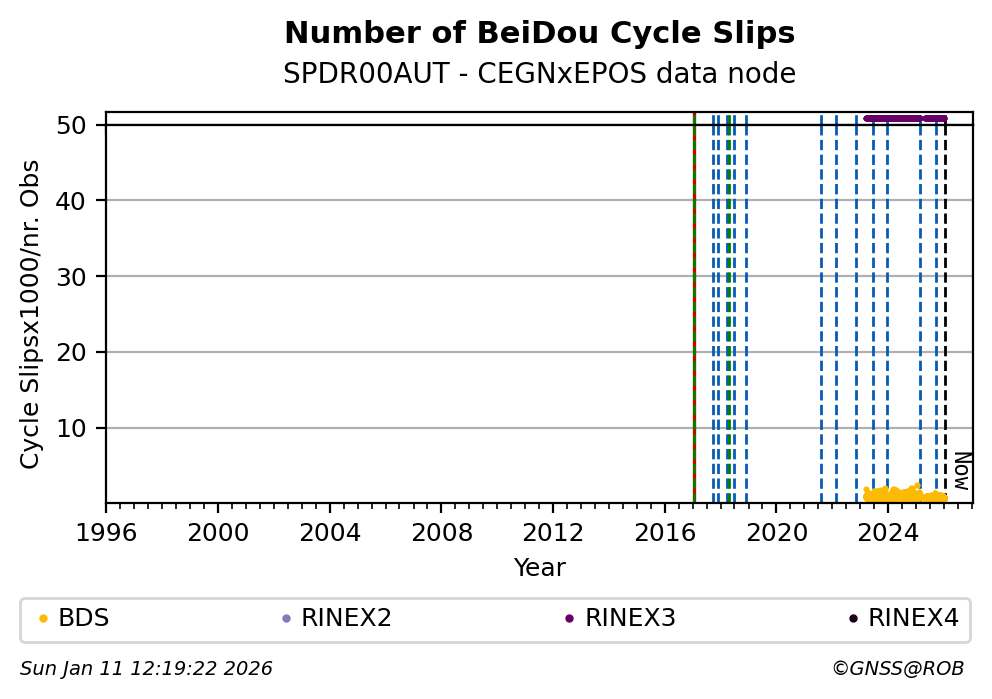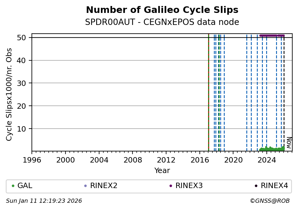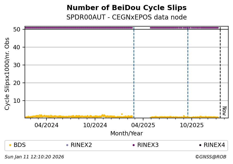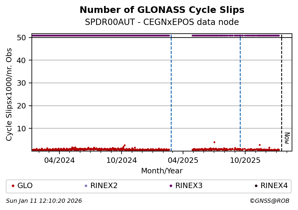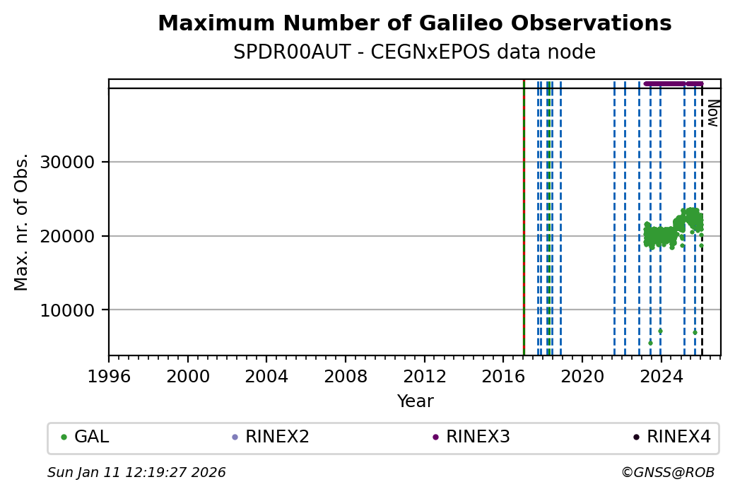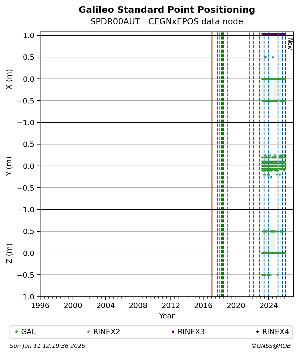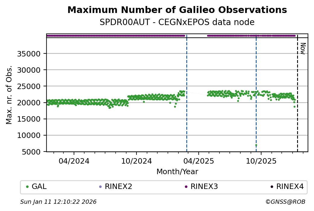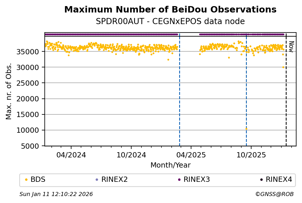 The plots below present the long-term tracking performance of the EPOS-GNSS station SPDR00AUT based on the daily RINEX data available from the CEGNxEPOS EPOS-GNSS data node. The data quality metrics have been computed at the data node using the G-Nut/Anubis software.