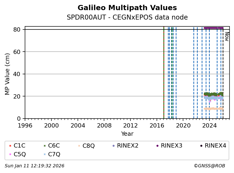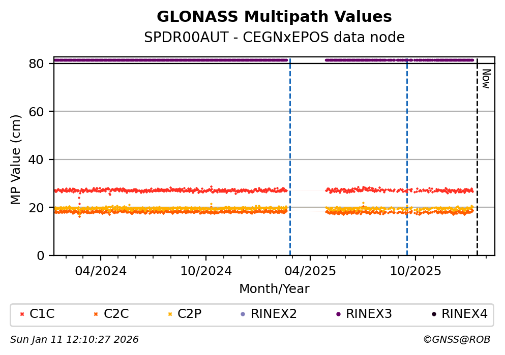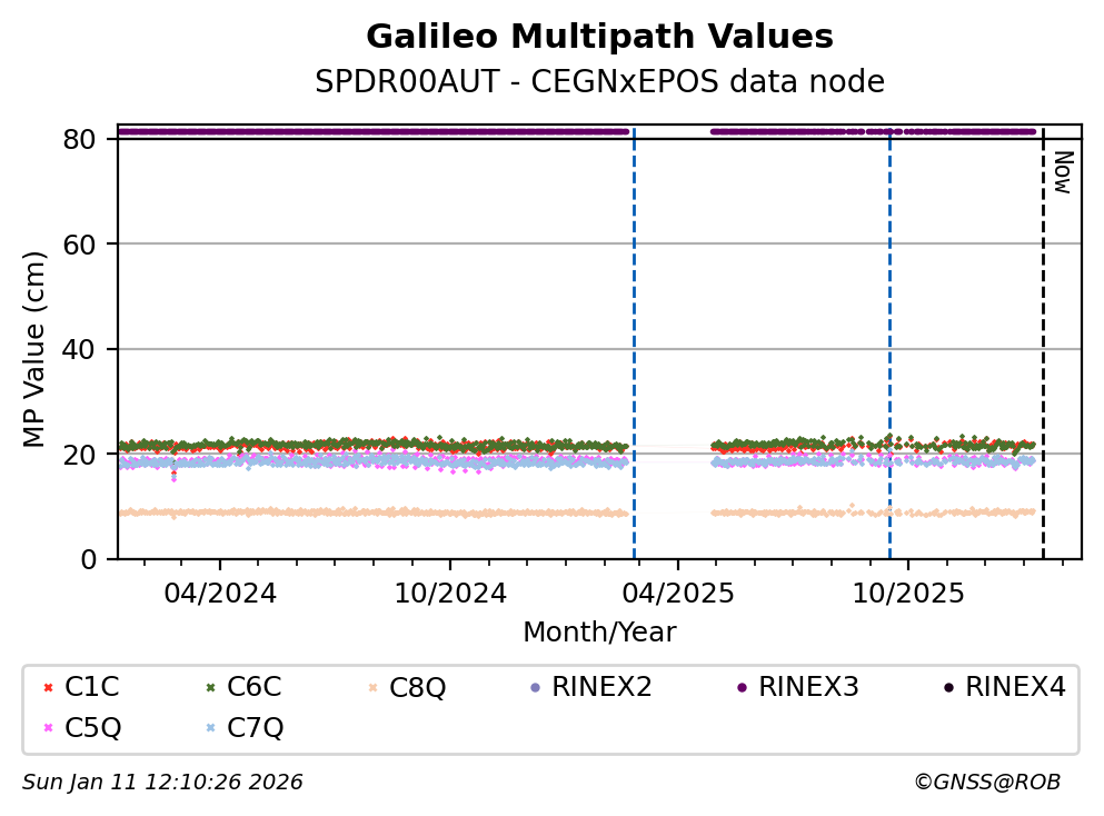 These plots display the daily mean of code multipath per frequency band and satellite constellation. Code multipath statistics are calculated for all pseudorange codes of all GNSS satellites providing dual-frequency carrier-phase observations. The code multipath characterizes the quality of the observed signal and the site environment.