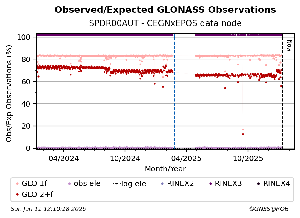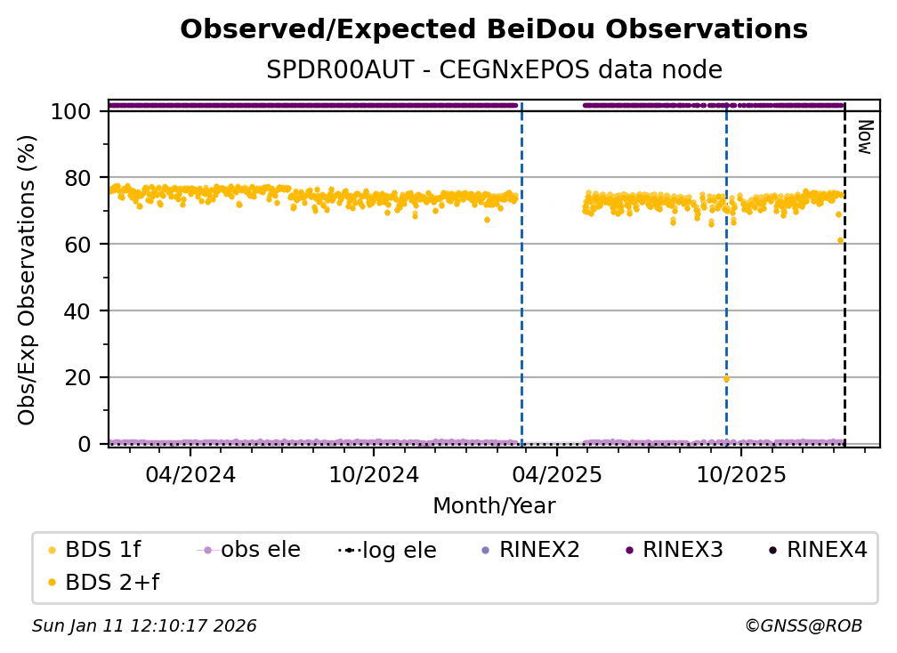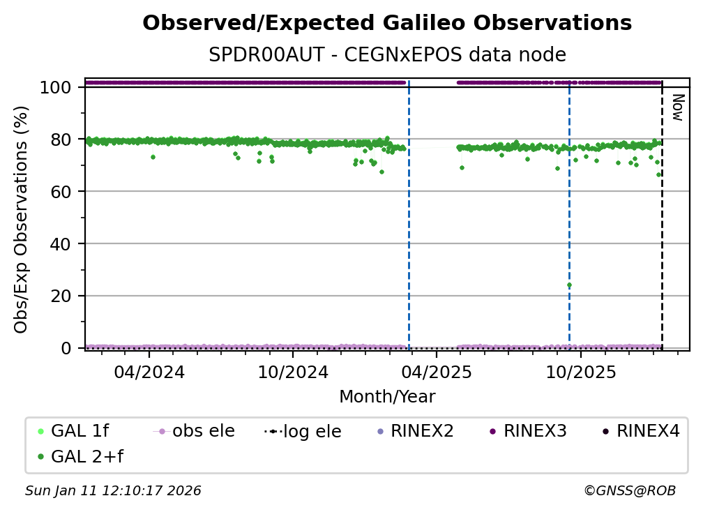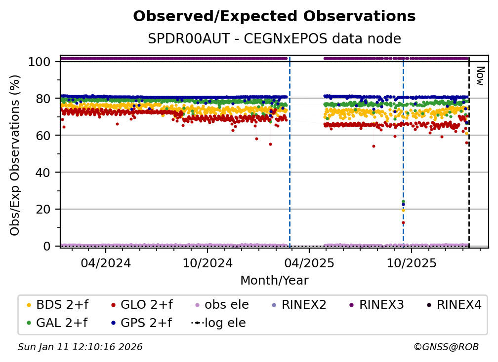 The percentage corresponds, for each constellation tracked by the station, to the ratio of the number of observations in the daily RINEX file with respect to the number of expected observations: